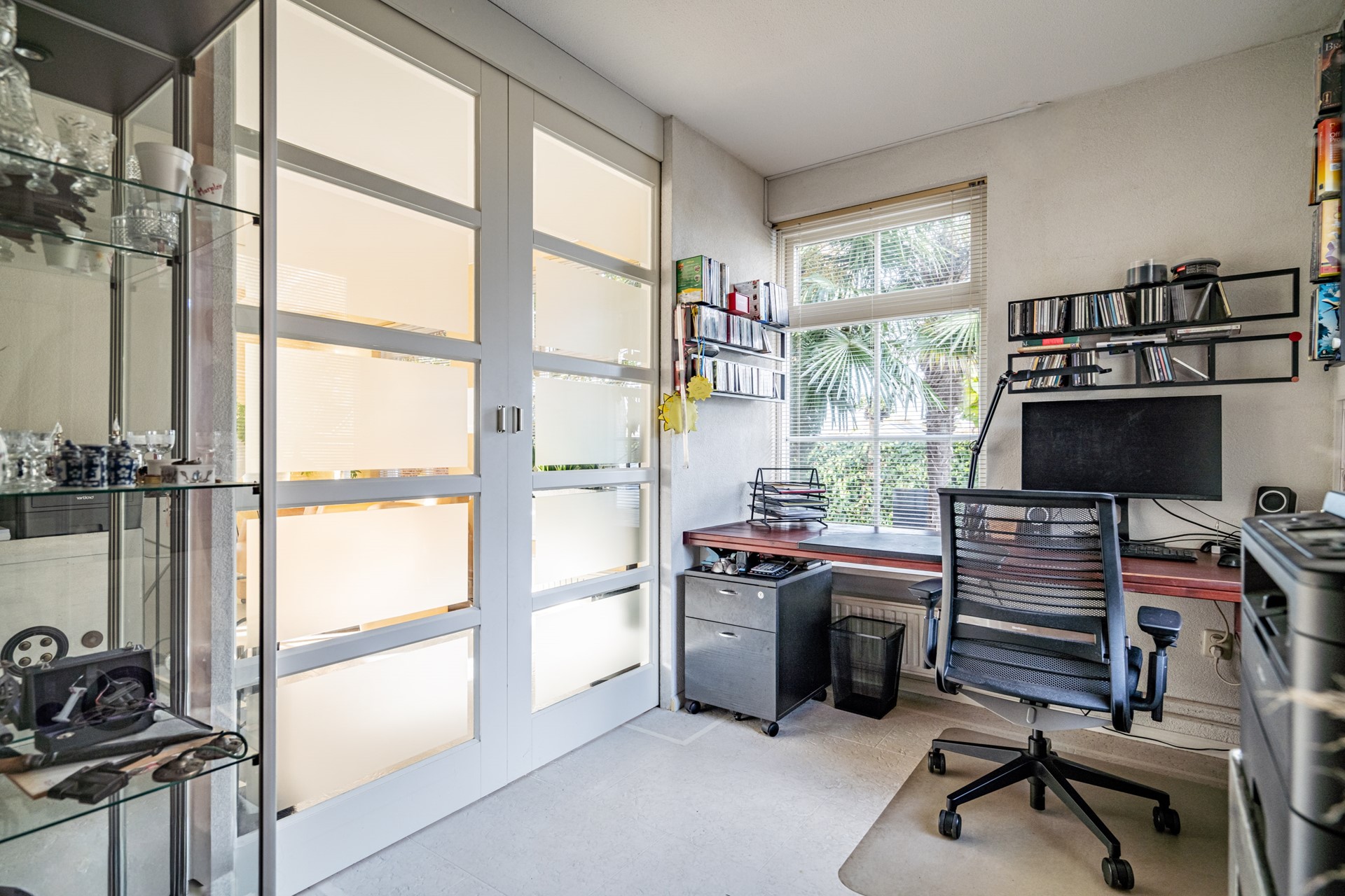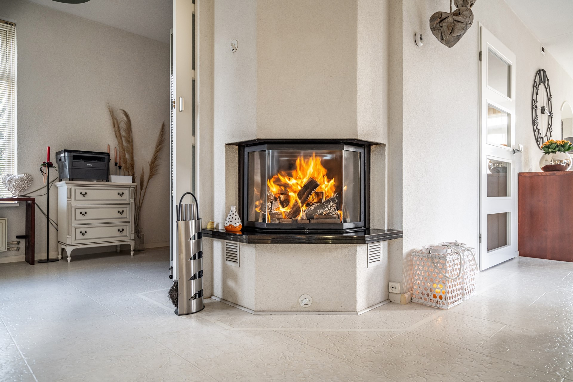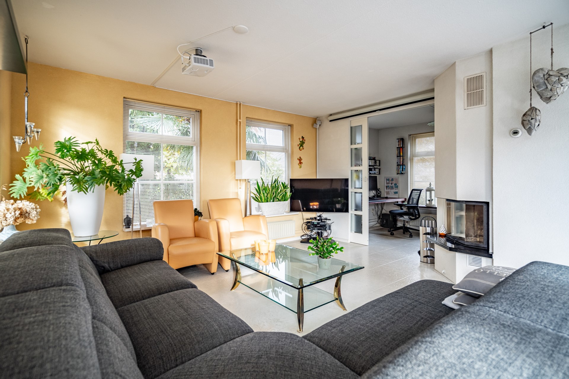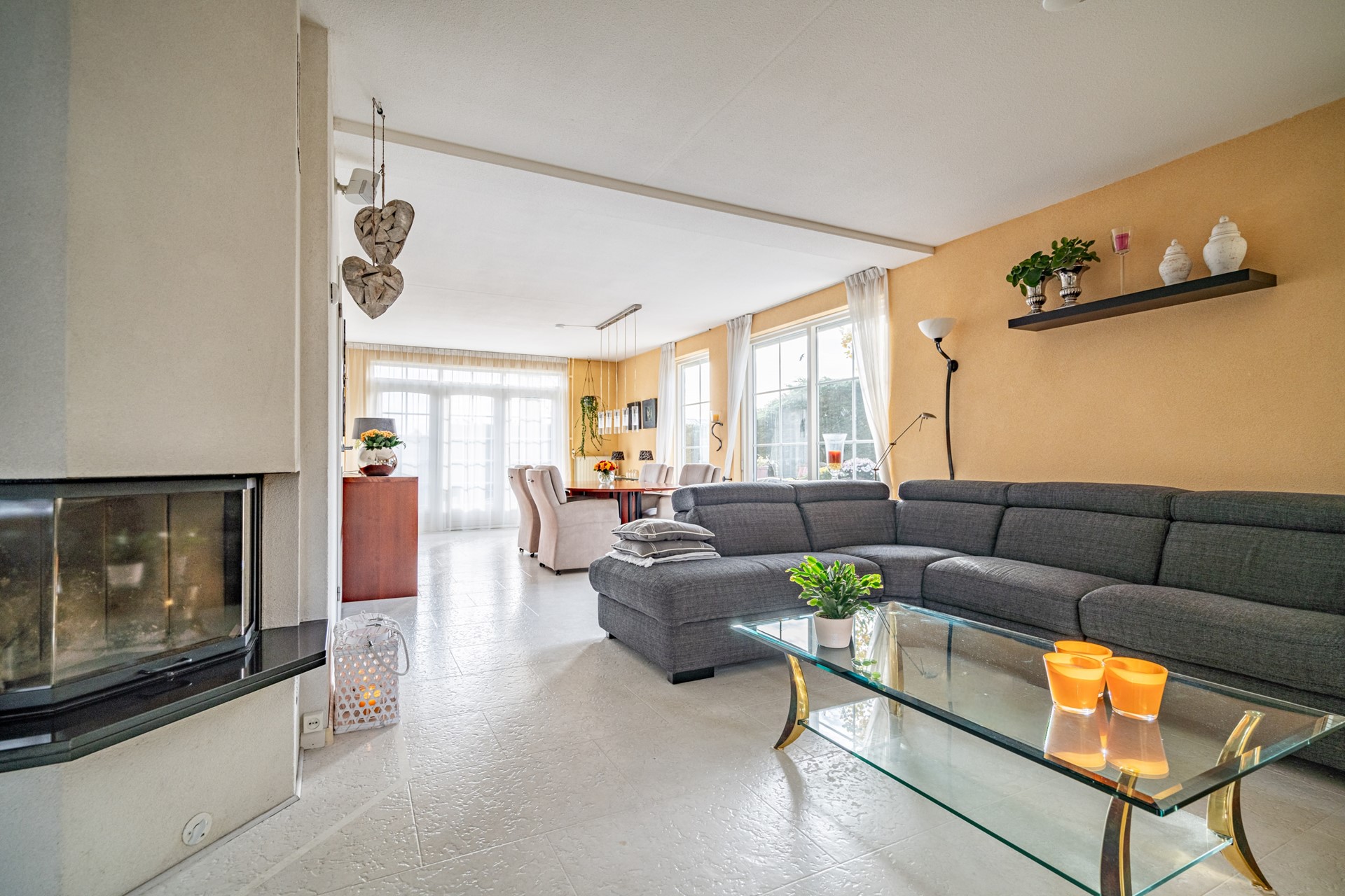 De woonkamer ademt ruimte en comfort dankzij de grote raampartijen, spachtelputz wandafwerking en een warme kurkvloer. De openslaande deuren bieden toegang tot de tuin. De lichte zithoek is voorzien van een sfeervolle open haard, ideaal voor lange winteravonden. Aan de voorzijde is een praktische kantoorruimte ingericht: perfect voor thuiswerkers.