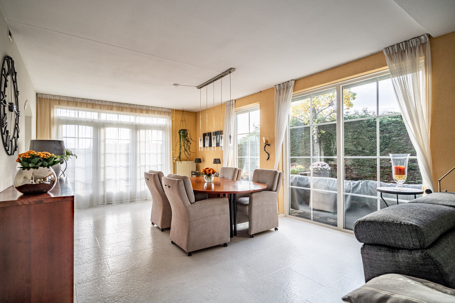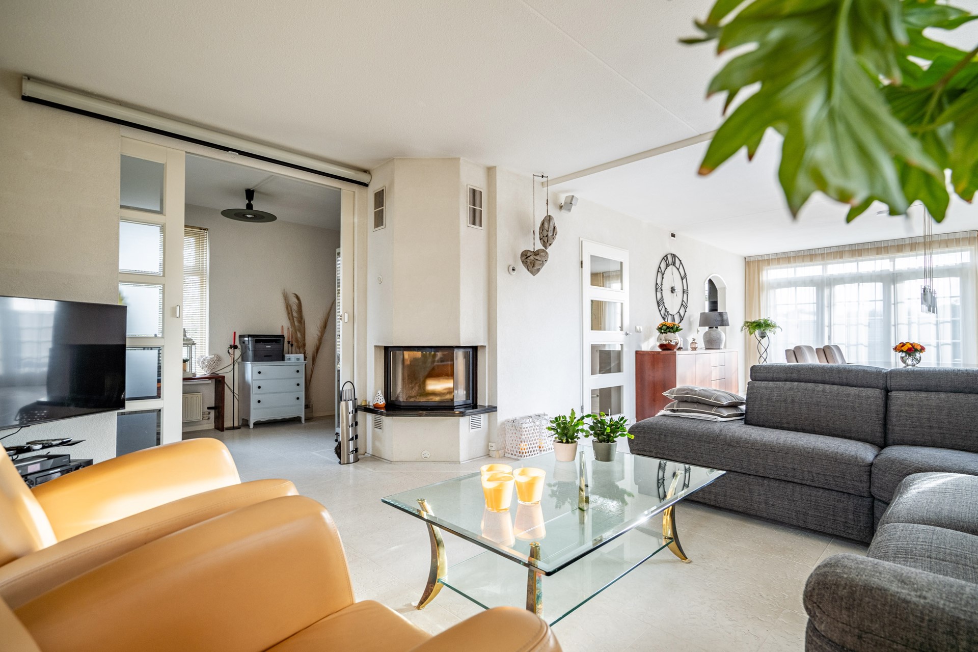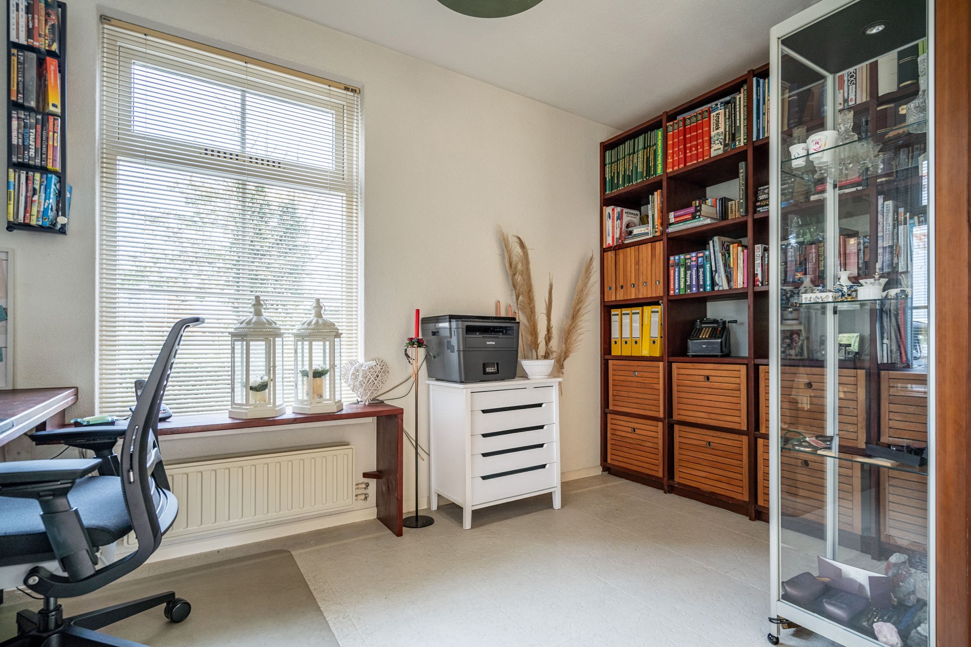 De woonkamer ademt ruimte en comfort dankzij de grote raampartijen, spachtelputz wandafwerking en een warme kurkvloer. De openslaande deuren bieden toegang tot de tuin. De lichte zithoek is voorzien van een sfeervolle open haard, ideaal voor lange winteravonden. Aan de voorzijde is een praktische kantoorruimte ingericht: perfect voor thuiswerkers.
