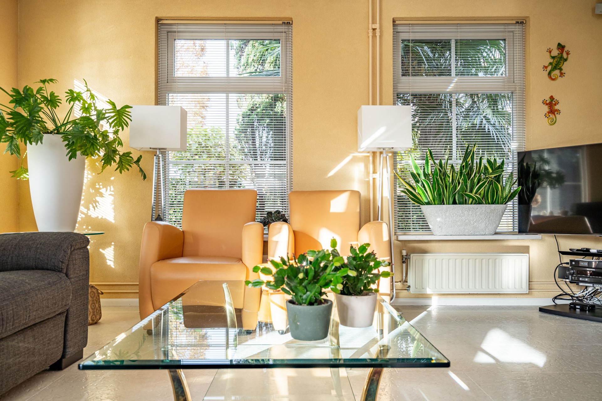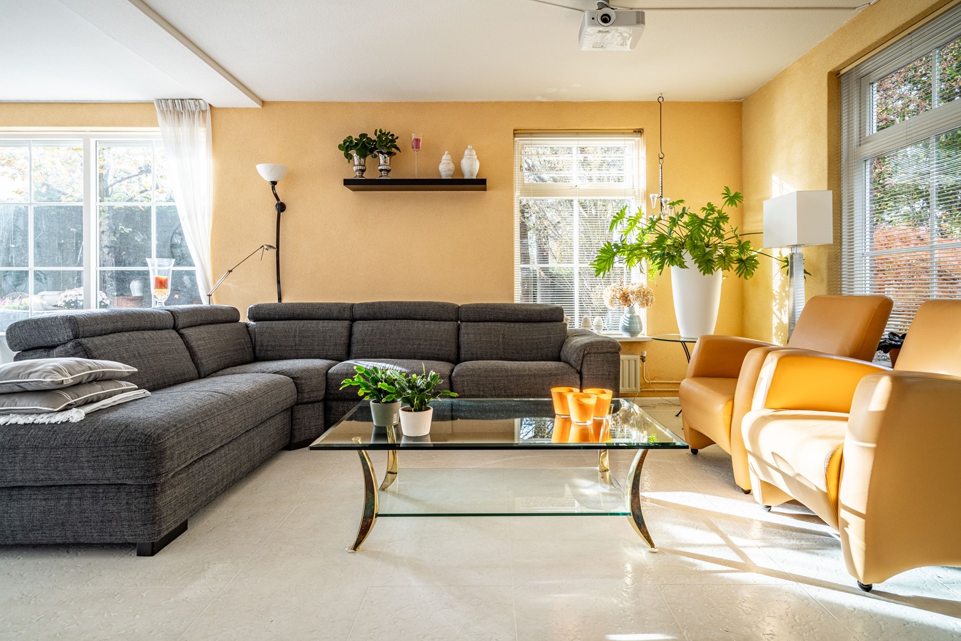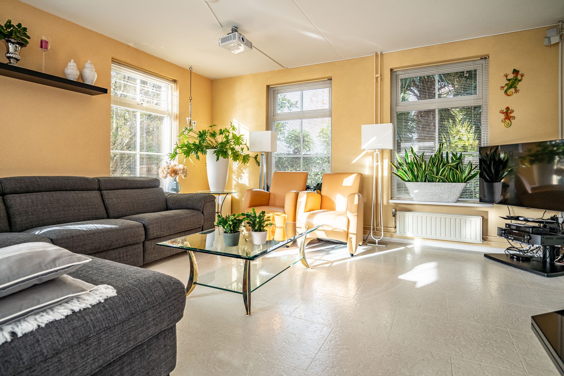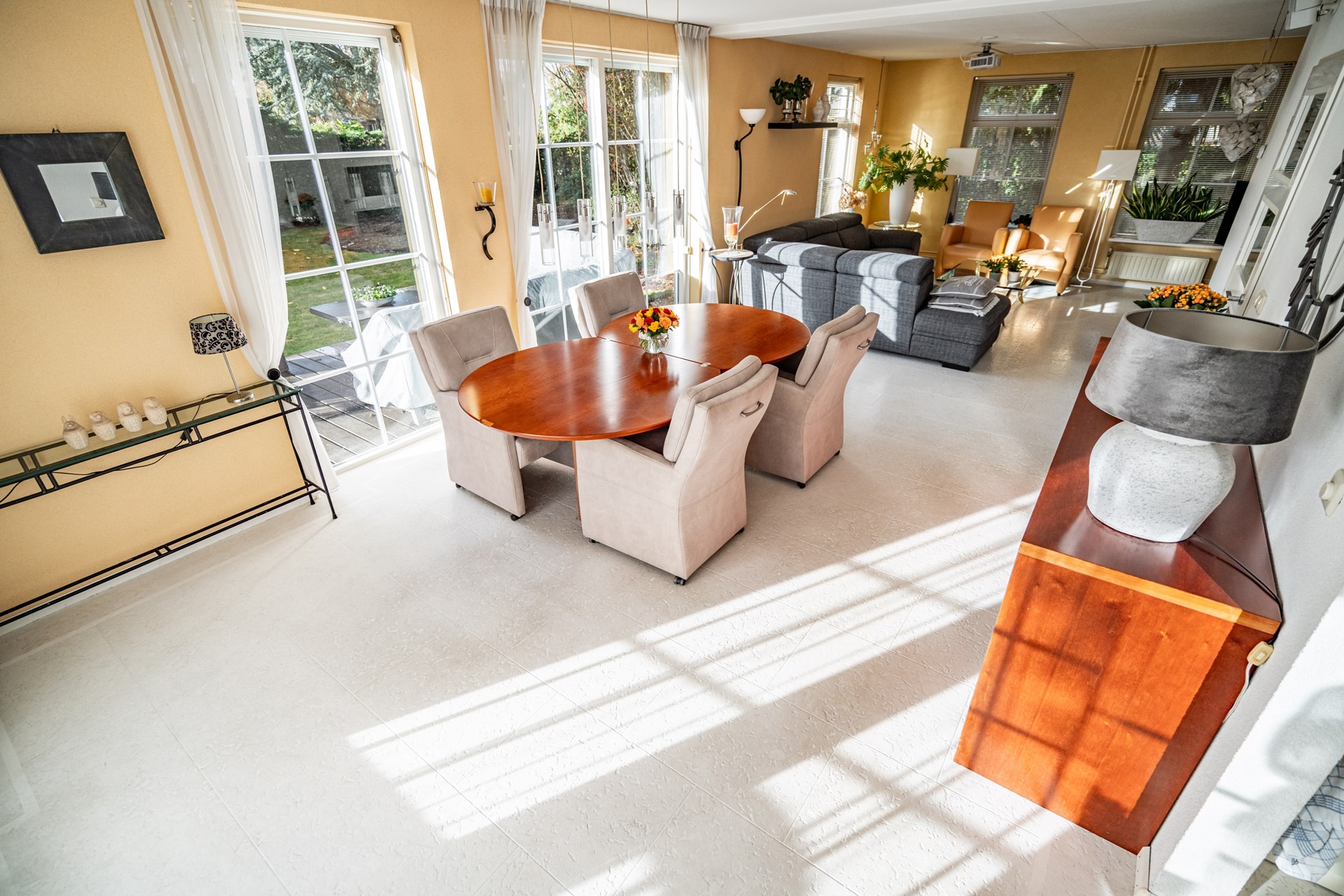 De woonkamer ademt ruimte en comfort dankzij de grote raampartijen, spachtelputz wandafwerking en een warme kurkvloer. De openslaande deuren bieden toegang tot de tuin. De lichte zithoek is voorzien van een sfeervolle open haard, ideaal voor lange winteravonden. Aan de voorzijde is een praktische kantoorruimte ingericht: perfect voor thuiswerkers.