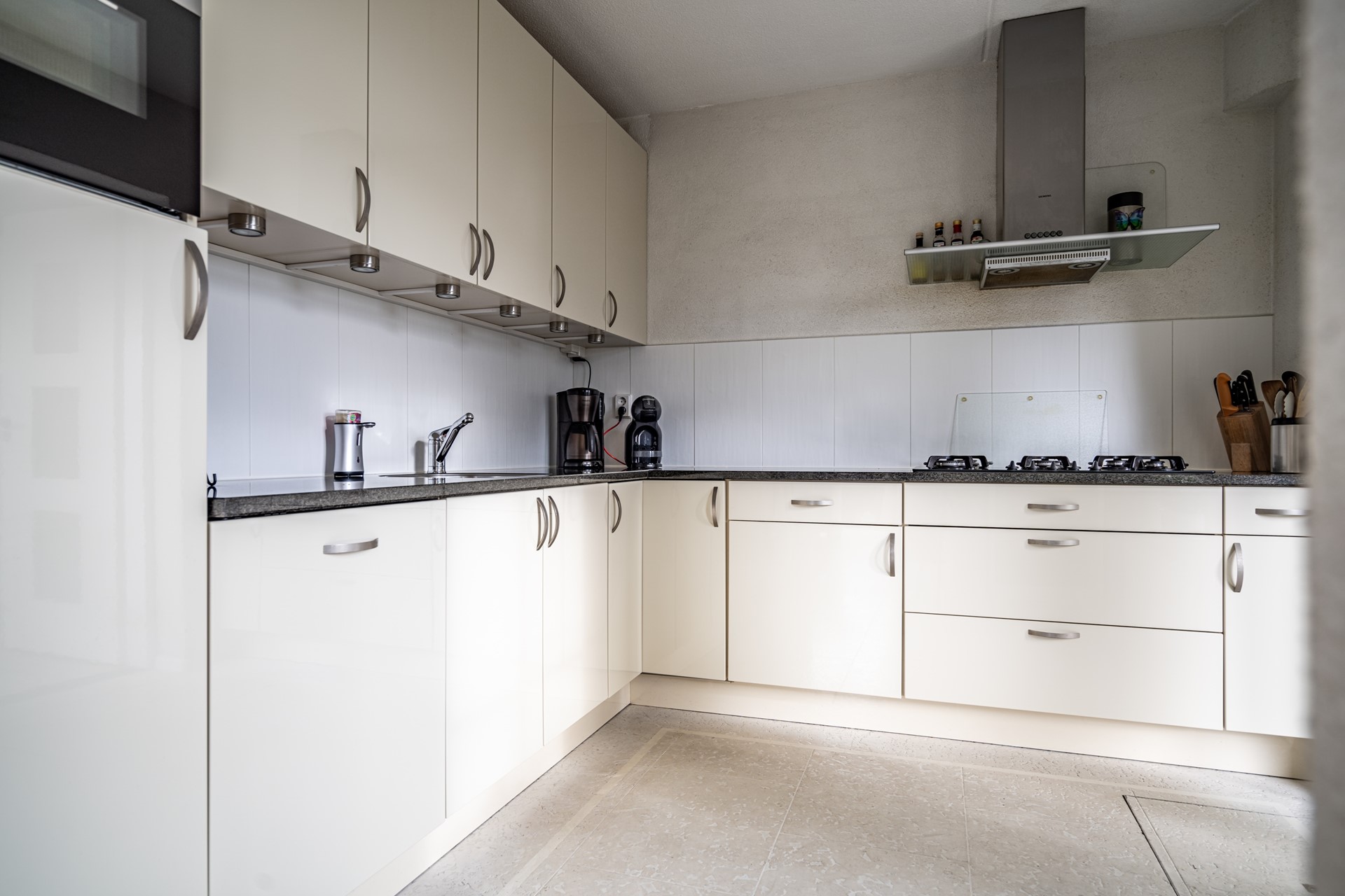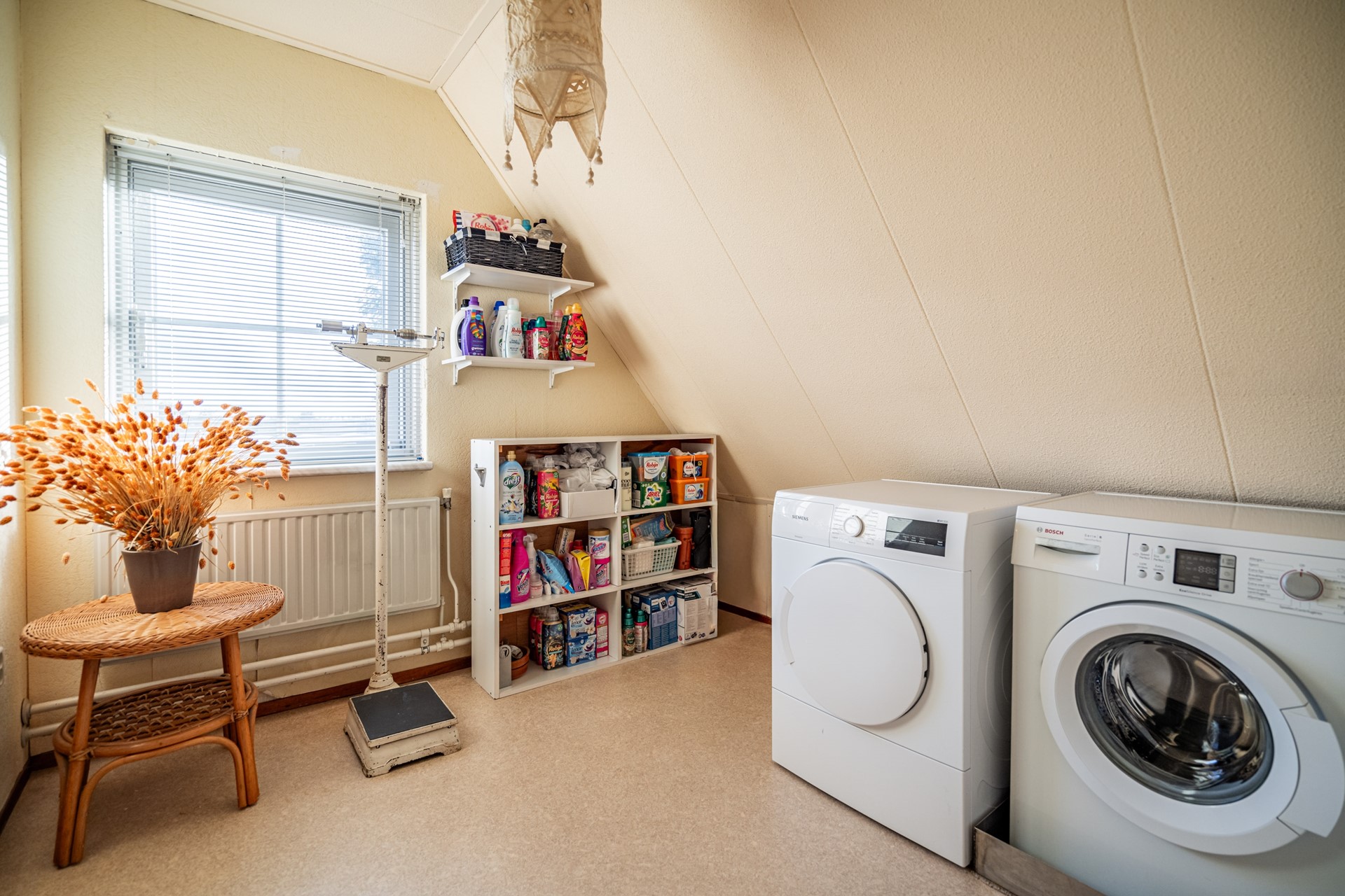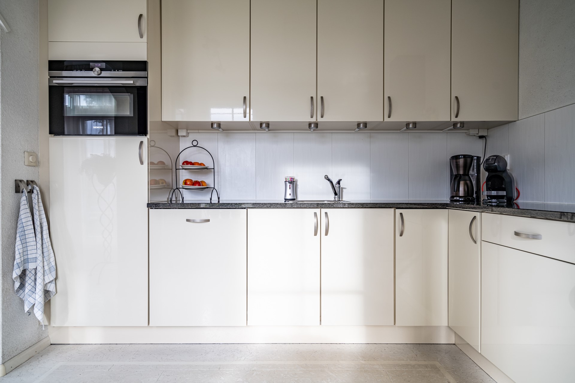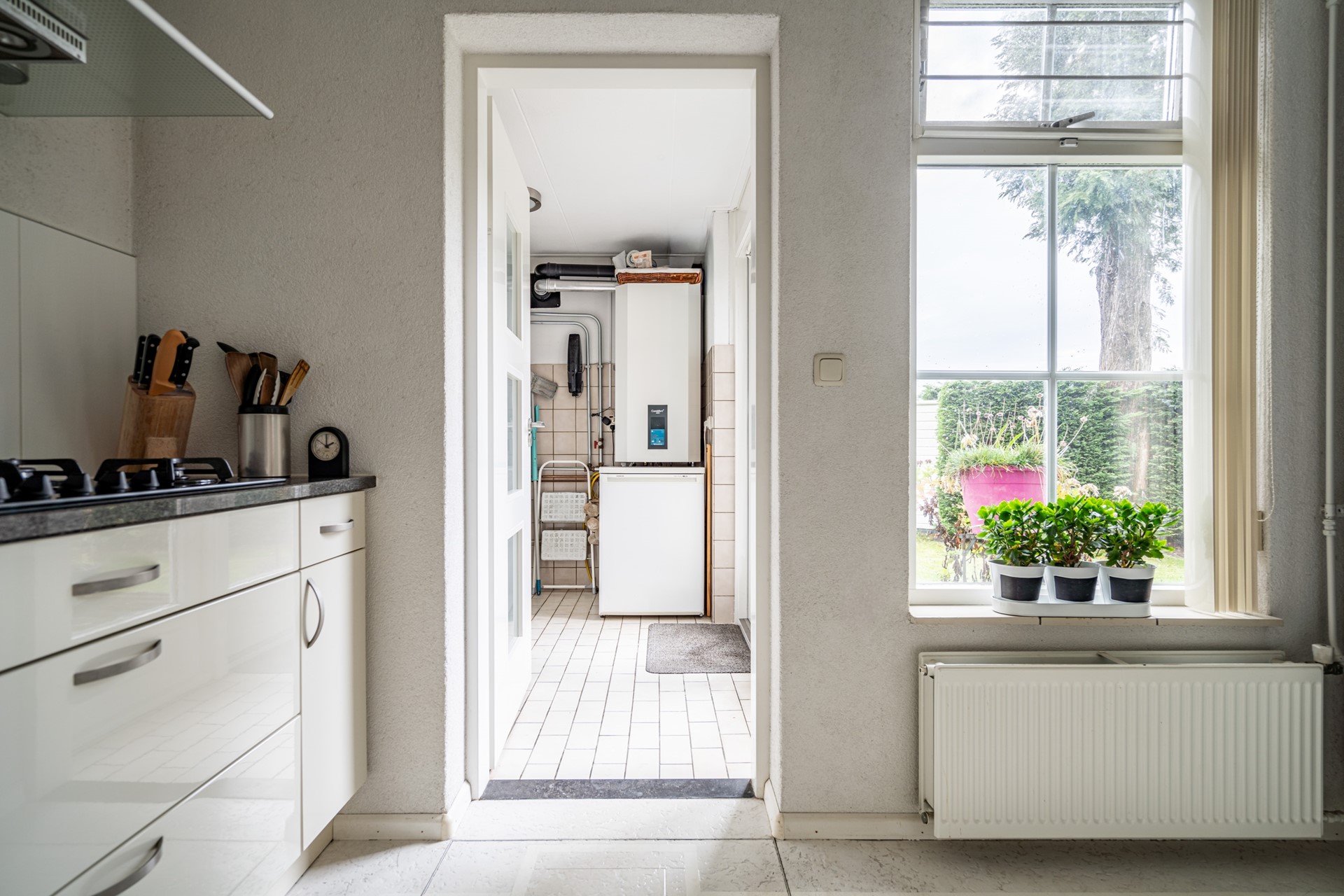 De halfopen keuken is compleet uitgerust met een vijfpits gasfornuis, vaatwasser, afzuigkap, oven, koelkast en granieten werkblad. Vanuit de woonkamer heeft u een prachtig zicht op de tuin, waardoor binnen en buiten naadloos in elkaar overgaan. De bijkeuken biedt extra bergruimte, toegang tot de garage en de tuin.