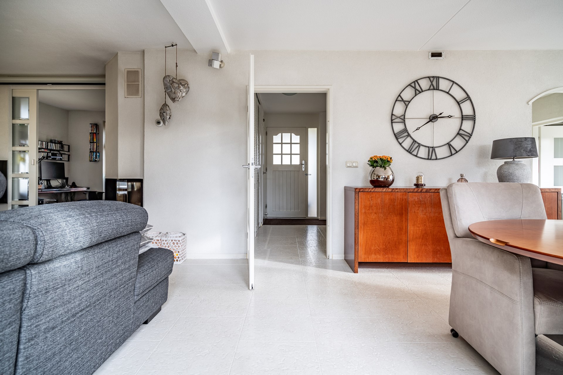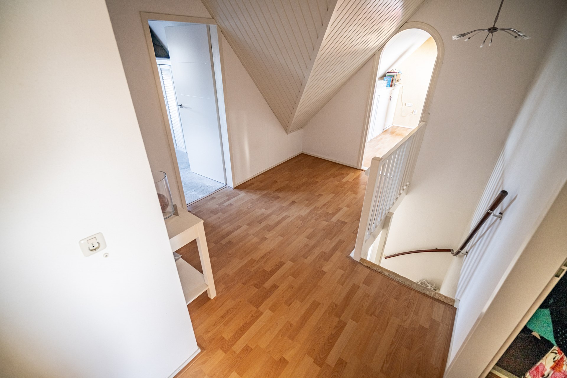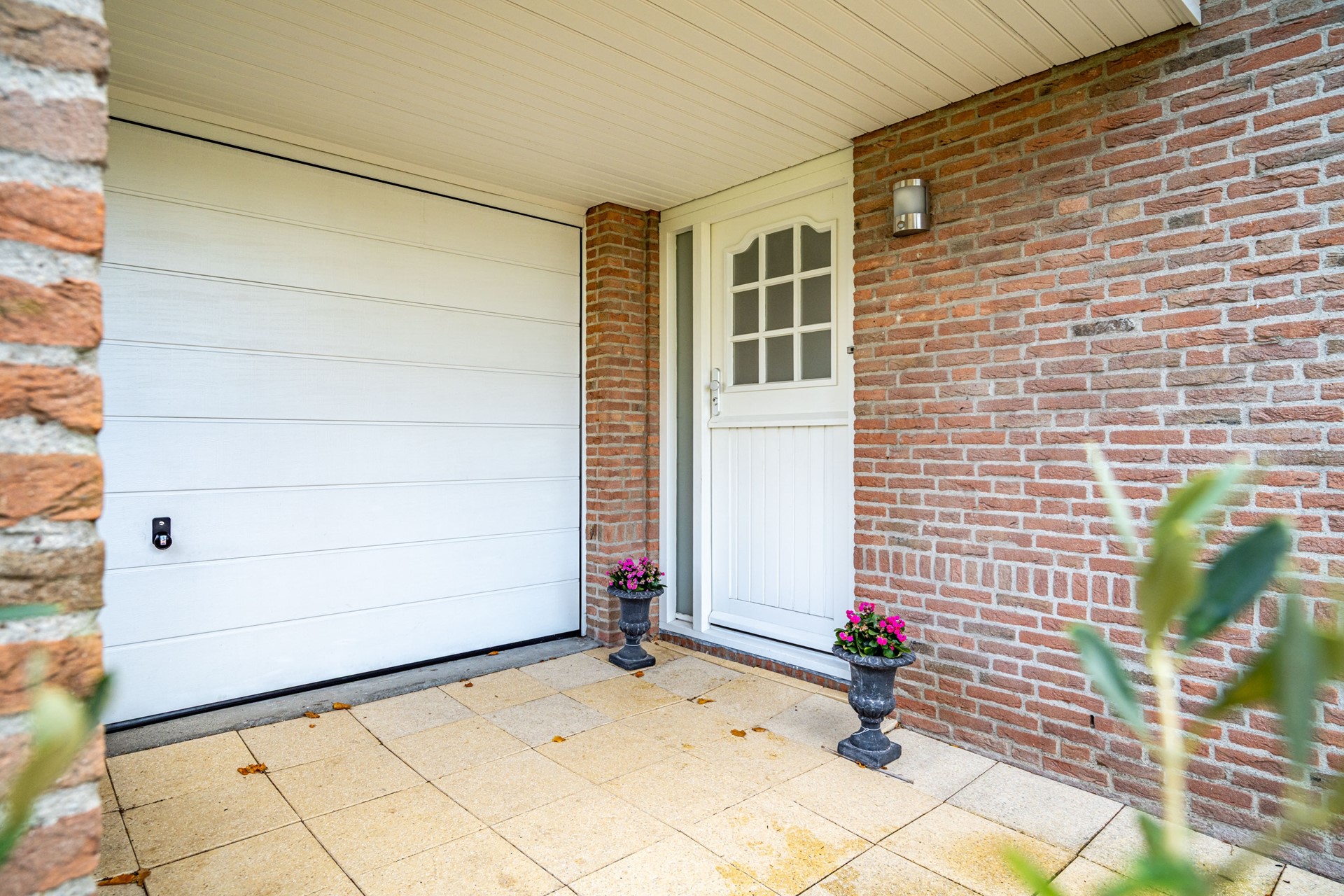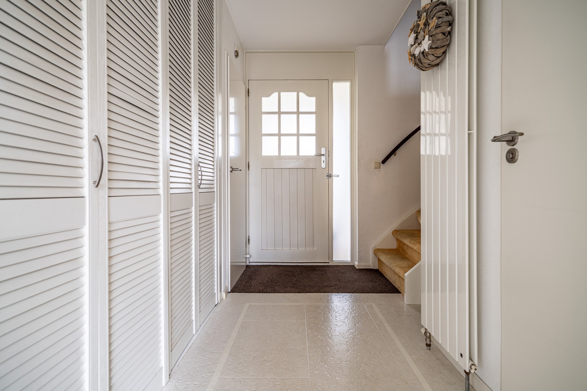 Via de eigen oprit – met ruimte voor meerdere auto's – bereikt u de entree naast de garage. In de ruime hal bevinden zich het toilet en de trap naar de eerste verdieping.
