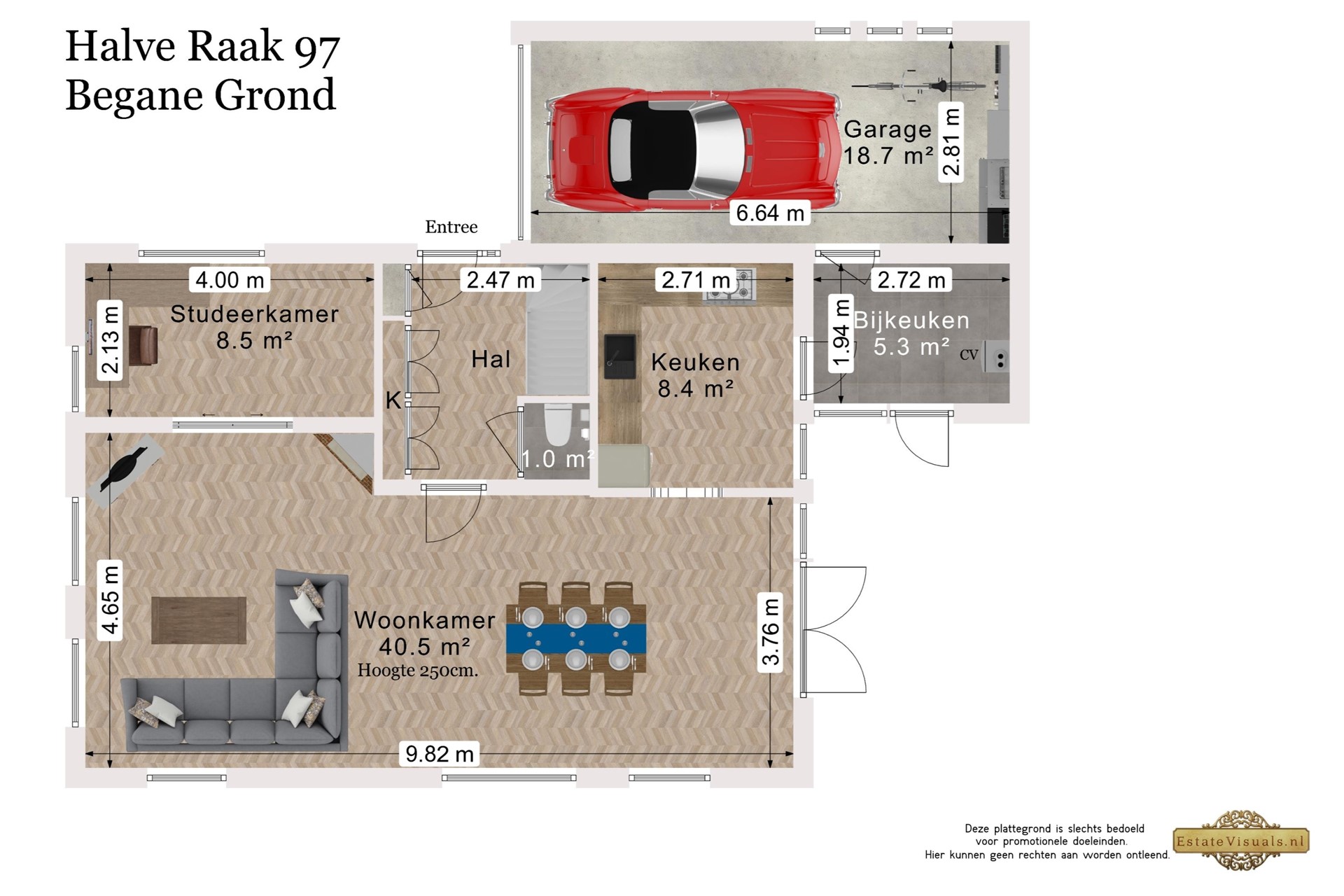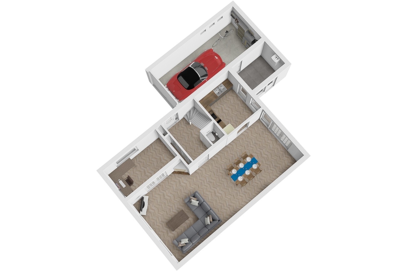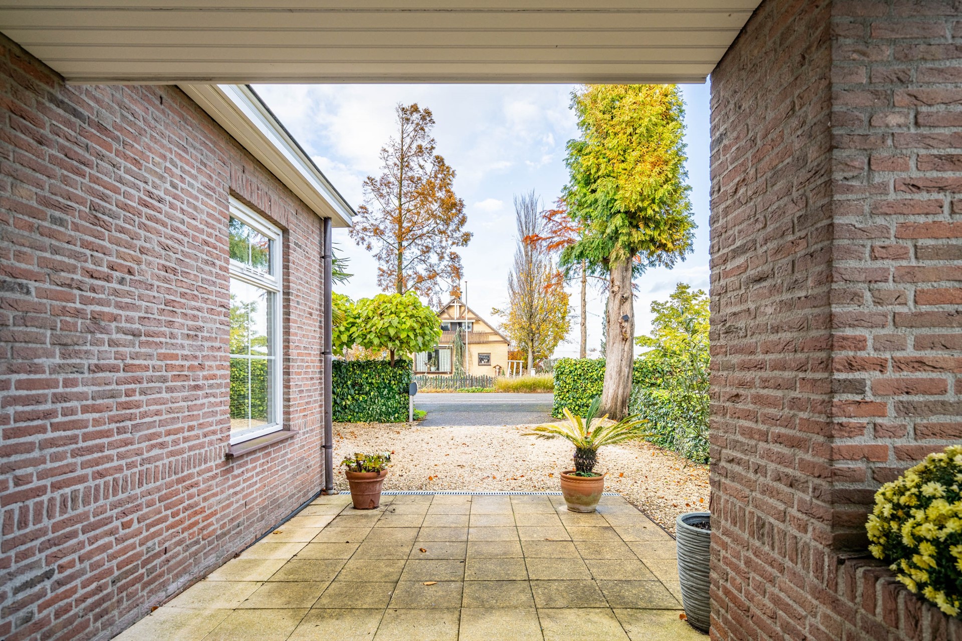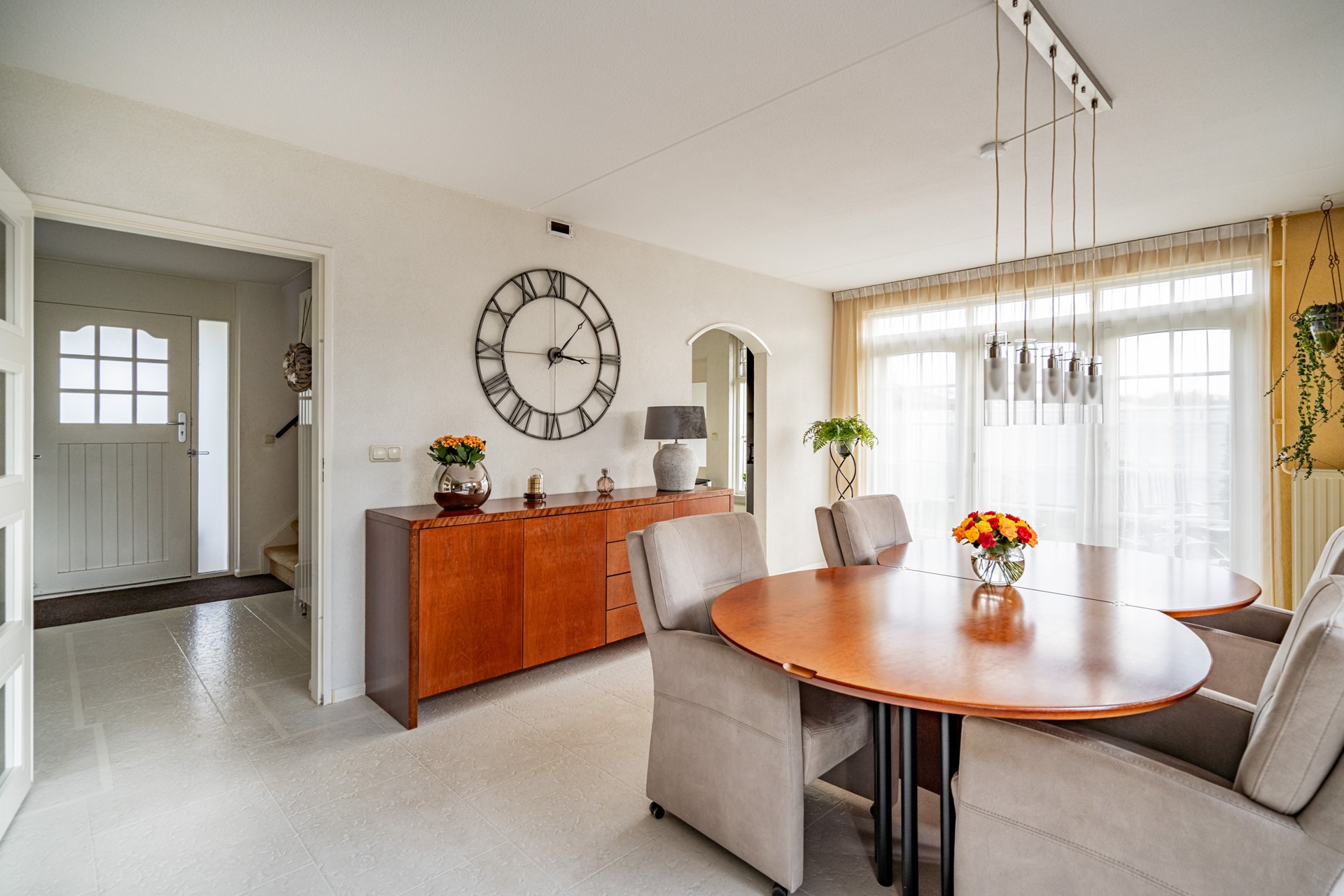 Via de eigen oprit – met ruimte voor meerdere auto's – bereikt u de entree naast de garage. In de ruime hal bevinden zich het toilet en de trap naar de eerste verdieping.