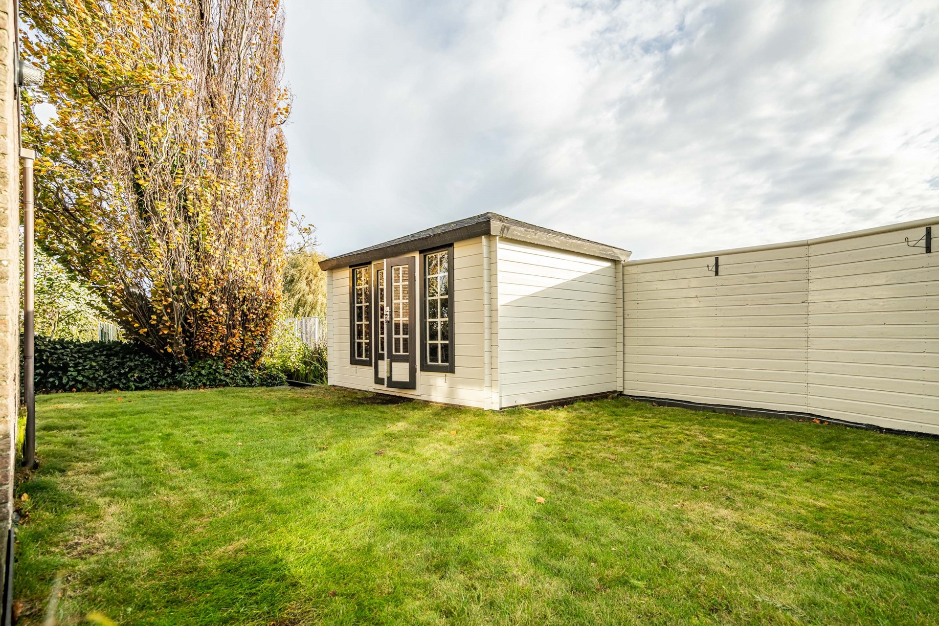 De prachtig onderhouden tuin rondom de woning biedt veel privacy én vrijheid. Of u nu wil tuinieren, spelen met kinderen of gewoon genieten van het groen: de ruimte is er. Achter in de tuin staat een tuinhuis voor extra opslag. De grasmat is voorzien van een sproei installatie en mollengaas. Parkeren kan ruimschoots op eigen terrein.