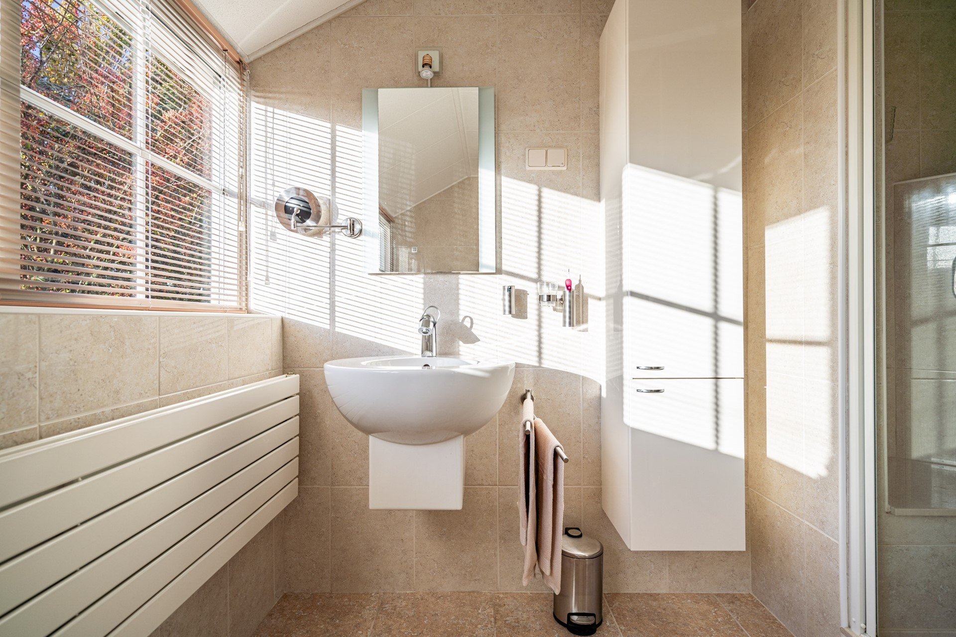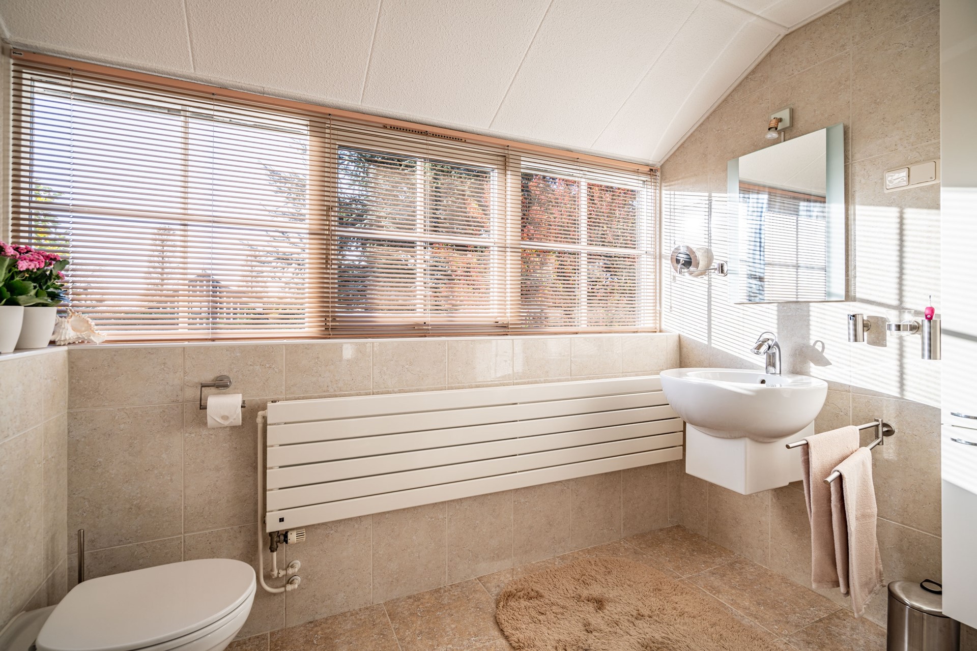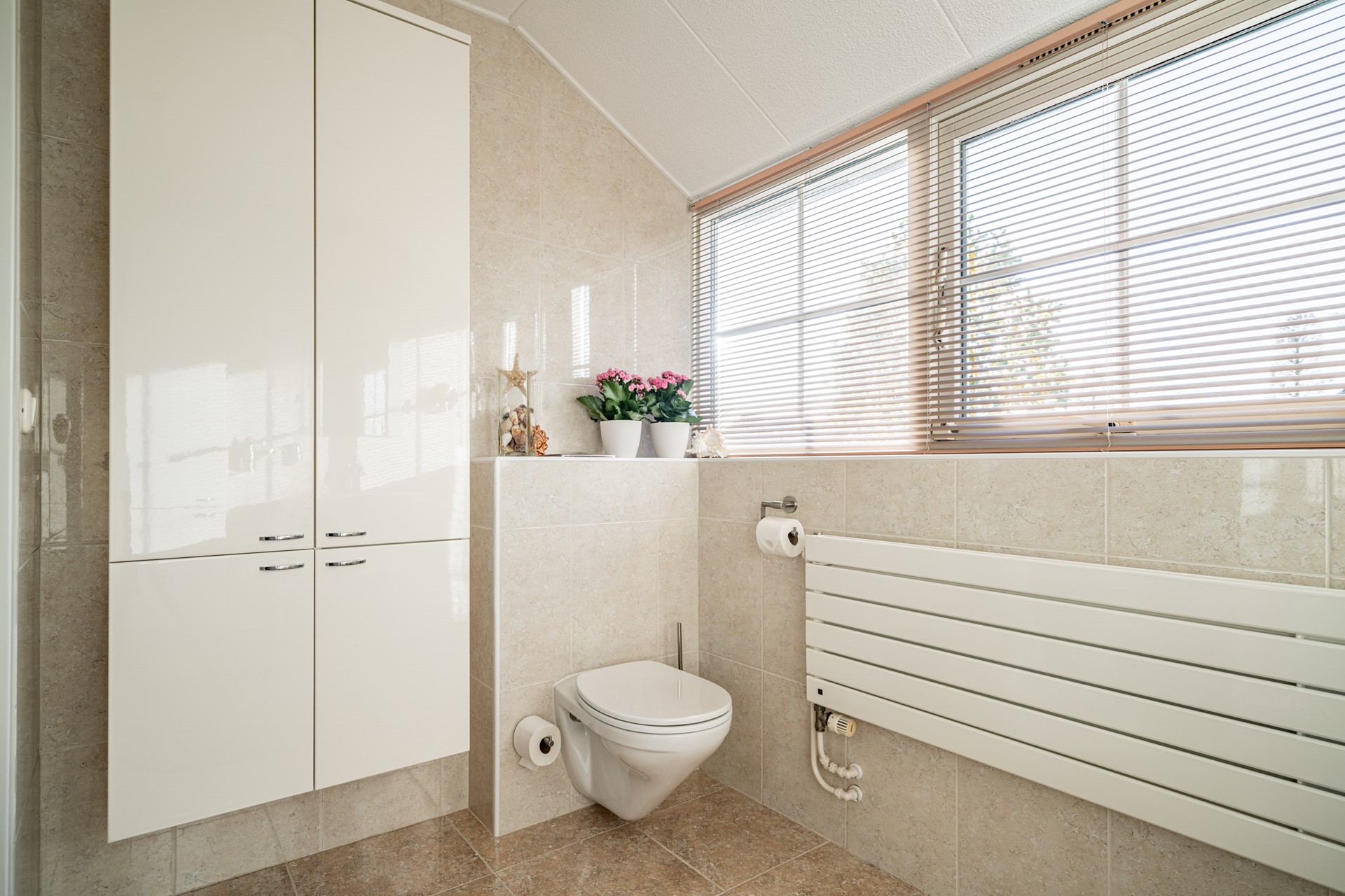 De badkamer is heerlijk ruim dankzij de dakkapel en voorzien van een tweede toilet, douche, wastafel, radiator en een slim ventilatiesysteem.