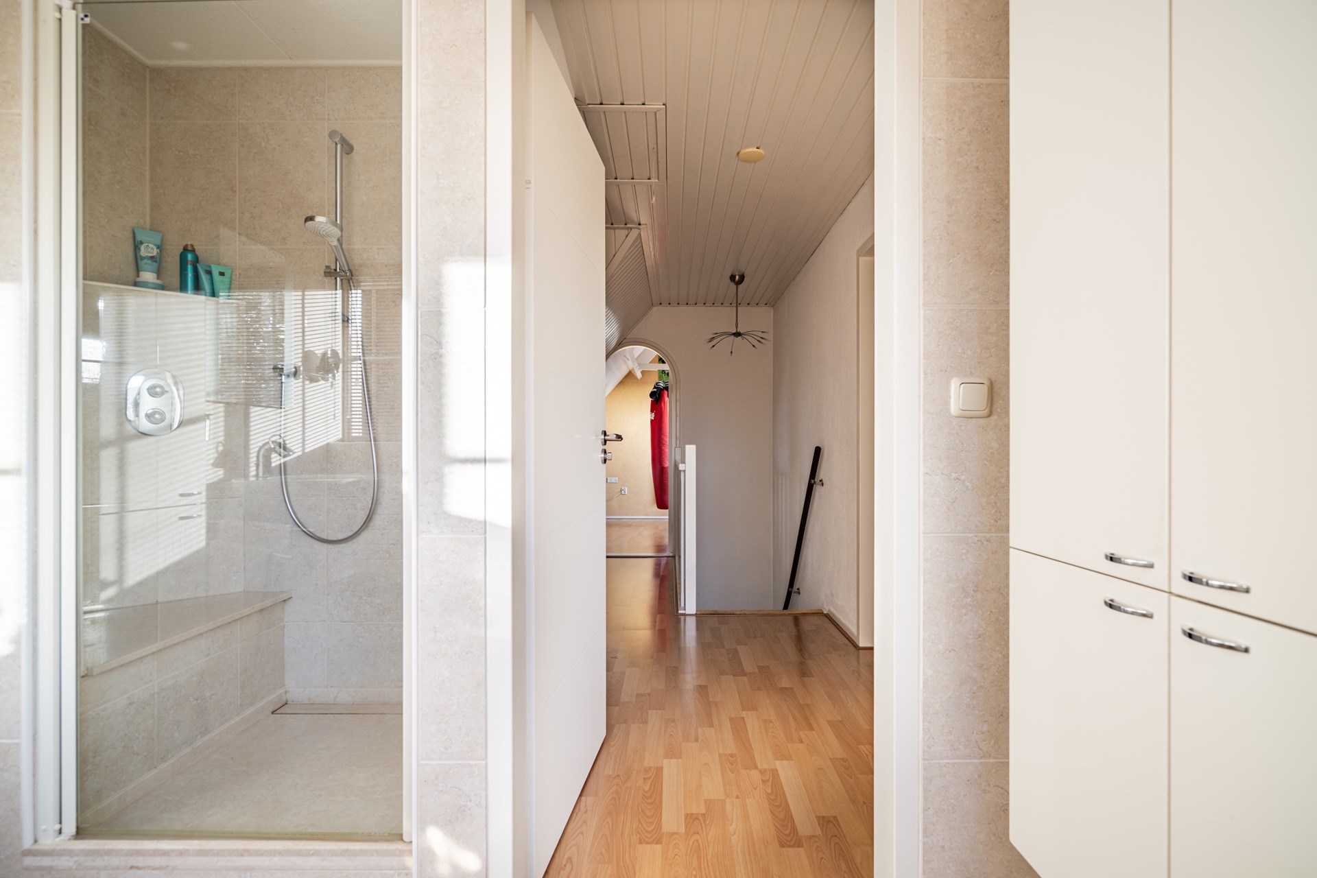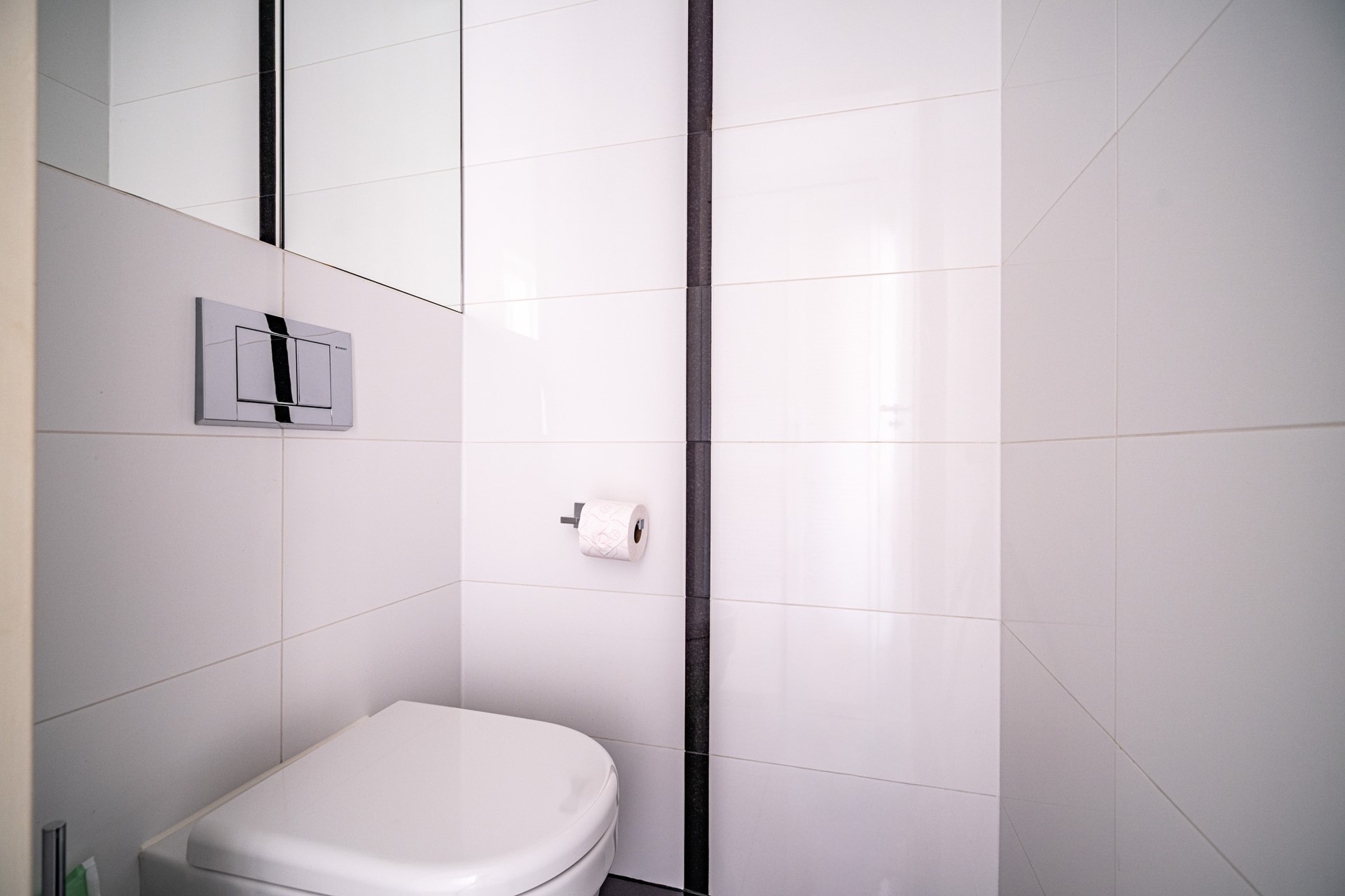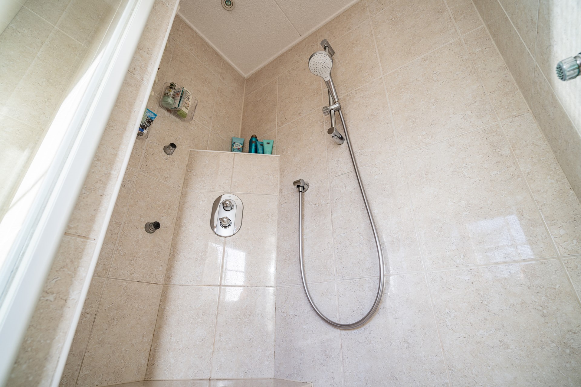 De badkamer is heerlijk ruim dankzij de dakkapel en voorzien van een tweede toilet, douche, wastafel, radiator en een slim ventilatiesysteem.