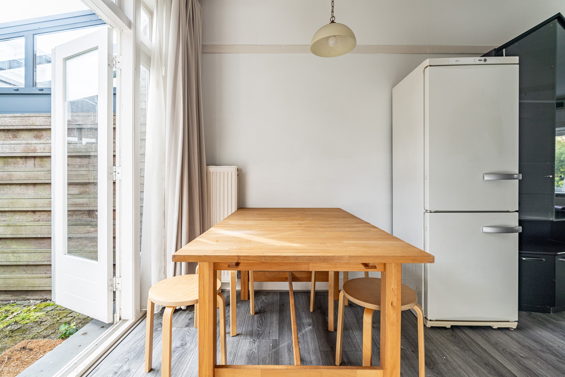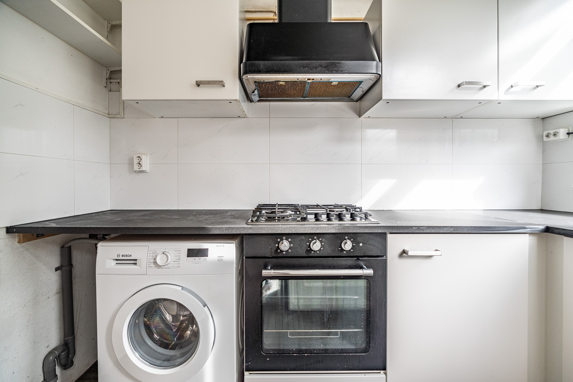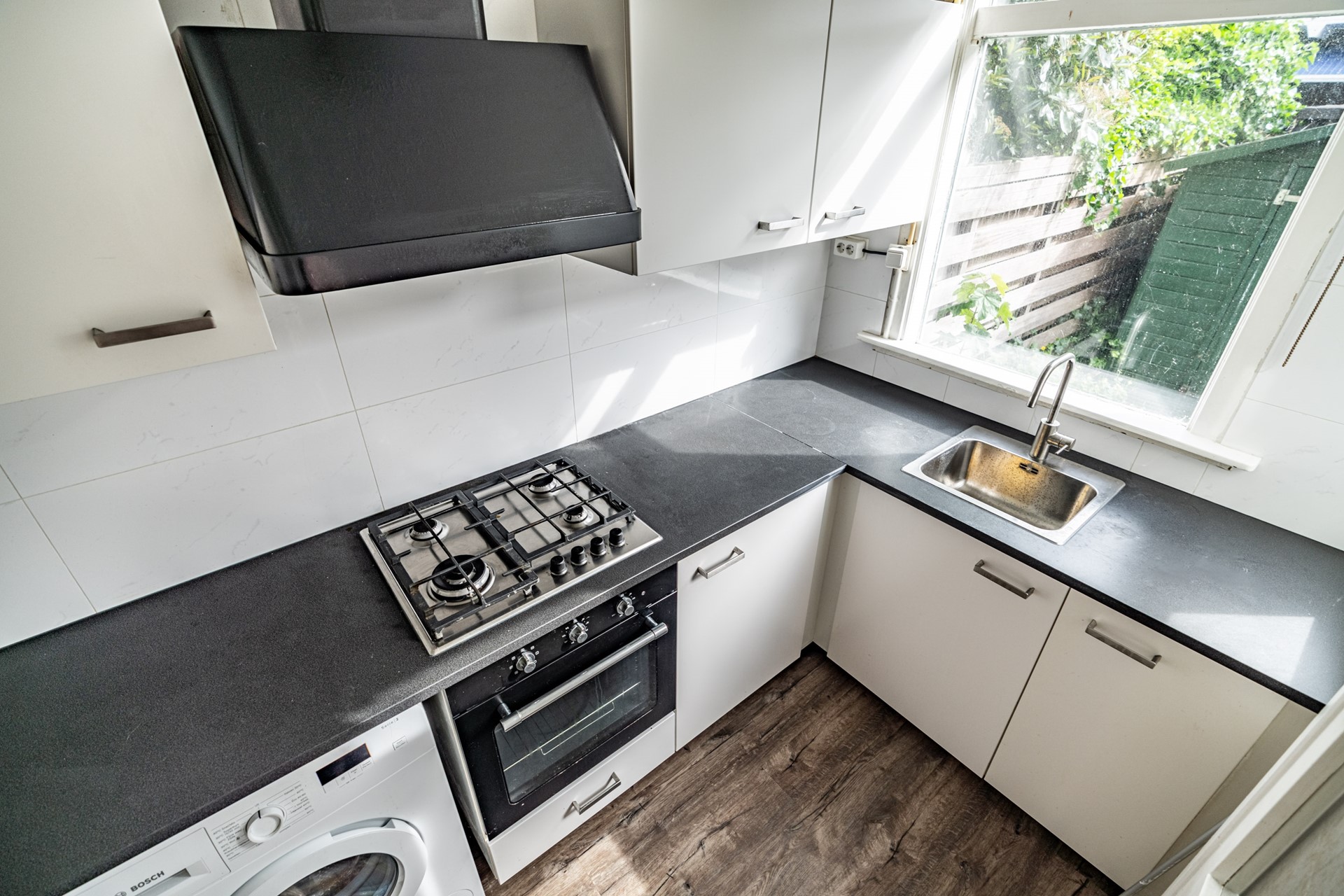Eenvoudige keuken met o.a. 4 pits gaskookplaat, afzuigkap, oven en losstaande koel/vriescombi. Tevens bereikt u vanuit de woonkamer de achtertuin.