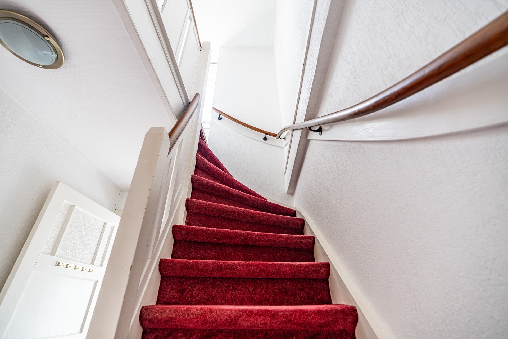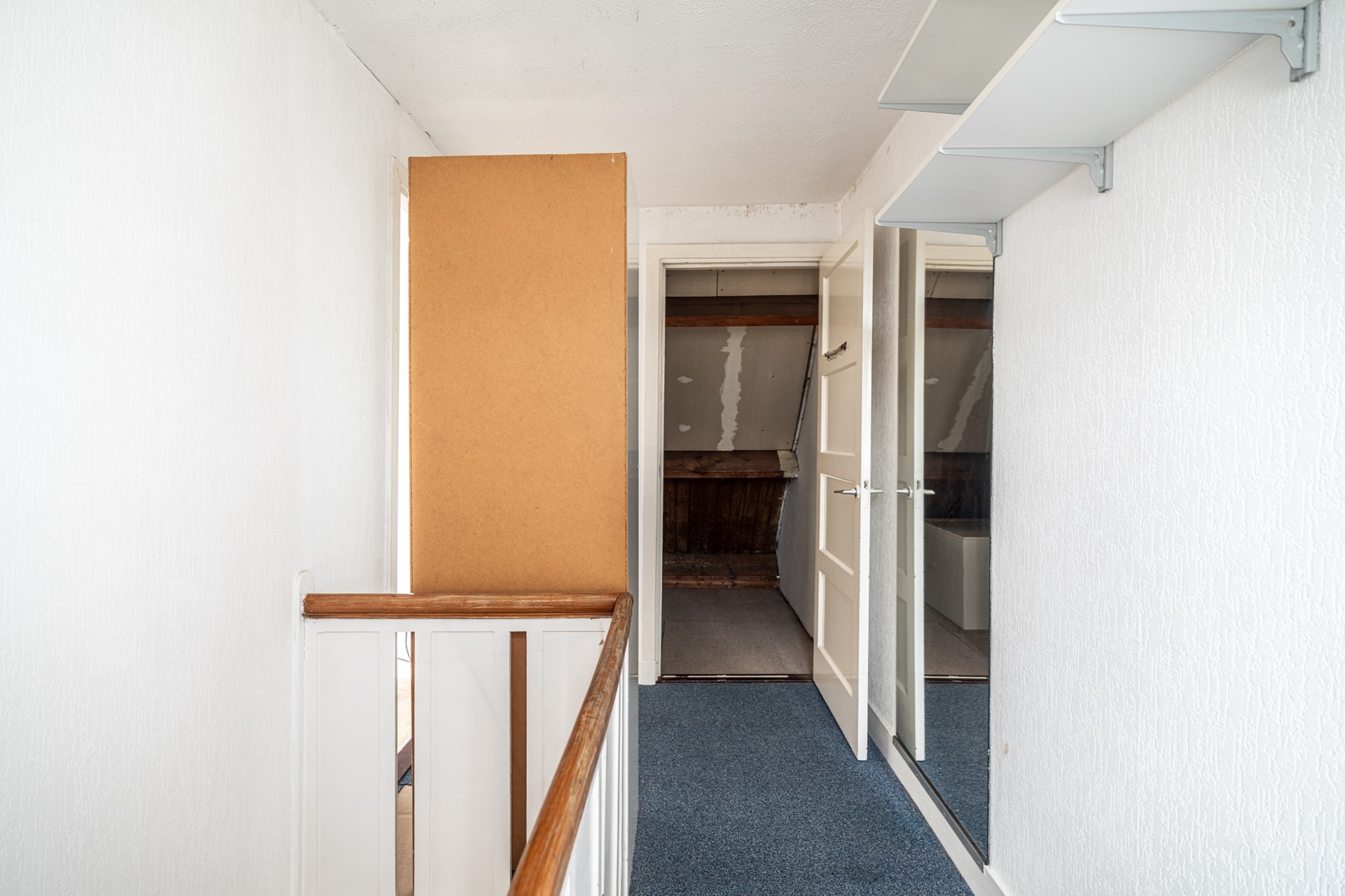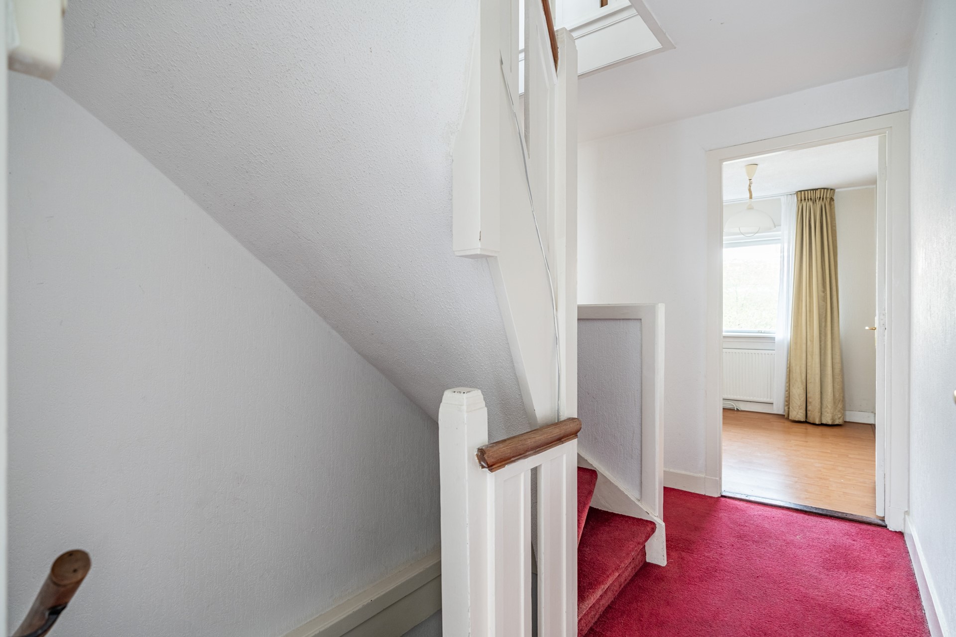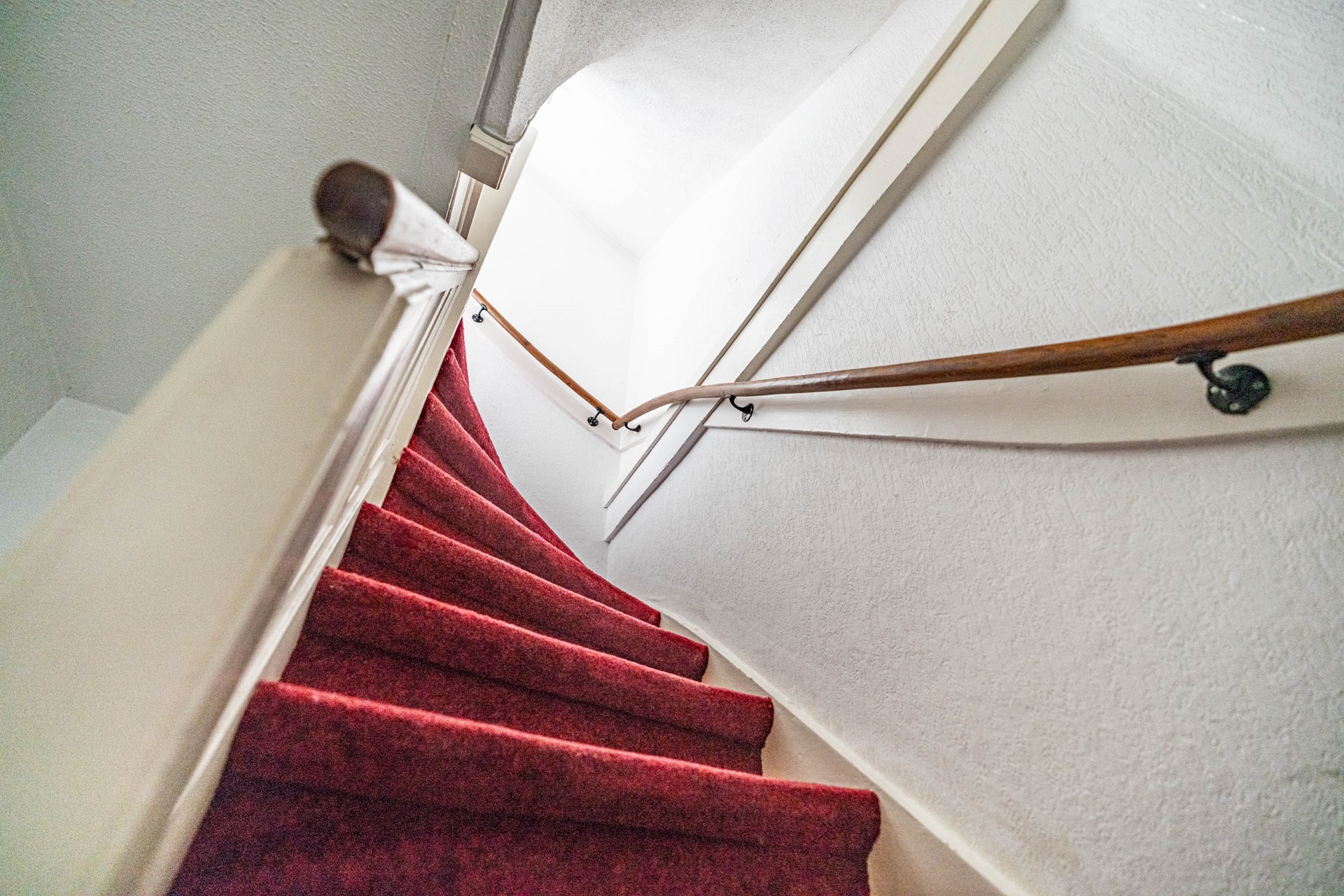 Trap naar eerste etage, hier bevinden zich twee slaapkamers van goed formaat en de badkamer. Beide slaapkamers beschikken over een inpandige kast.