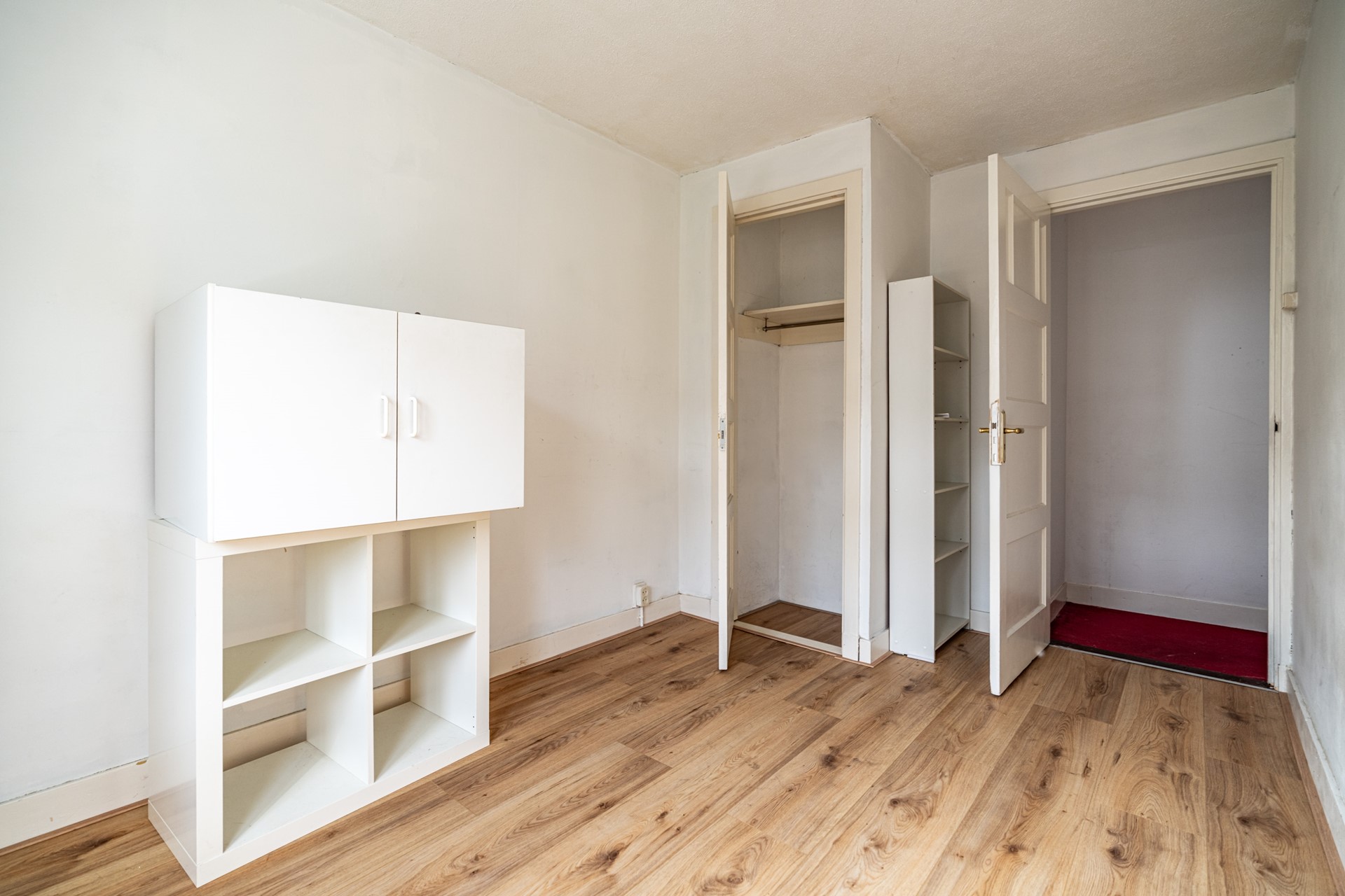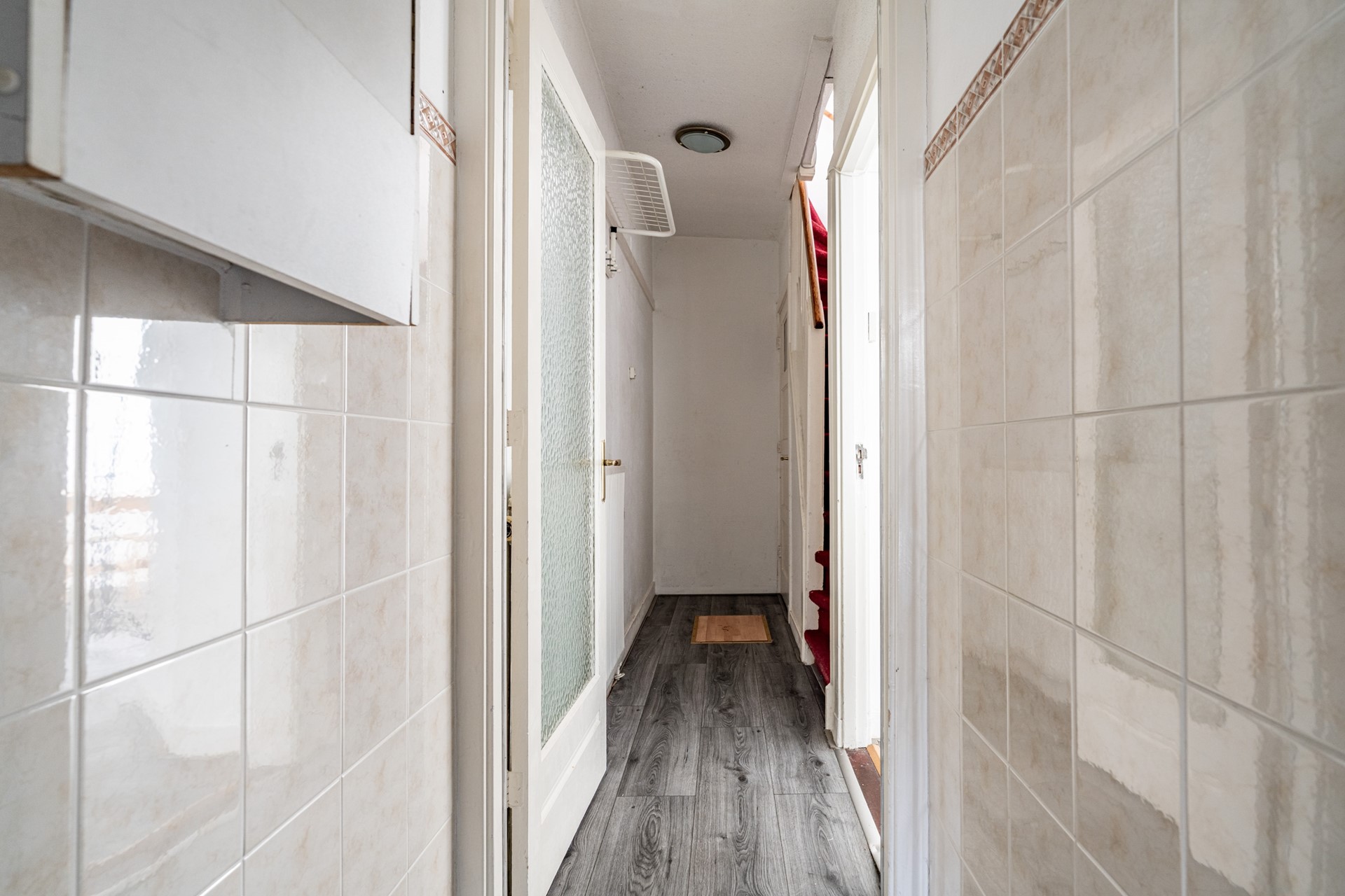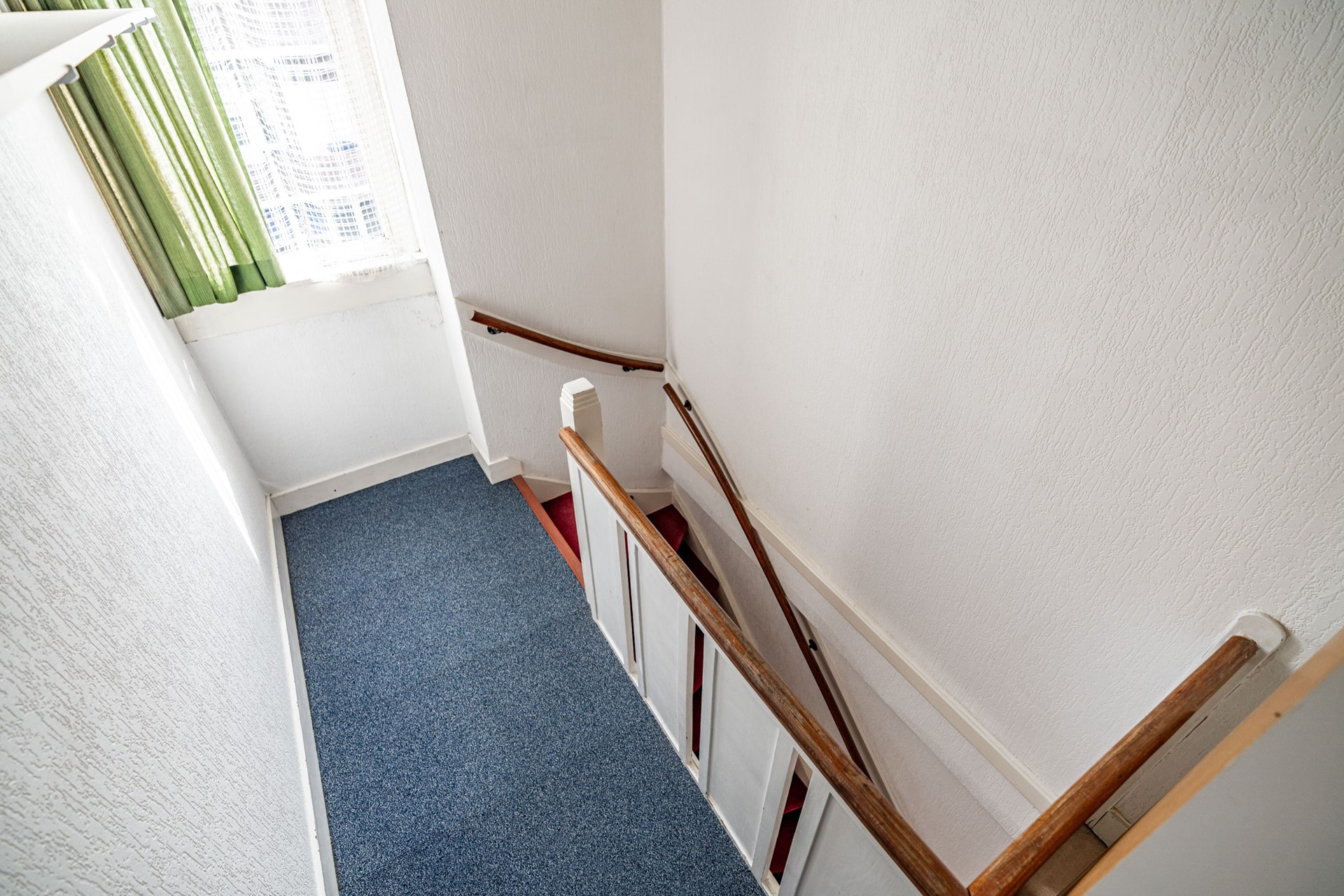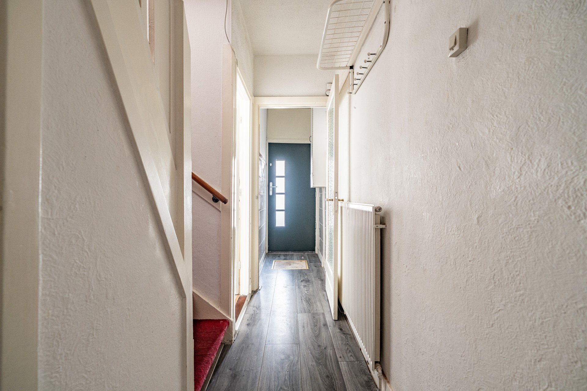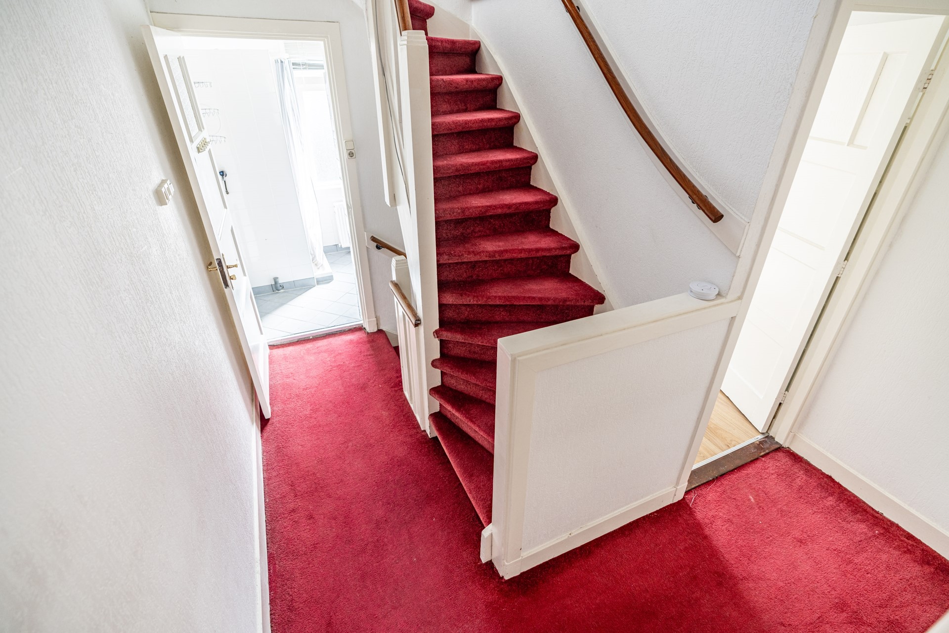 Trap naar eerste etage, hier bevinden zich twee slaapkamers van goed formaat en de badkamer. Beide slaapkamers beschikken over een inpandige kast.