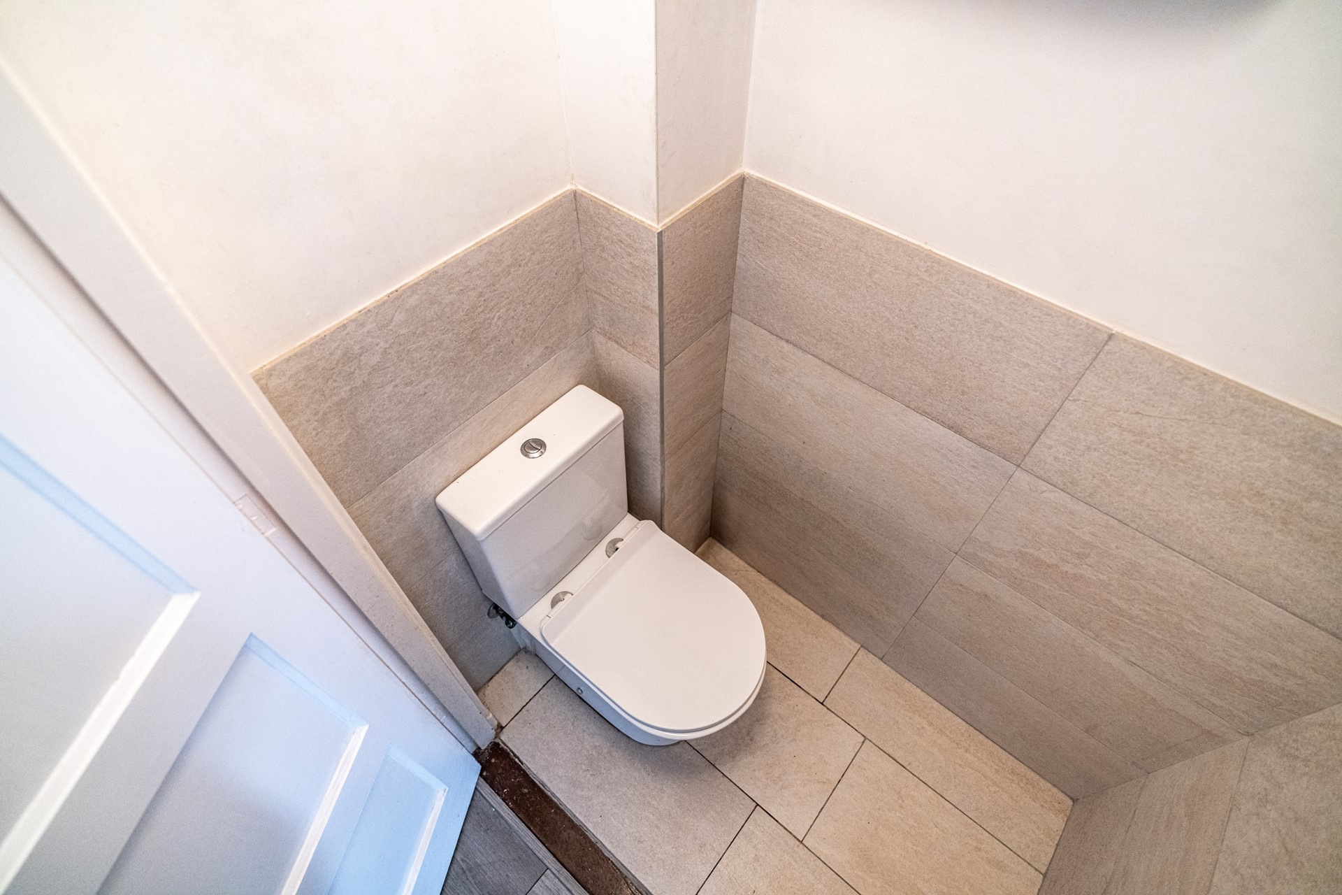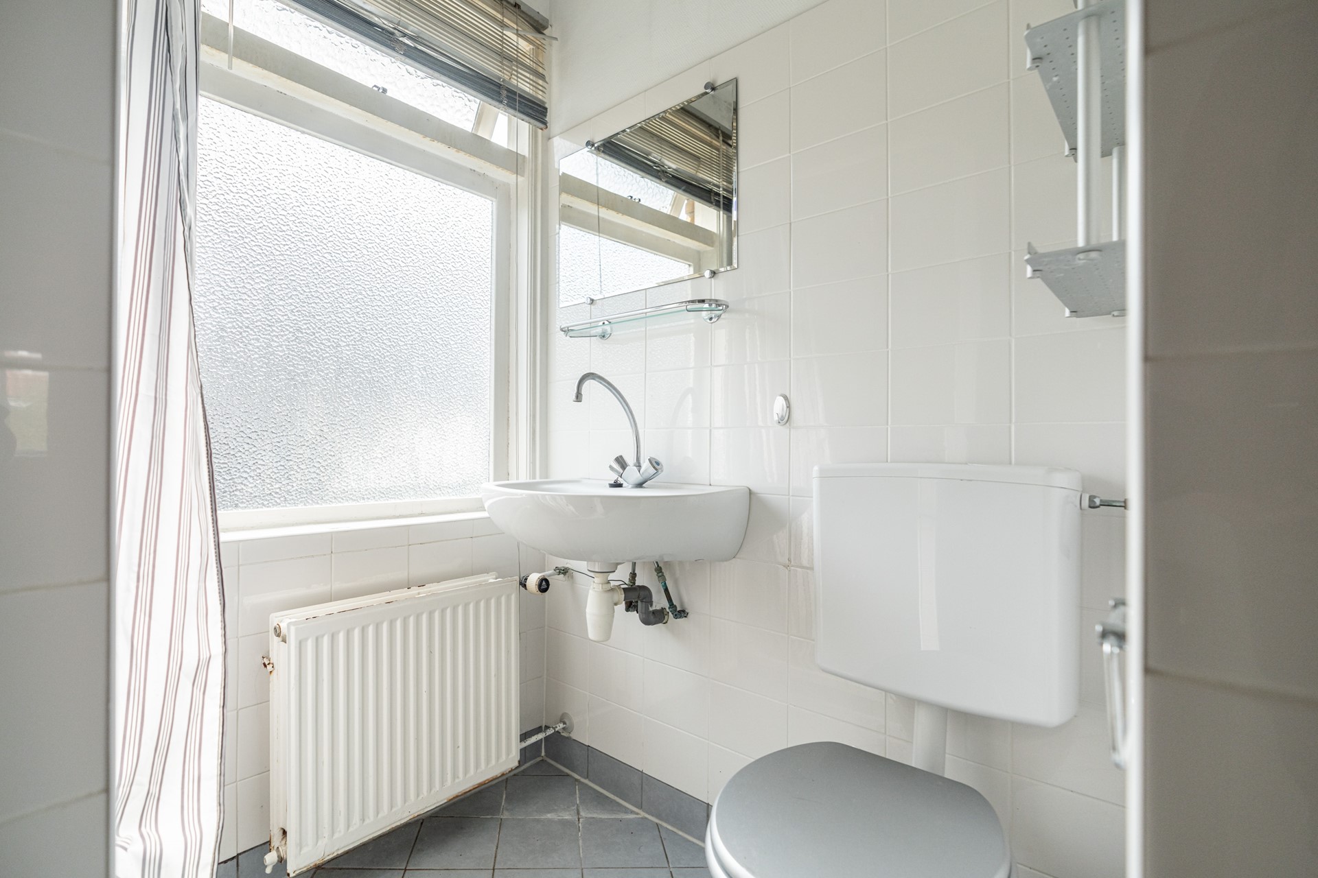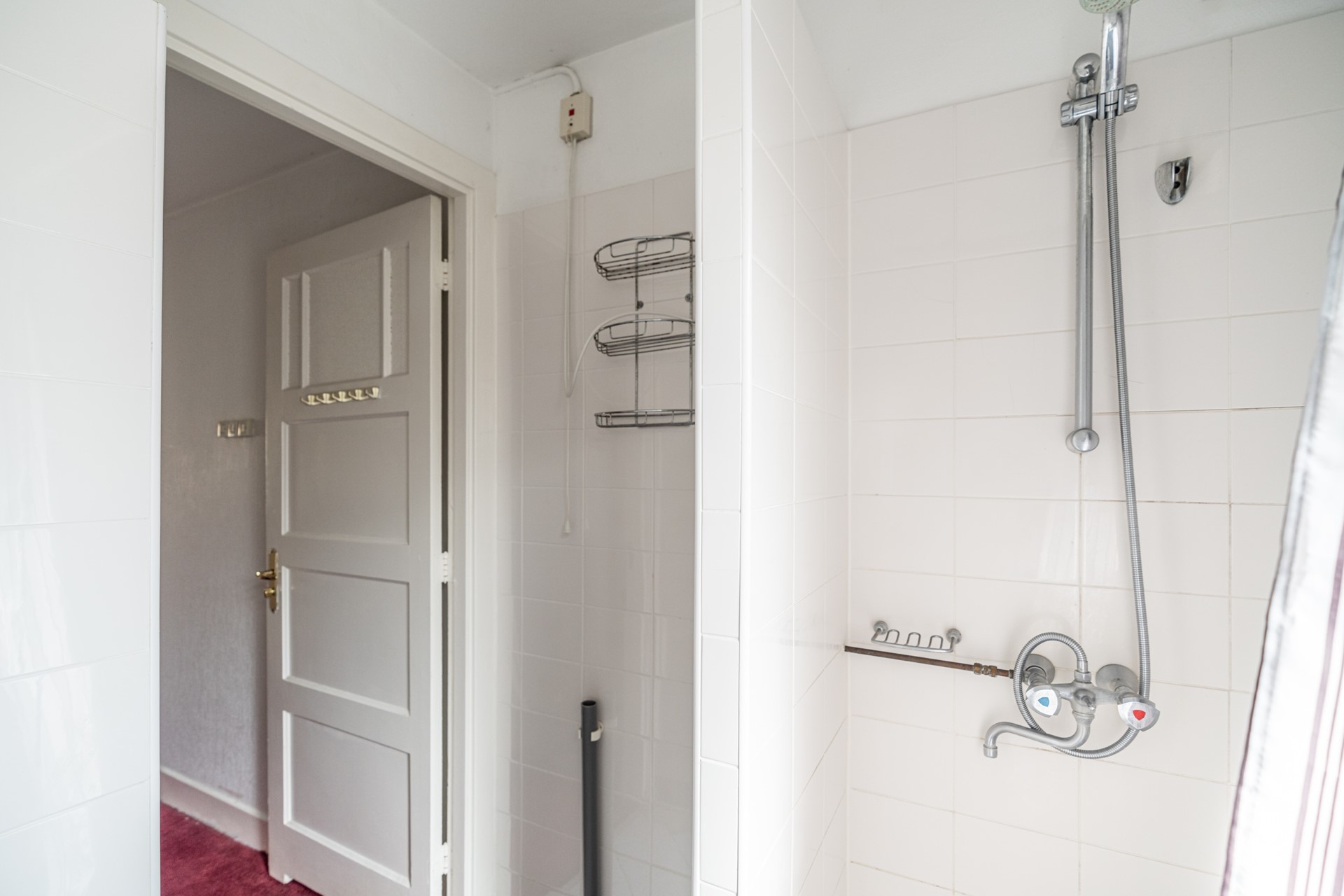 Badkamer met douchehoek , vaste wastafel en tweede toilet.