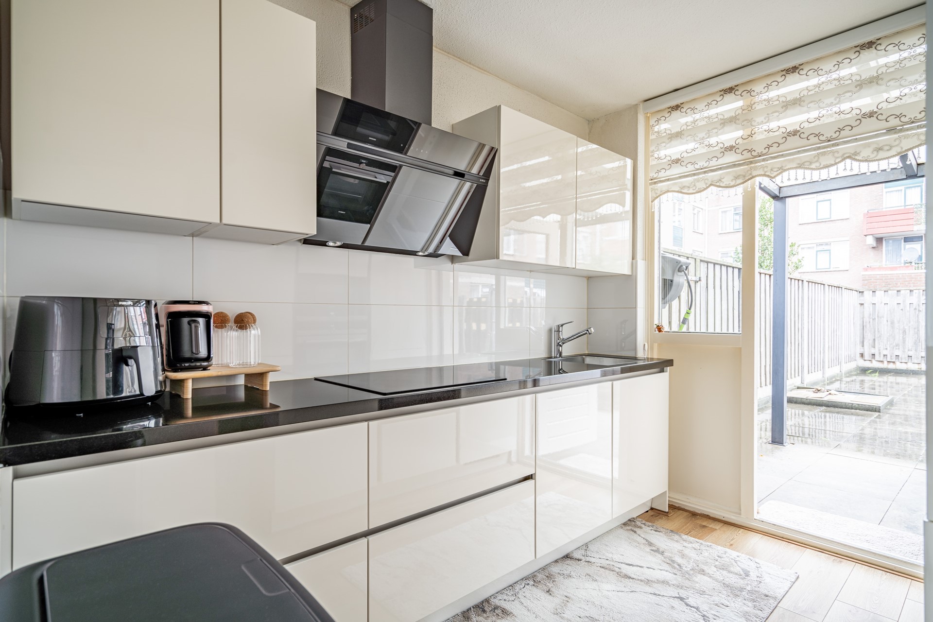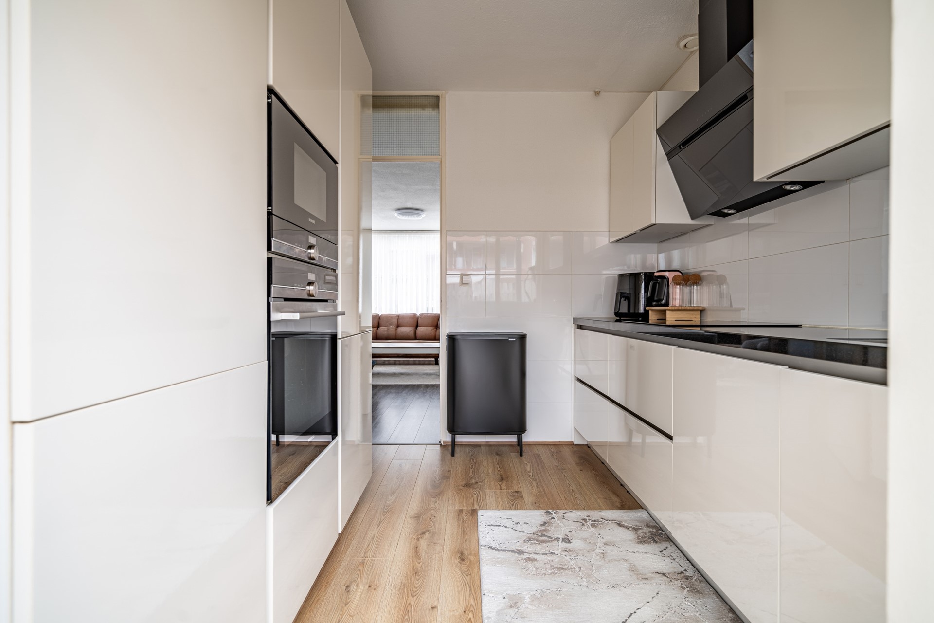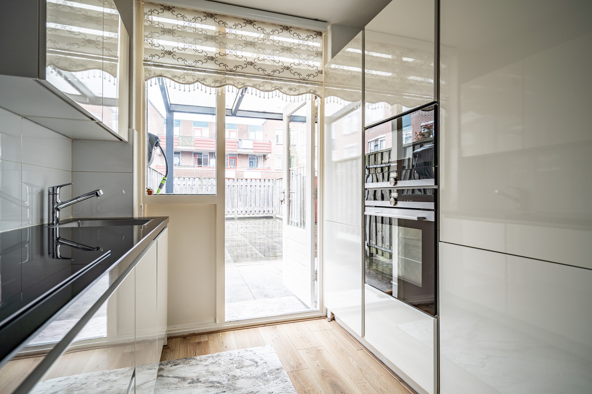 Via de eigen entree bereikt u de hal met toegang tot alle vertrekken. De lichte en ruime woonkamer (ca. 30 m²) vormt het hart van de woning en biedt voldoende plek voor zowel een zit- als eethoek. De halfopen keuken is modern uitgevoerd met strakke fronten en voorzien van diverse inbouwapparatuur, waaronder een oven, magnetron, kookplaat en afzuigkap. Vanuit de keuken is er direct toegang tot de achtertuin.