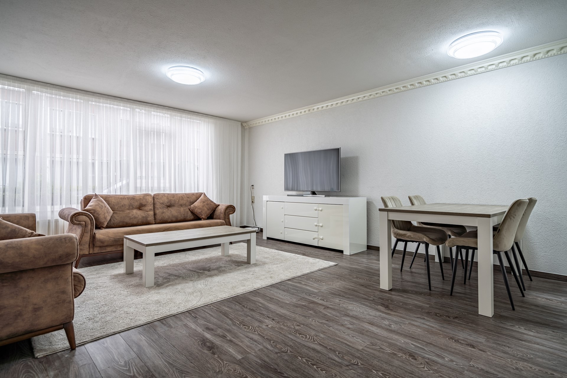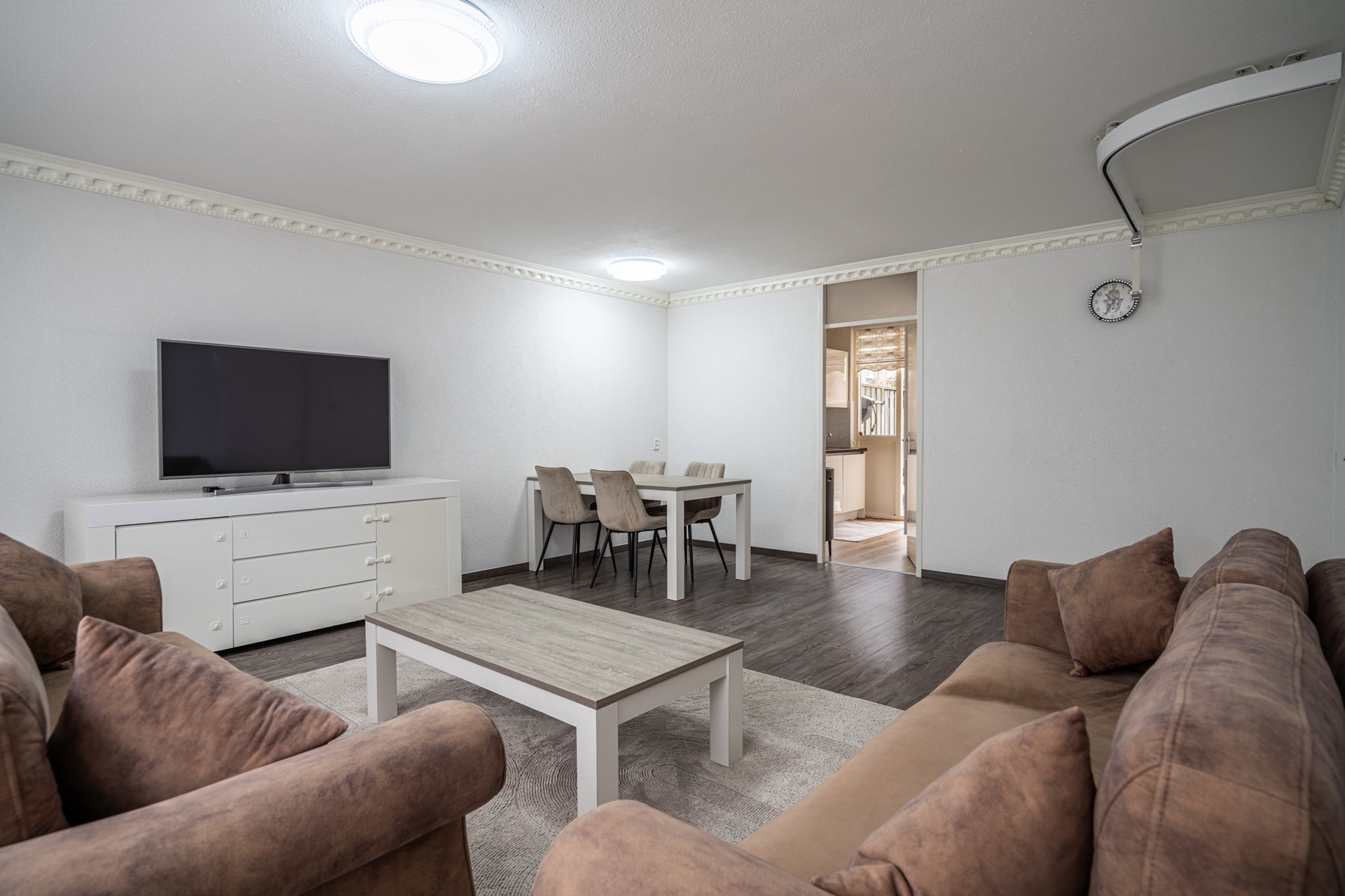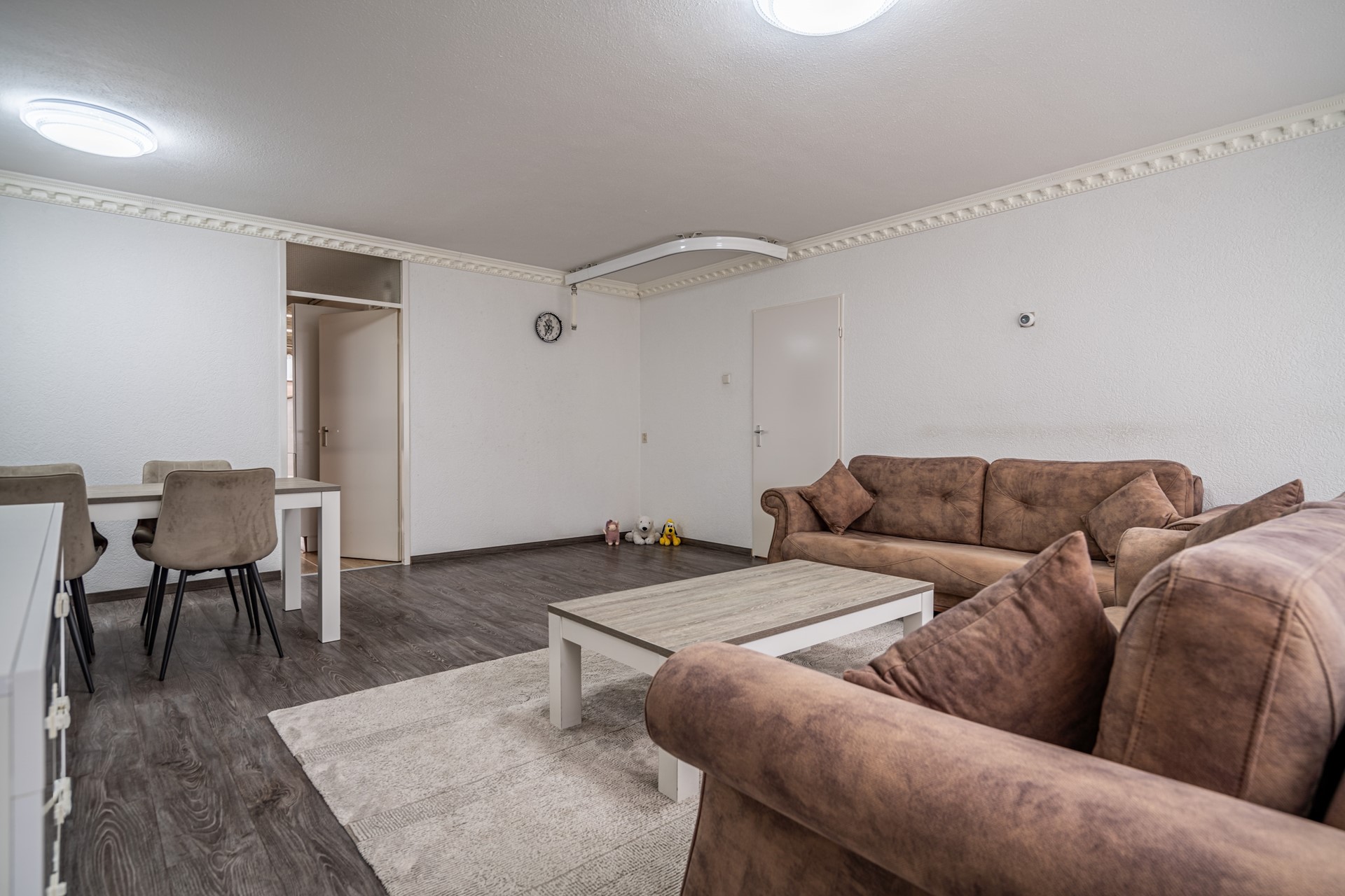 Via de eigen entree bereikt u de hal met toegang tot alle vertrekken. De lichte en ruime woonkamer (ca. 30 m²) vormt het hart van de woning en biedt voldoende plek voor zowel een zit- als eethoek. De halfopen keuken is modern uitgevoerd met strakke fronten en voorzien van diverse inbouwapparatuur, waaronder een oven, magnetron, kookplaat en afzuigkap. Vanuit de keuken is er direct toegang tot de achtertuin.