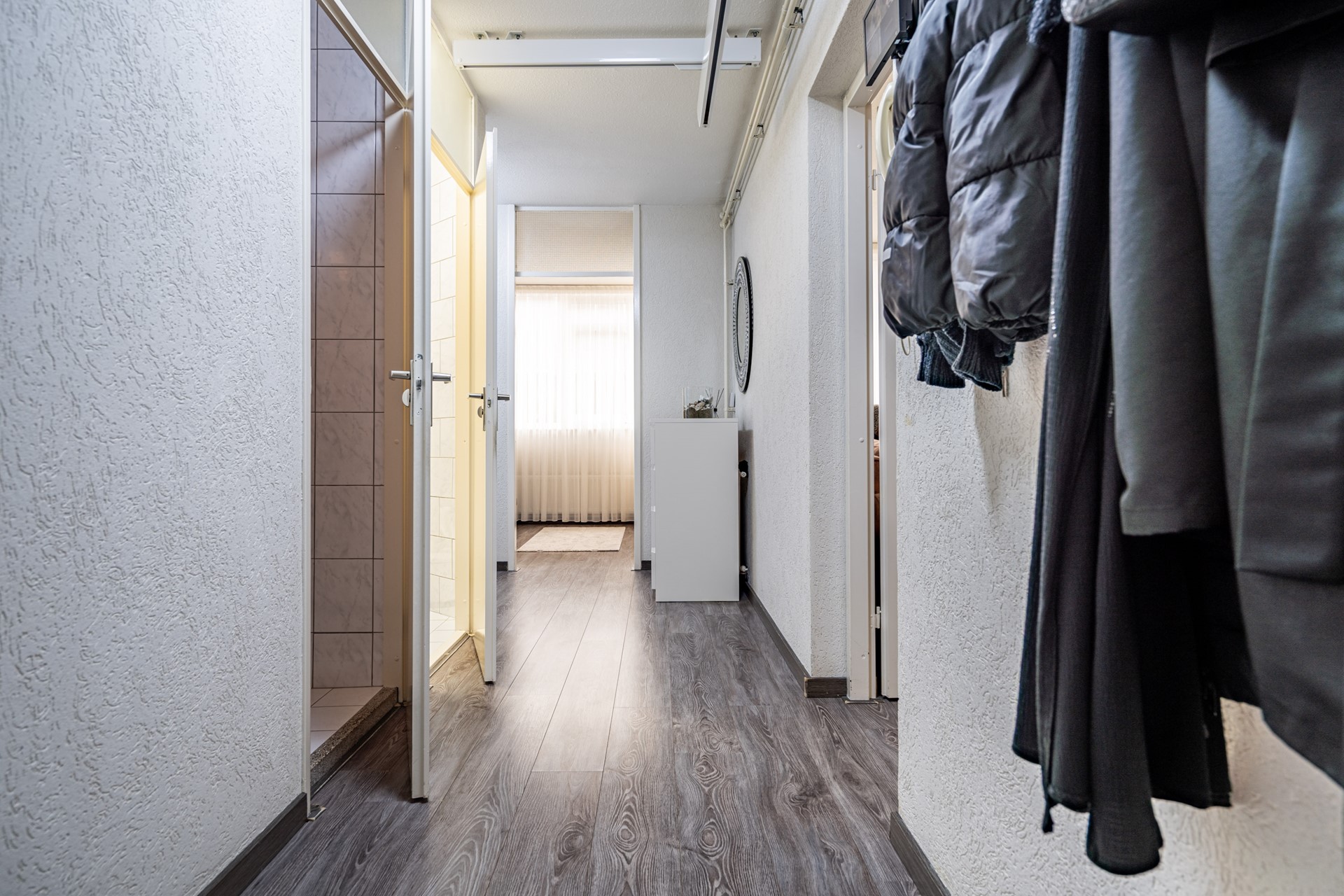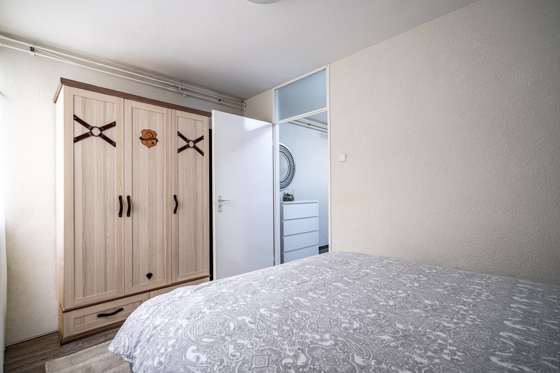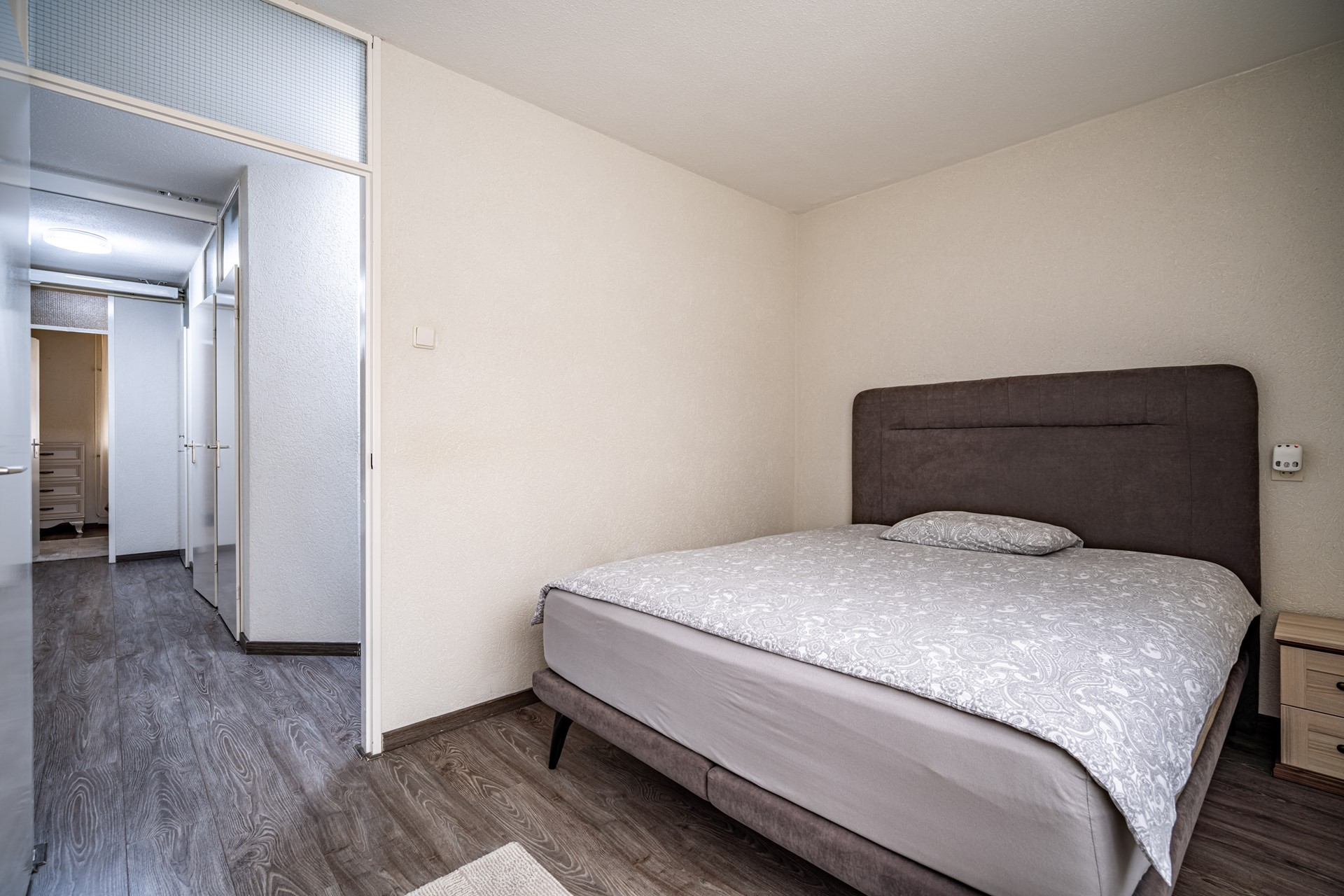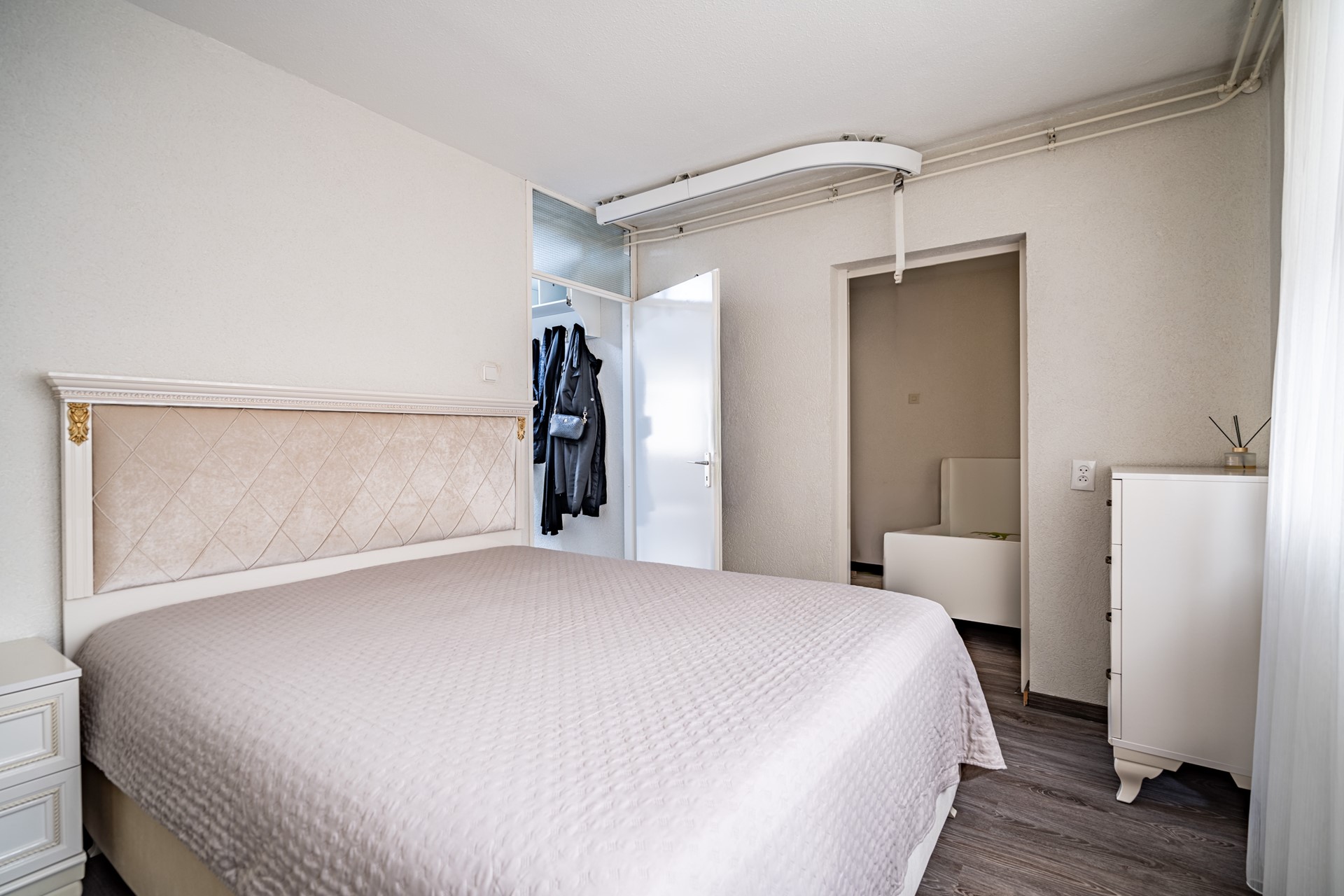 De woning beschikt over drie slaapkamers: een ruime master bedroom (ca. 12 m²), een tweede slaapkamer (ca. 10,5 m²) en een derde slaapkamer (ca. 6,5 m²) die ideaal kan dienen als kinder-, werk- of logeerkamer. De badkamer is aangepast voor mindervaliden en uitgerust met een wastafelmeubel, douche en een ligbad dat geschikt is voor invalidengebruik. Daarnaast is er een separaat toilet en een handige bergkast met wasmachineaansluiting.