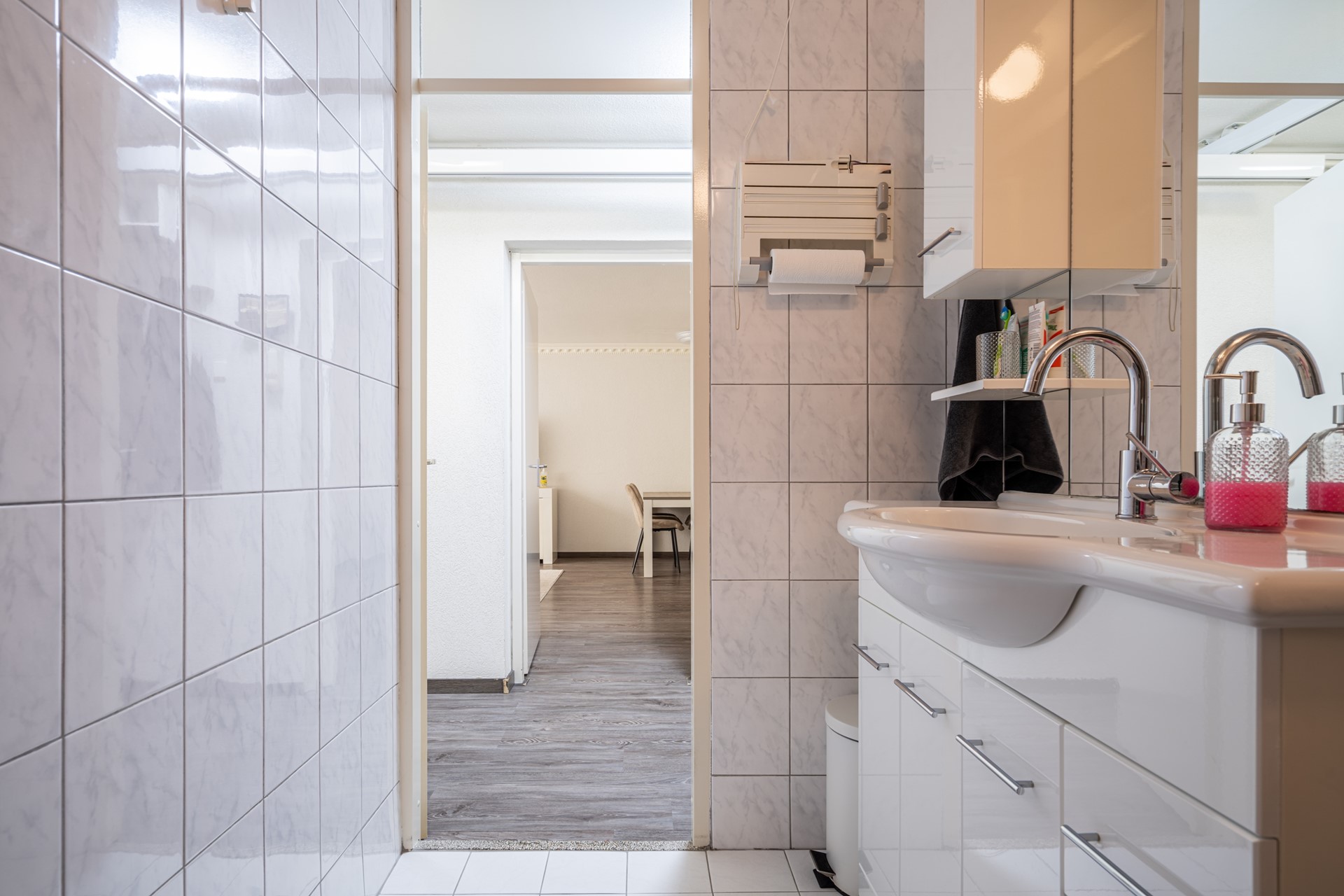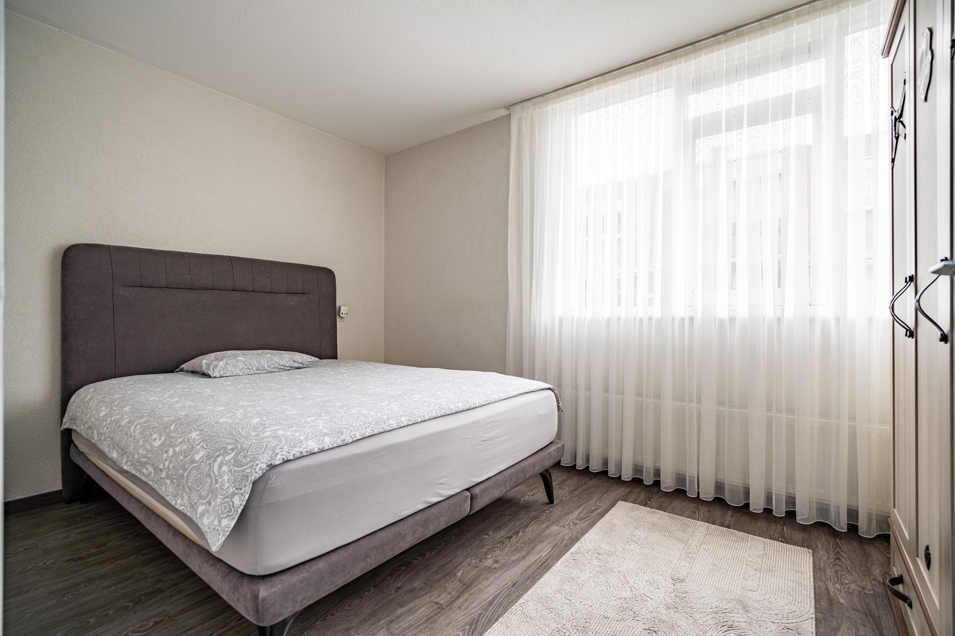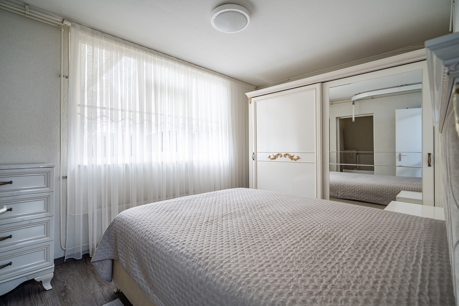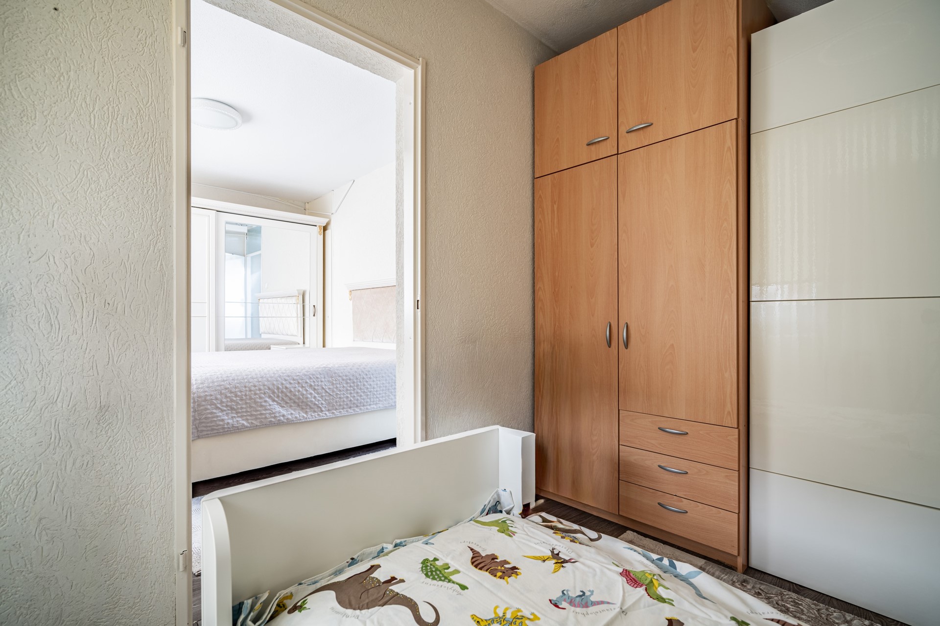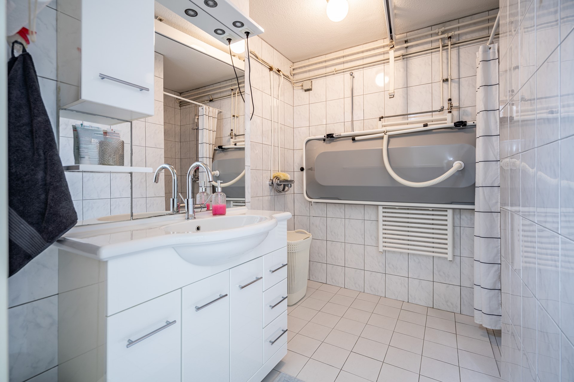 De woning beschikt over drie slaapkamers: een ruime master bedroom (ca. 12 m²), een tweede slaapkamer (ca. 10,5 m²) en een derde slaapkamer (ca. 6,5 m²) die ideaal kan dienen als kinder-, werk- of logeerkamer. De badkamer is aangepast voor mindervaliden en uitgerust met een wastafelmeubel, douche en een ligbad dat geschikt is voor invalidengebruik. Daarnaast is er een separaat toilet en een handige bergkast met wasmachineaansluiting.
