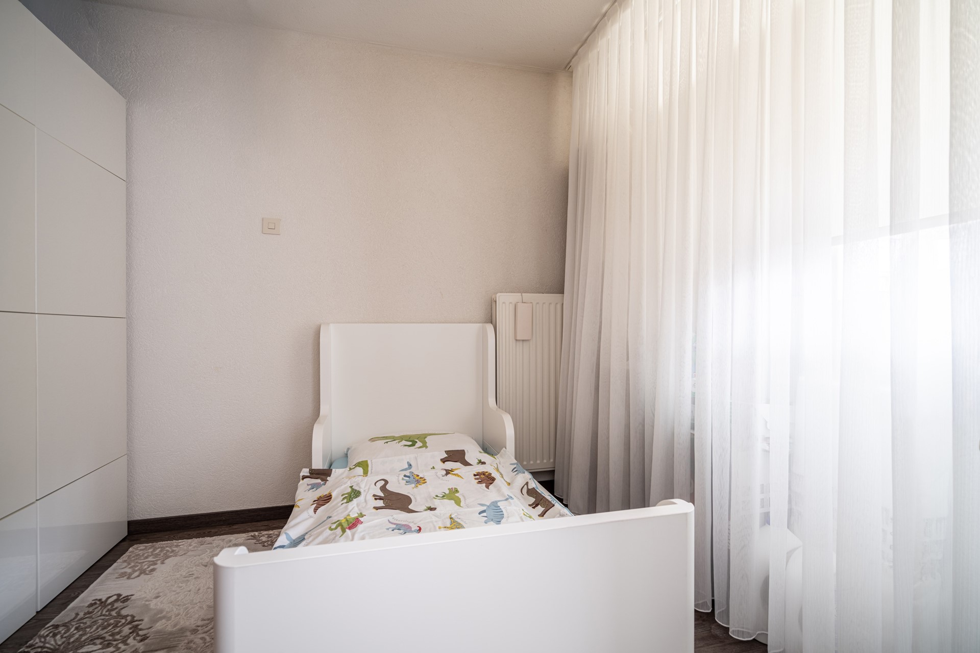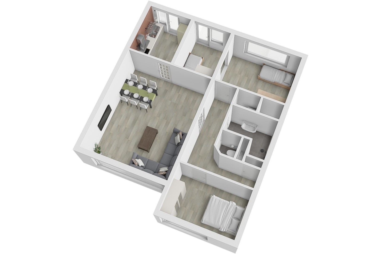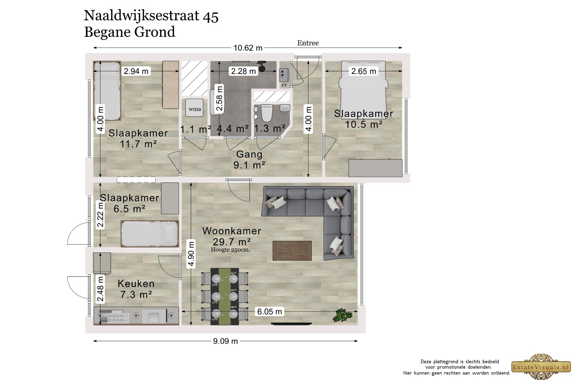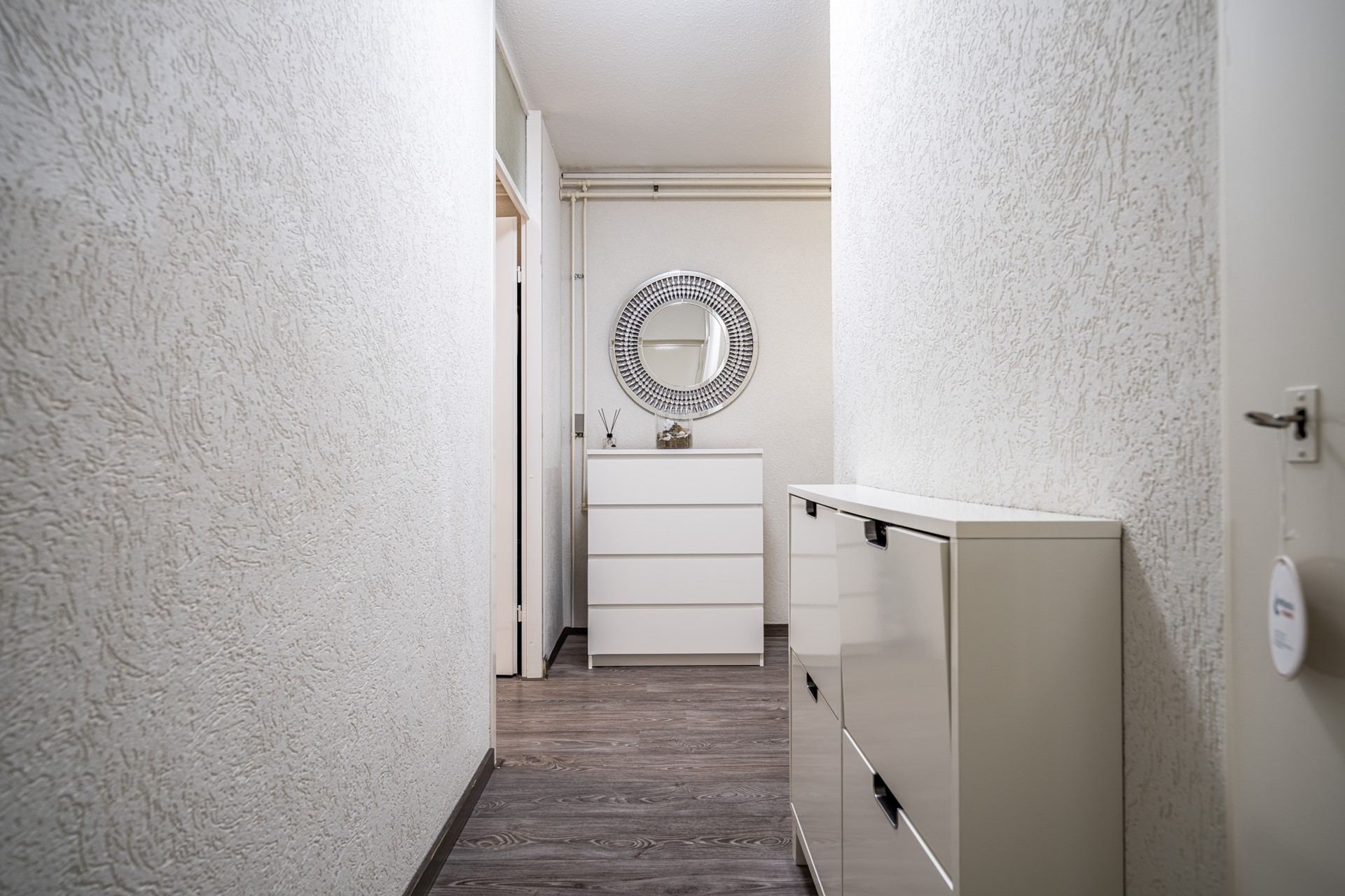 De woning beschikt over drie slaapkamers: een ruime master bedroom (ca. 12 m²), een tweede slaapkamer (ca. 10,5 m²) en een derde slaapkamer (ca. 6,5 m²) die ideaal kan dienen als kinder-, werk- of logeerkamer. De badkamer is aangepast voor mindervaliden en uitgerust met een wastafelmeubel, douche en een ligbad dat geschikt is voor invalidengebruik. Daarnaast is er een separaat toilet en een handige bergkast met wasmachineaansluiting.