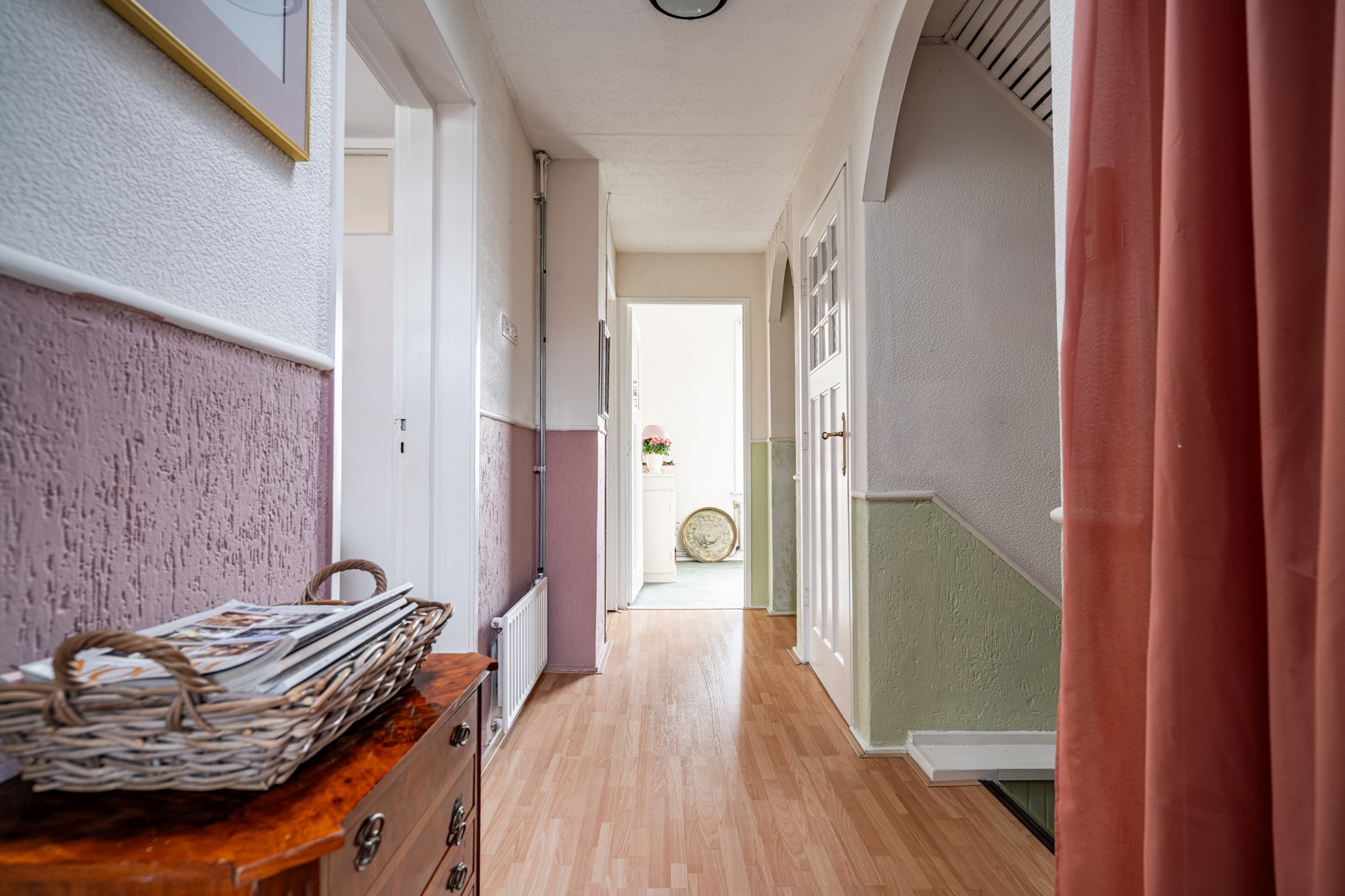 Via the entrance and stairwell, you reach the apartment. This level features the spacious and bright living room with wooden window frames and double glazing. The living room offers ample space for a comfortable seating and dining area. The kitchen is practically arranged and provides access to the north-facing balcony. In addition, there is a separate toilet with a wall-mounted washbasin on this floor.