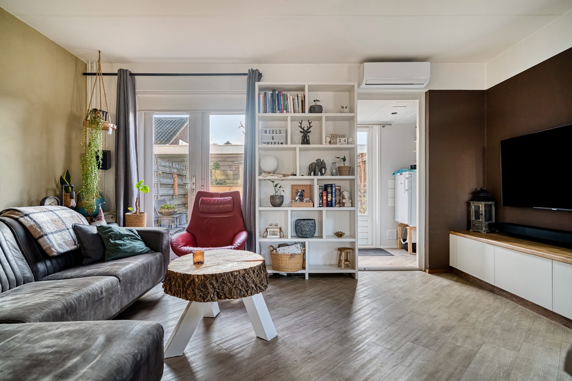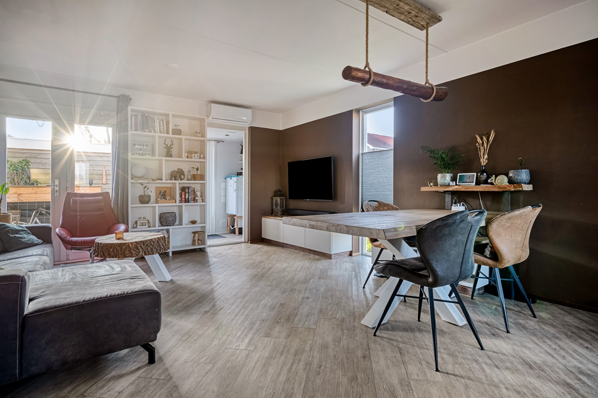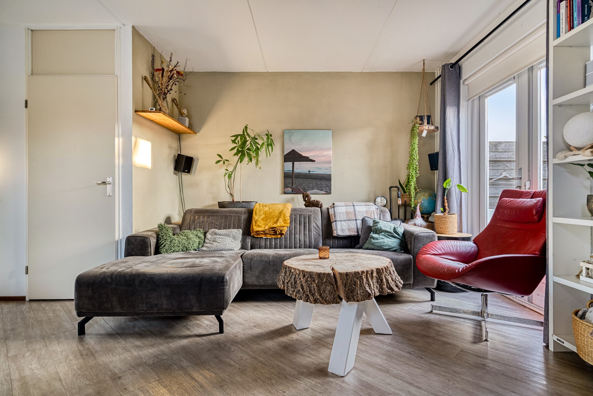 De woonkamer is direct een fijne verrassing: strak afgewerkt met een laminaatvloer en gestucte wanden, heerlijk licht door de hoekligging en het zijraam, en volledig tuingericht. Zowel radiatoren als airconditioning zorgen hier voor aangename temperaturen in elk seizoen.