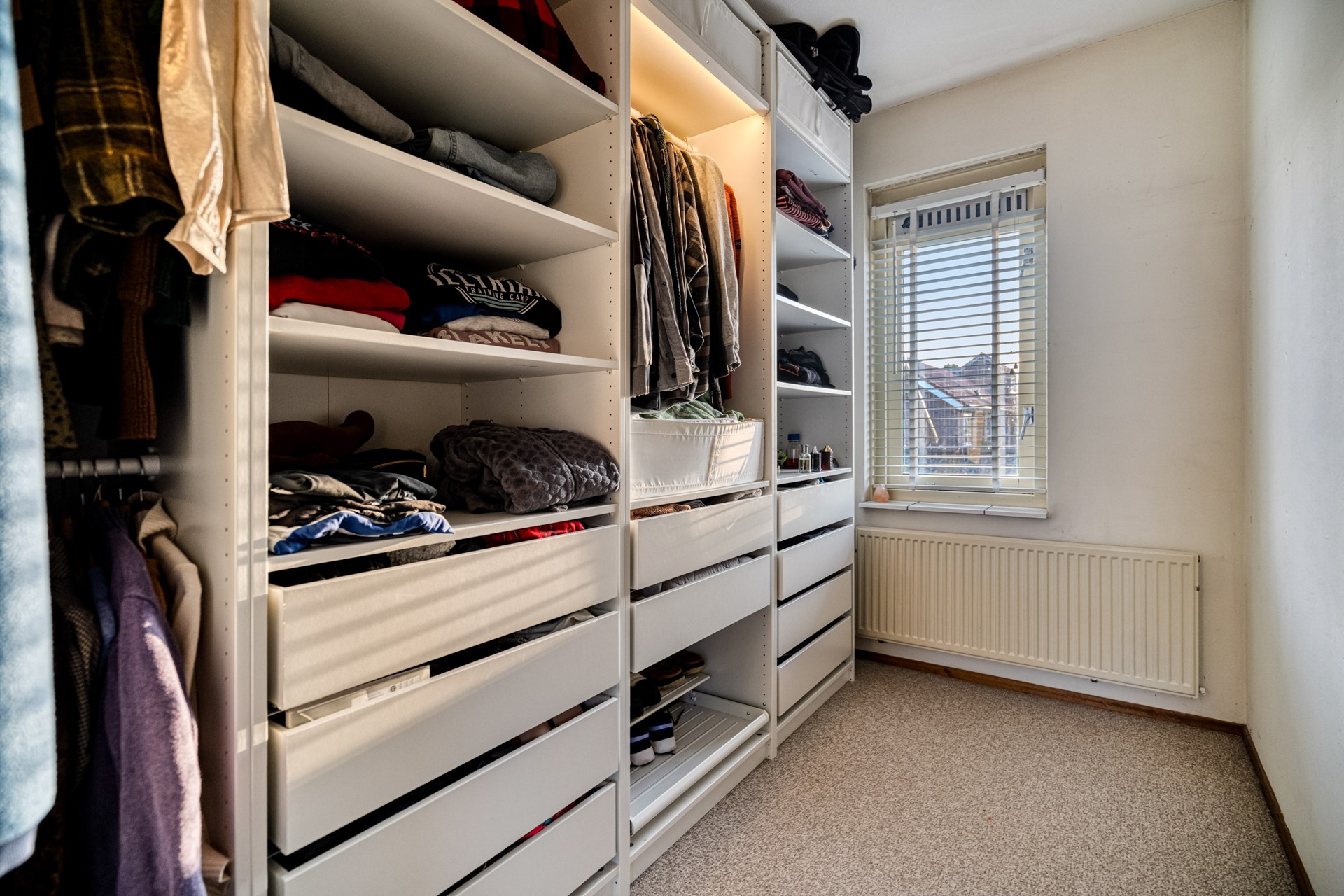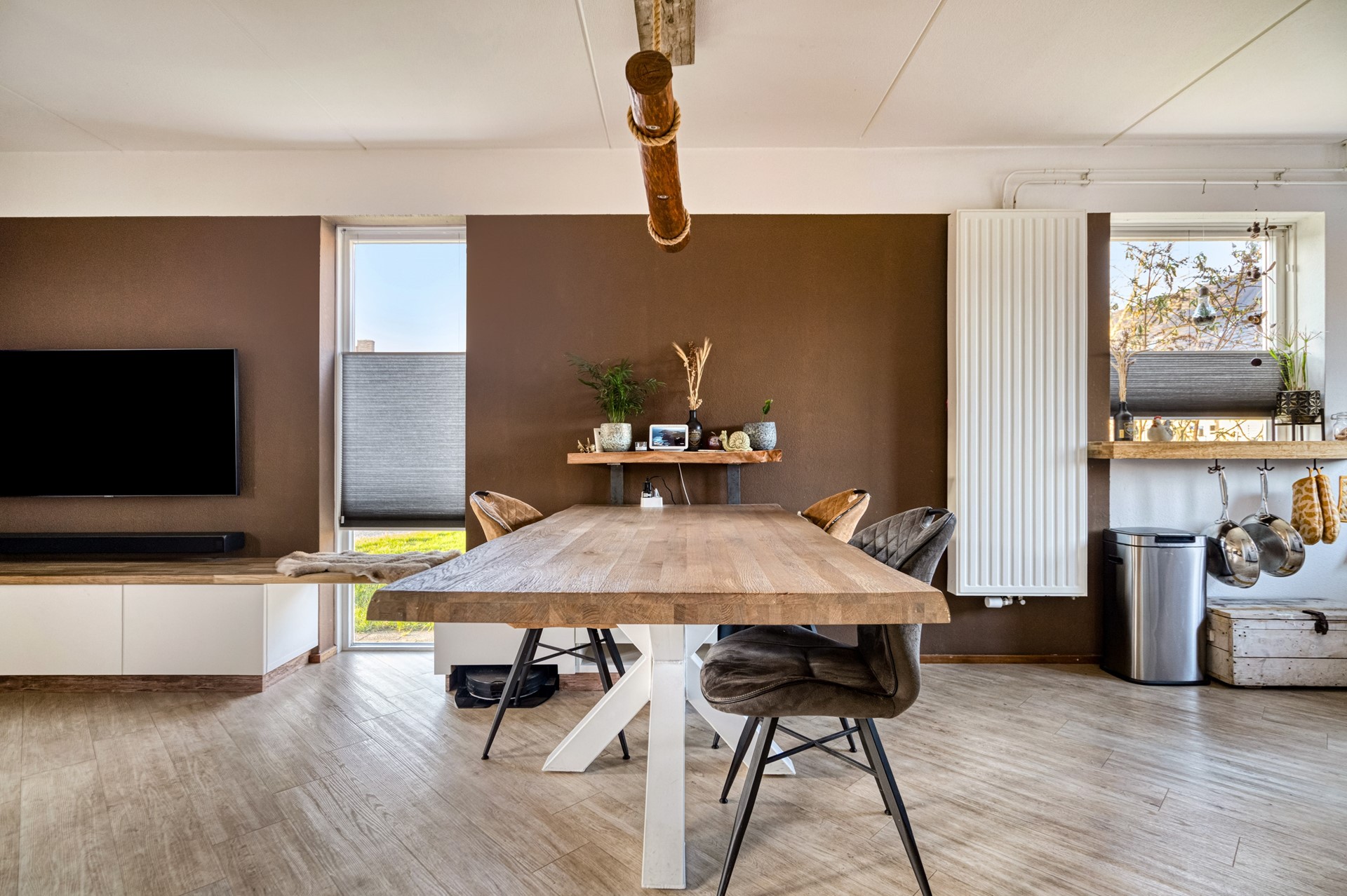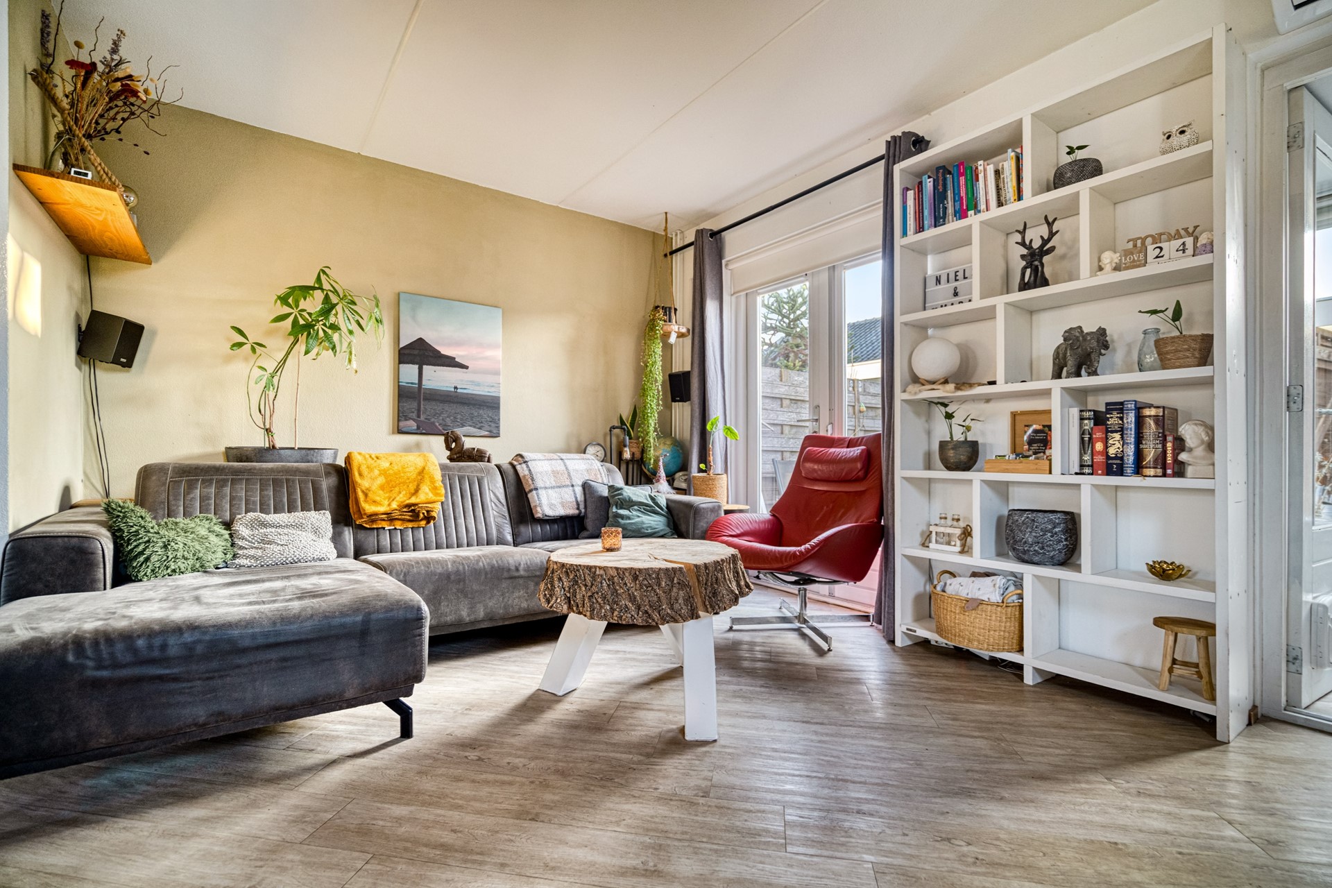 De woonkamer is direct een fijne verrassing: strak afgewerkt met een laminaatvloer en gestucte wanden, heerlijk licht door de hoekligging en het zijraam, en volledig tuingericht. Zowel radiatoren als airconditioning zorgen hier voor aangename temperaturen in elk seizoen.