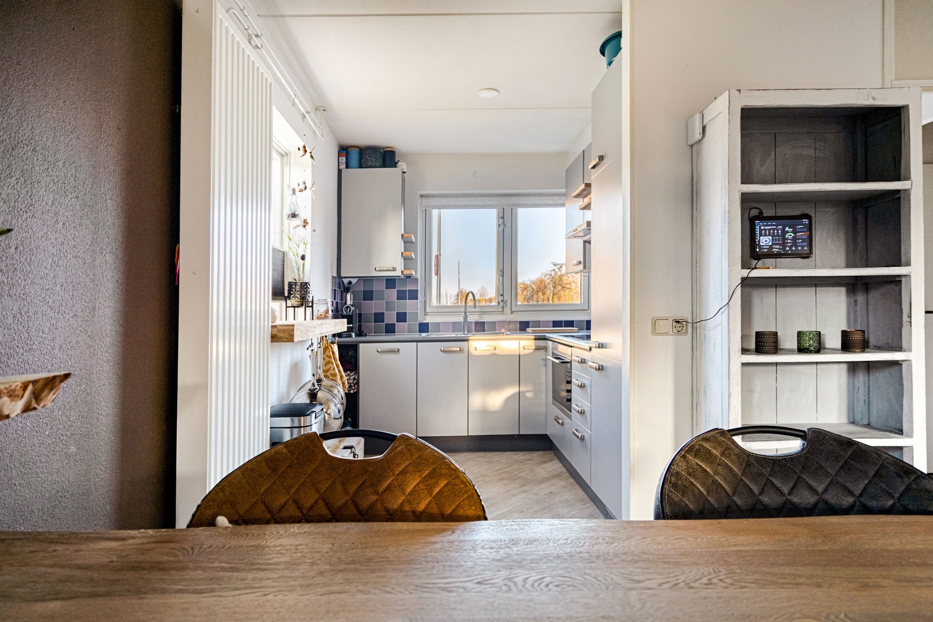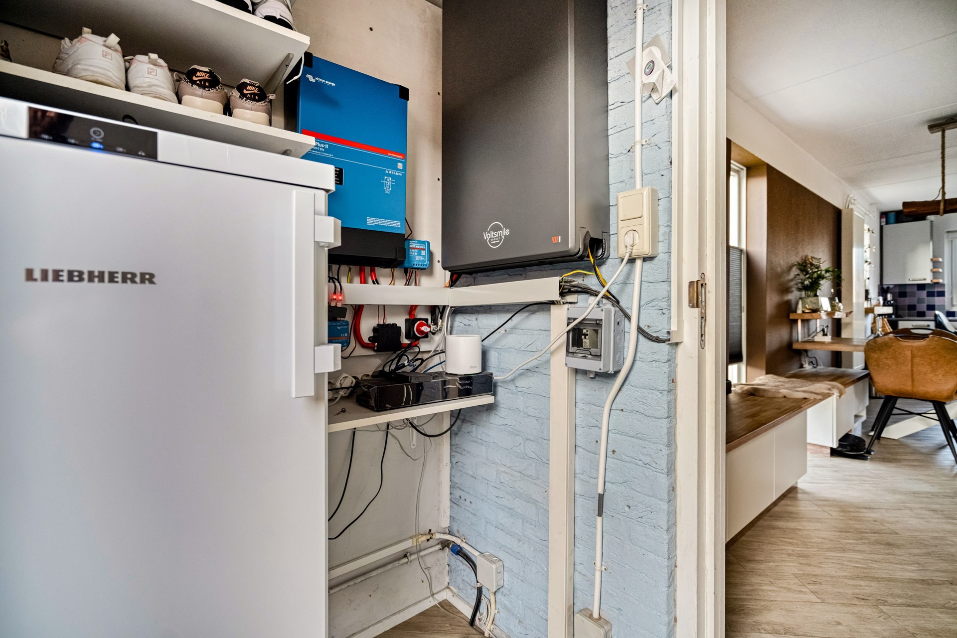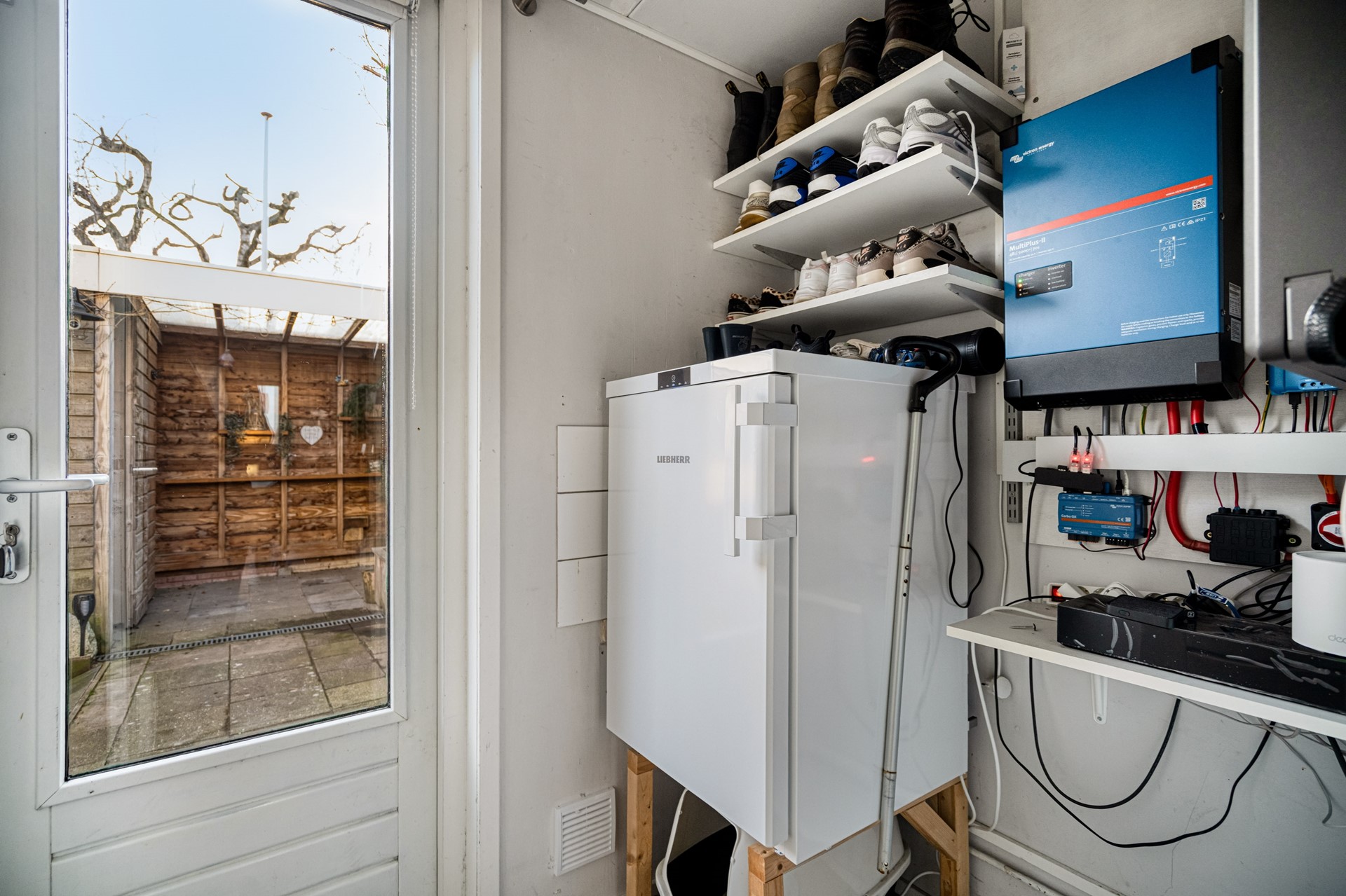 Aangrenzend aan de woonkamer ligt de bijkeuken, met extra vriezer en de technische ruimte waar de omvormer en de thuisbatterij (ter overname) zijn geplaatst. Ook vanuit hier heeft u toegang tot de achtertuin.