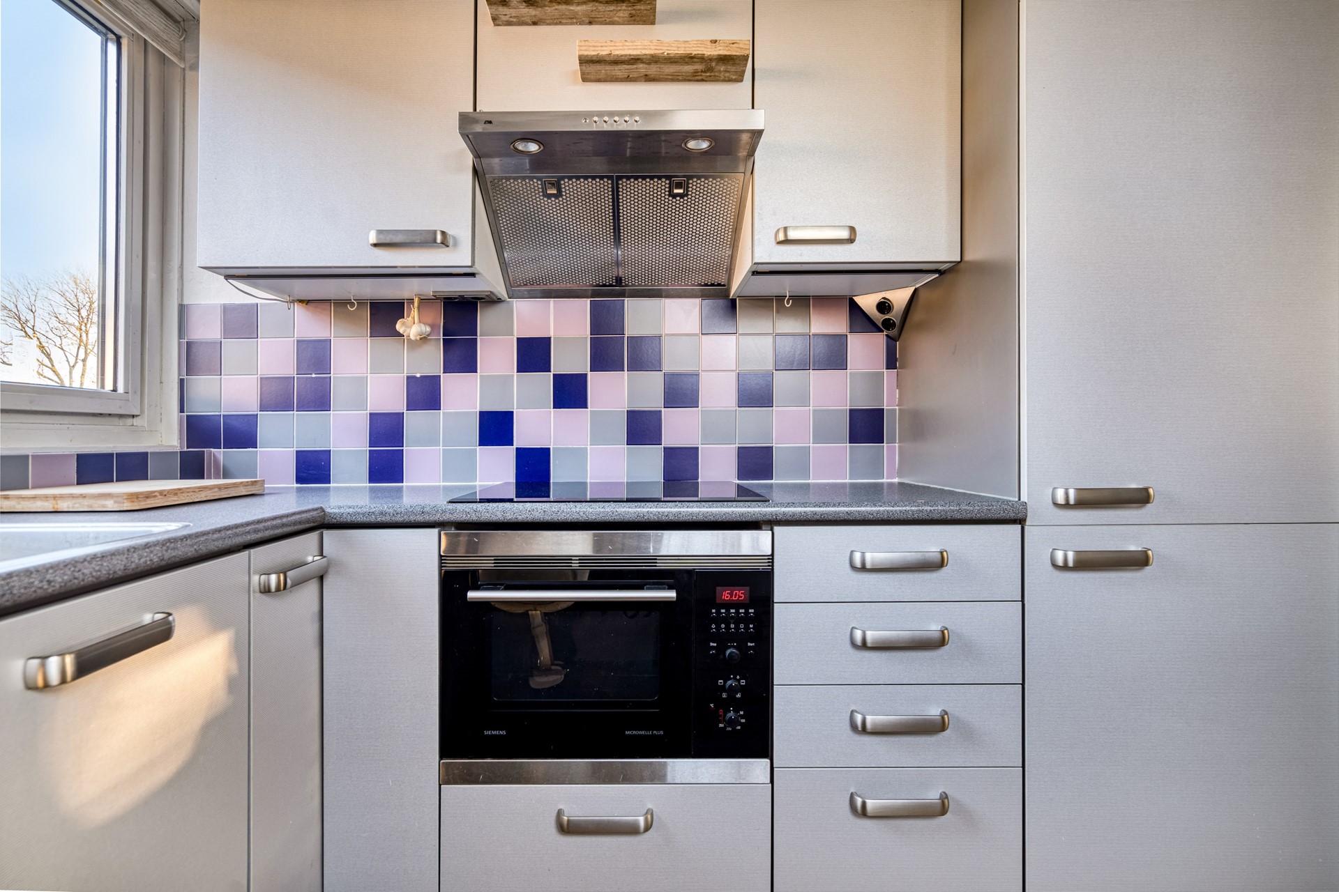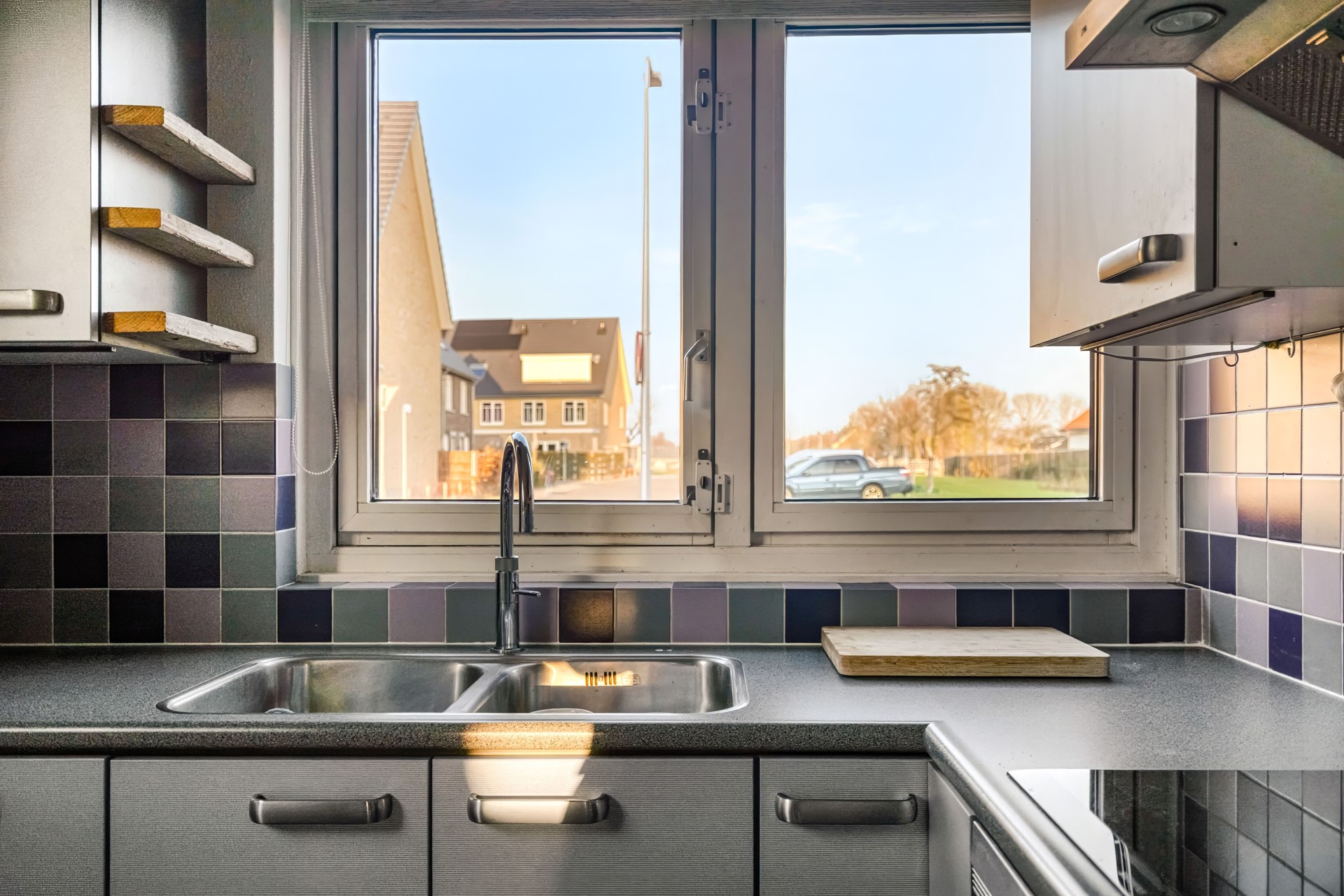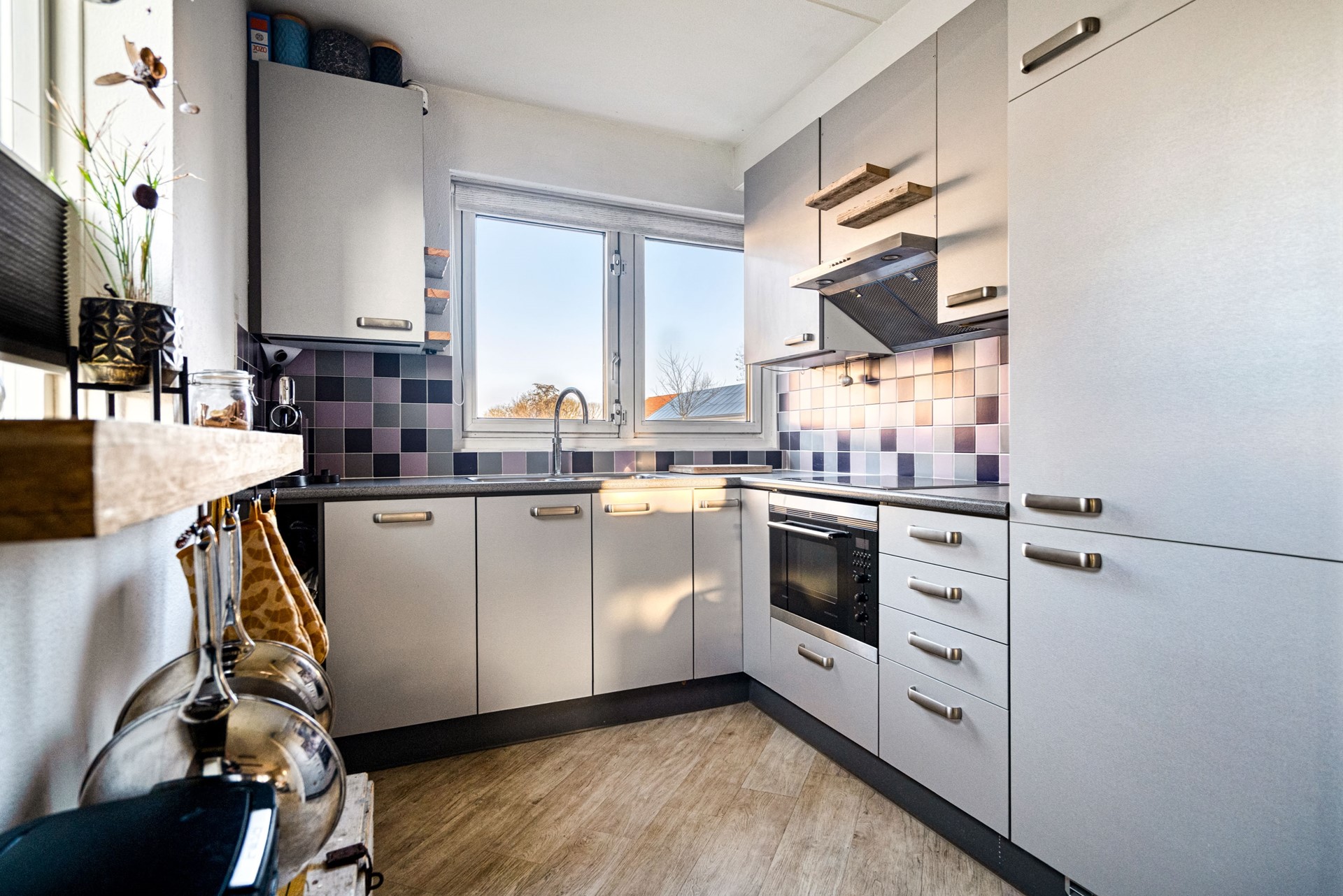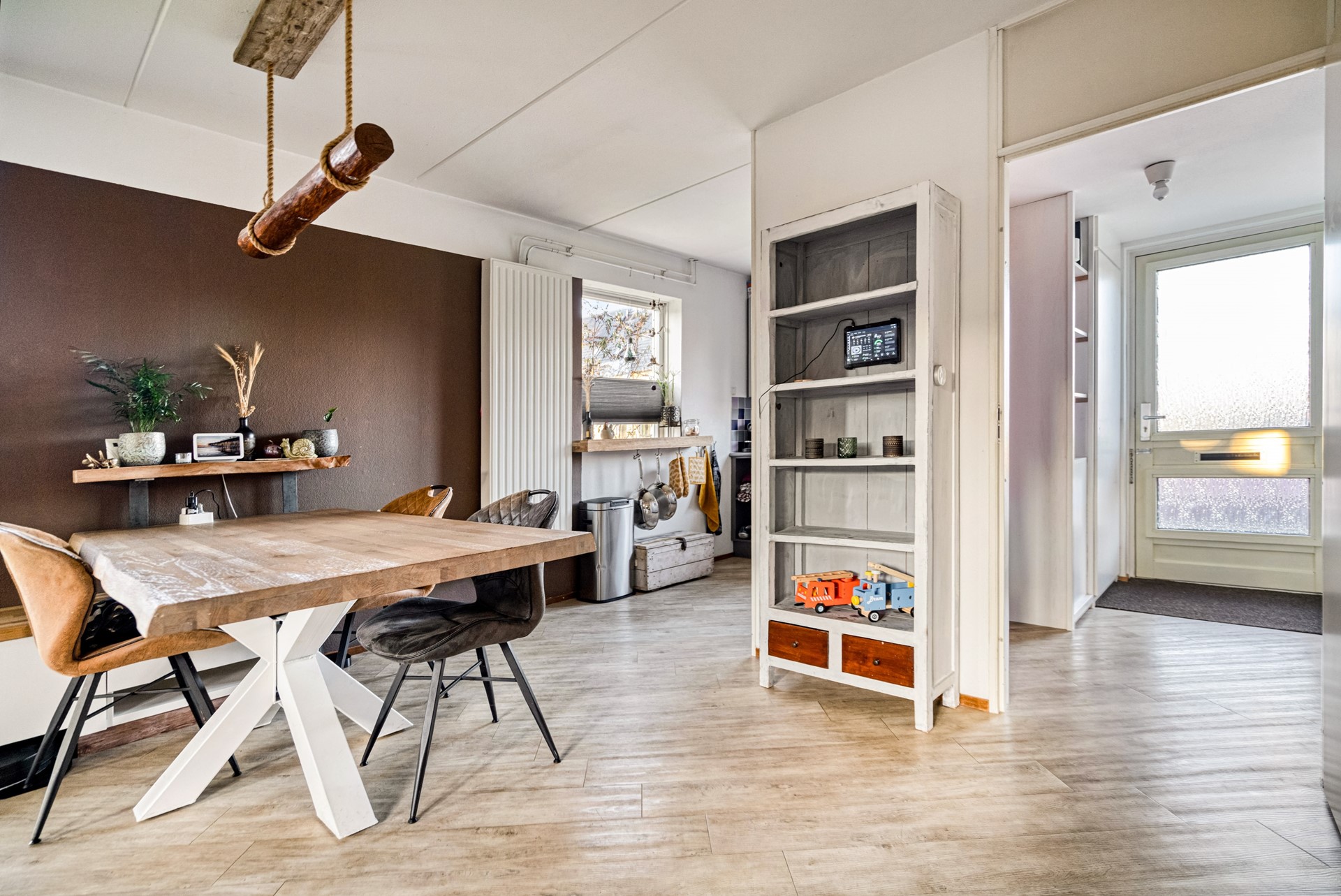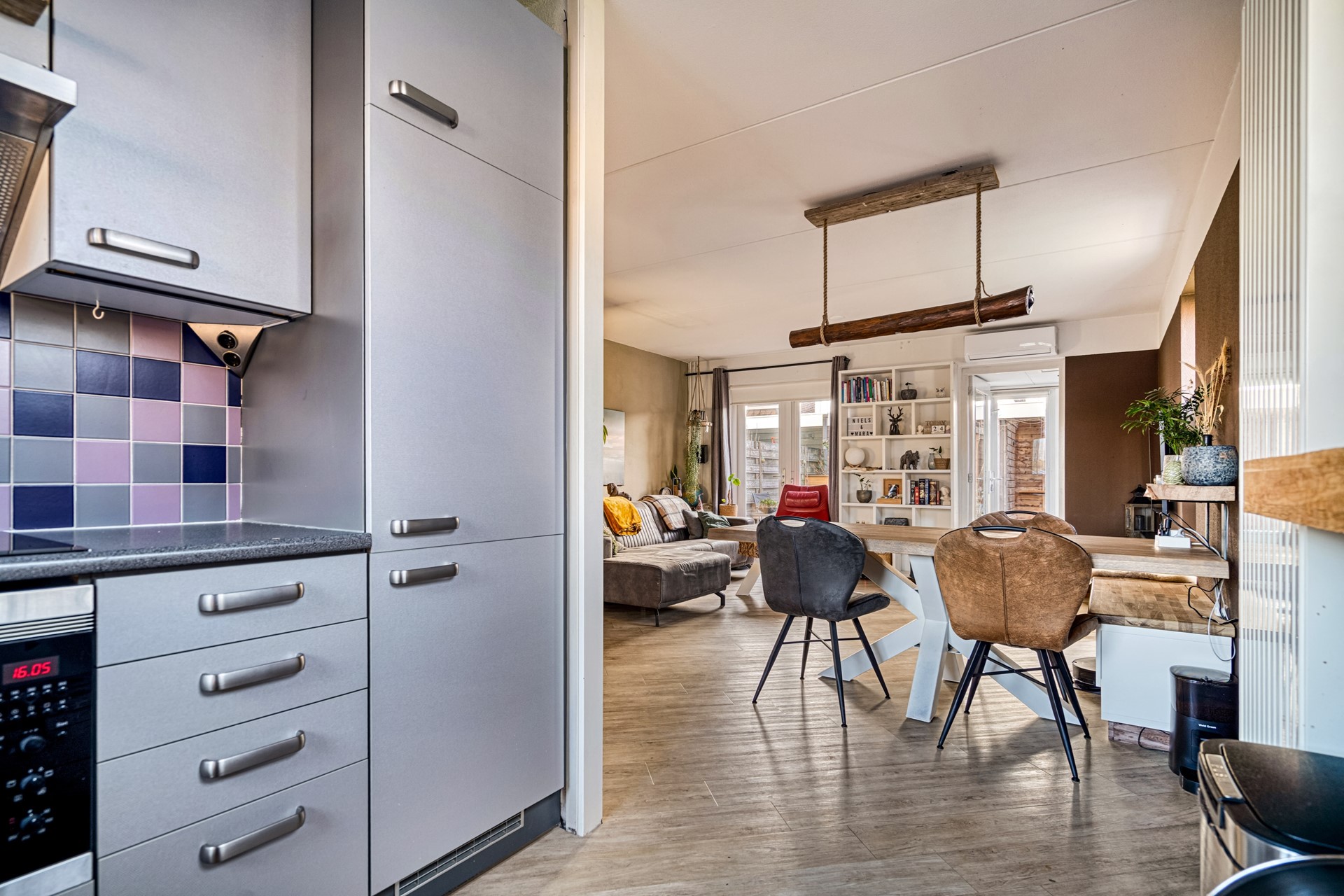 Aan de voorzijde van de woning bevindt zich de keuken, compleet uitgerust met een inductiekookplaat, oven met magnetronfunctie, afzuigkap, vaatwasser en koel-vriescombinatie – praktisch en modern, met uitzicht op de straat.