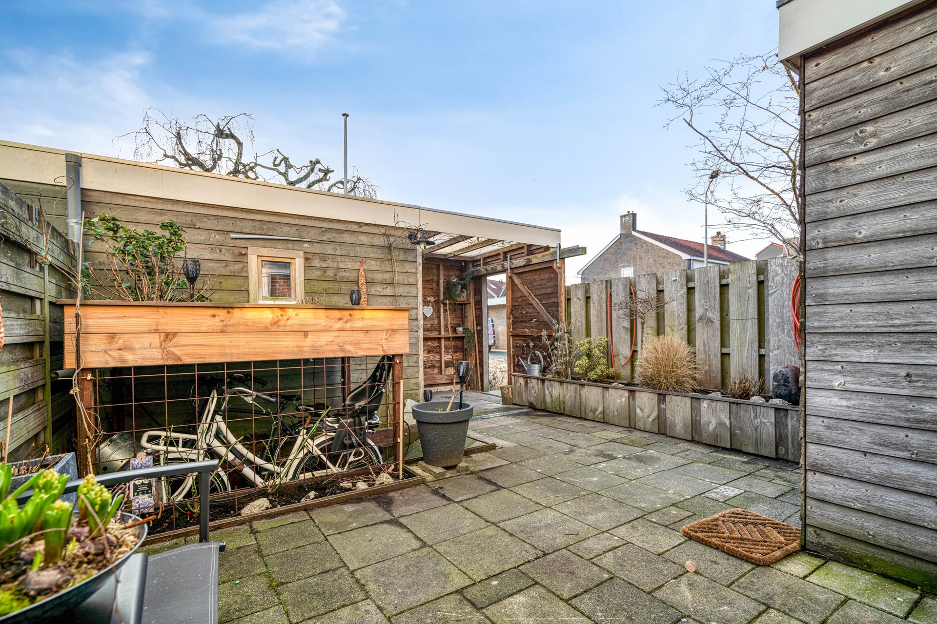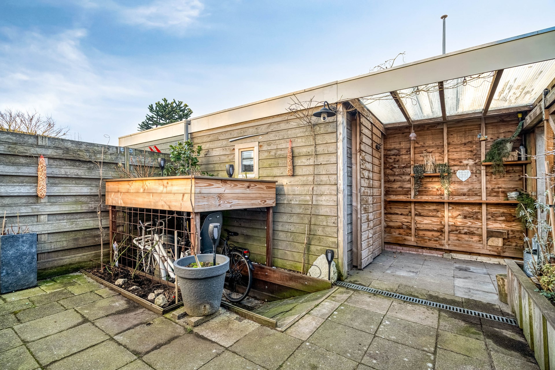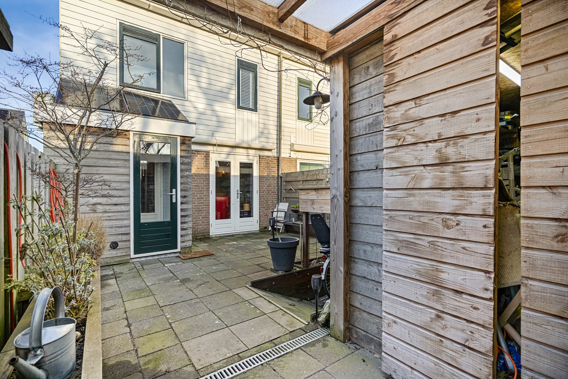De zonnige achtertuin op het zuiden maakt het plaatje compleet. De 10 zonnepanelen leveren hier een mooie opbrengst. U beschikt over een fijne overkapping en een berging met elektra. De huidige eigenaar heeft zelfs een slimme extra deur gerealiseerd, zodat een motor eenvoudig en droog binnen kan worden gestald.