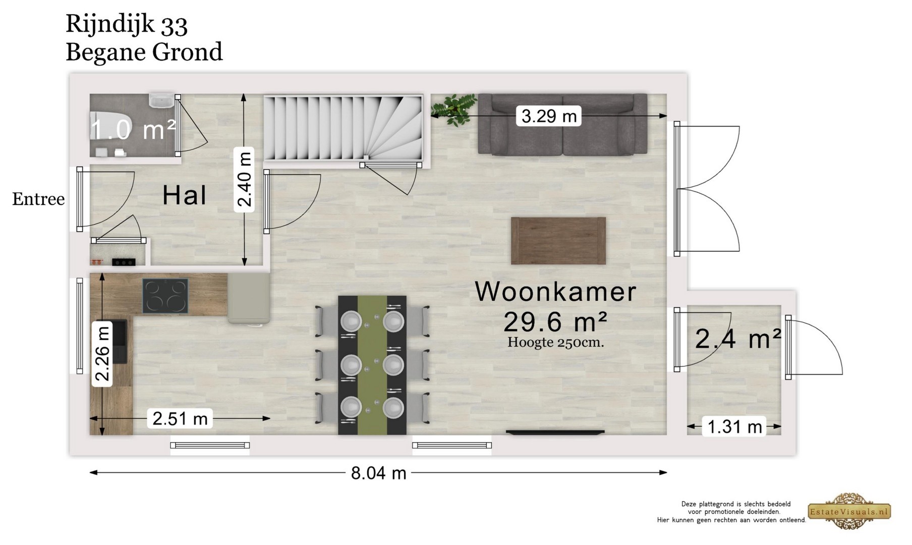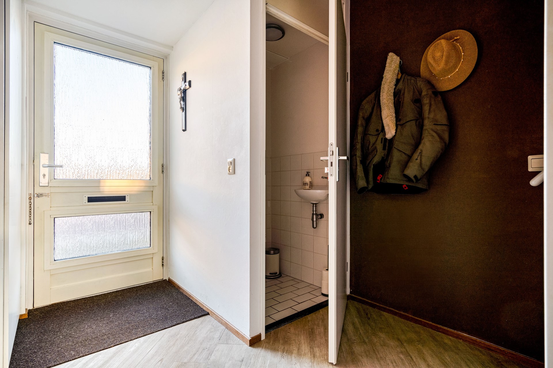 Via de voortuin bereiken we de entree van deze eindwoning. In de hal vindt u het toilet, de meterkast met waterontharder (een luxe die u dagelijks merkt) en de vaste trap naar boven.