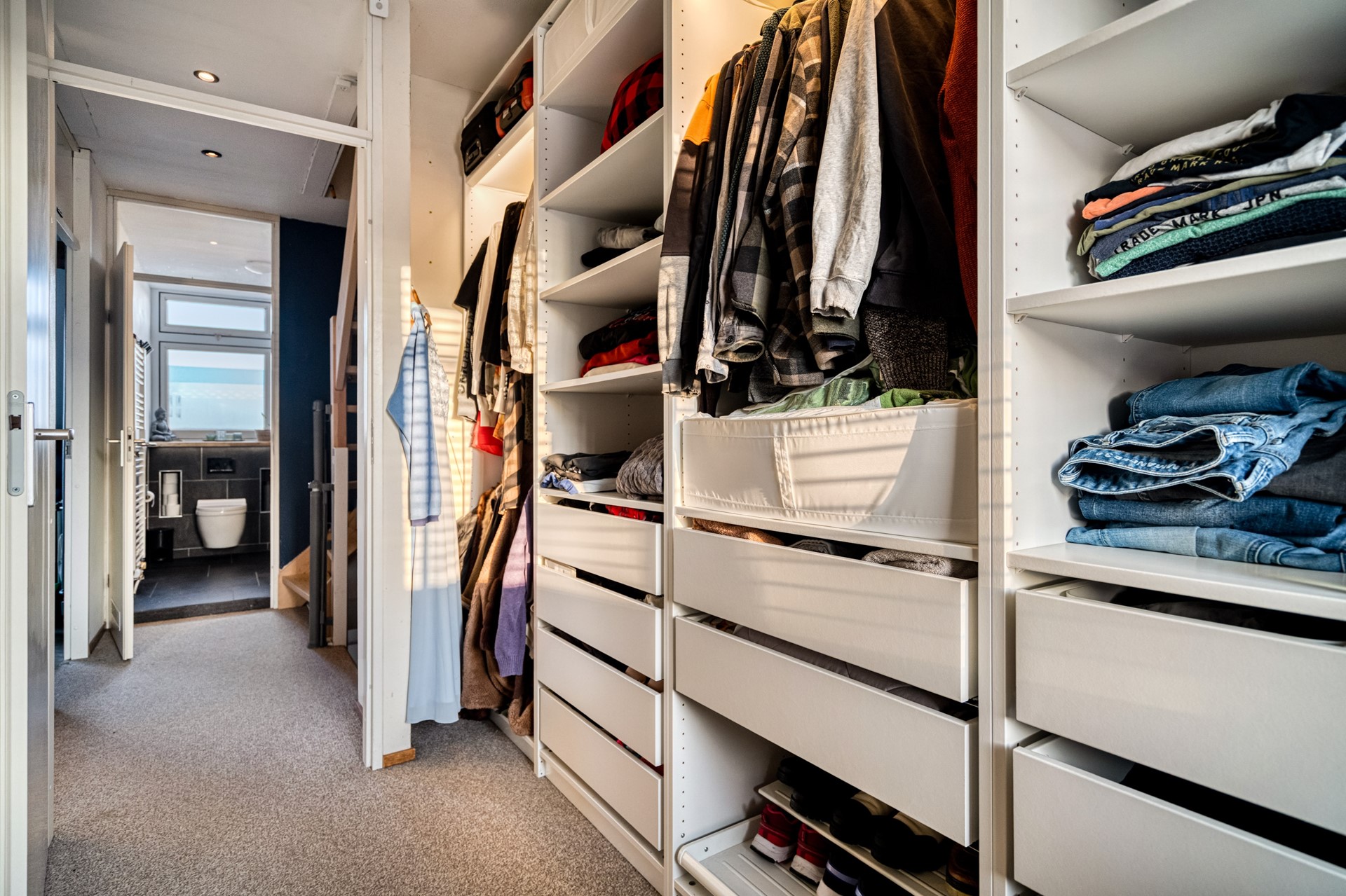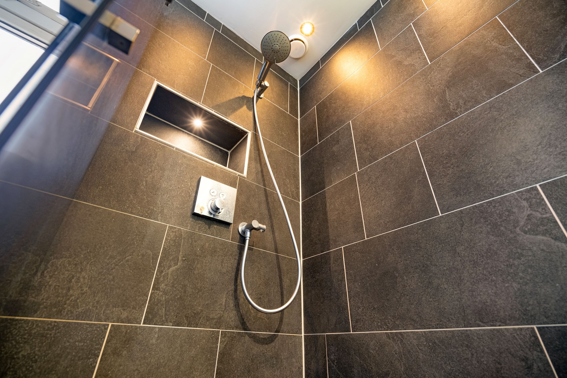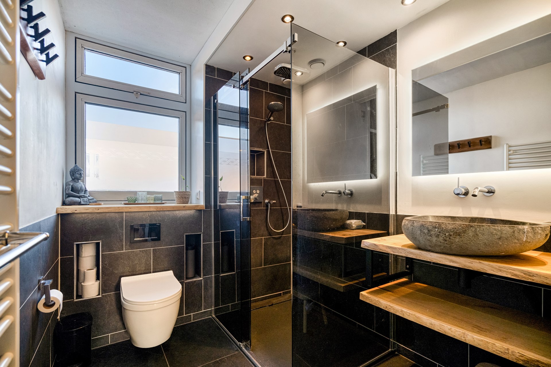 De badkamer is uitgevoerd met een inloopdouche, wastafelmeubel en tweede toilet. Dankzij de waterontharder is zelfs de badkamer met donkere tegels nog in nieuwstaat, zonder storende kalkaanslag.