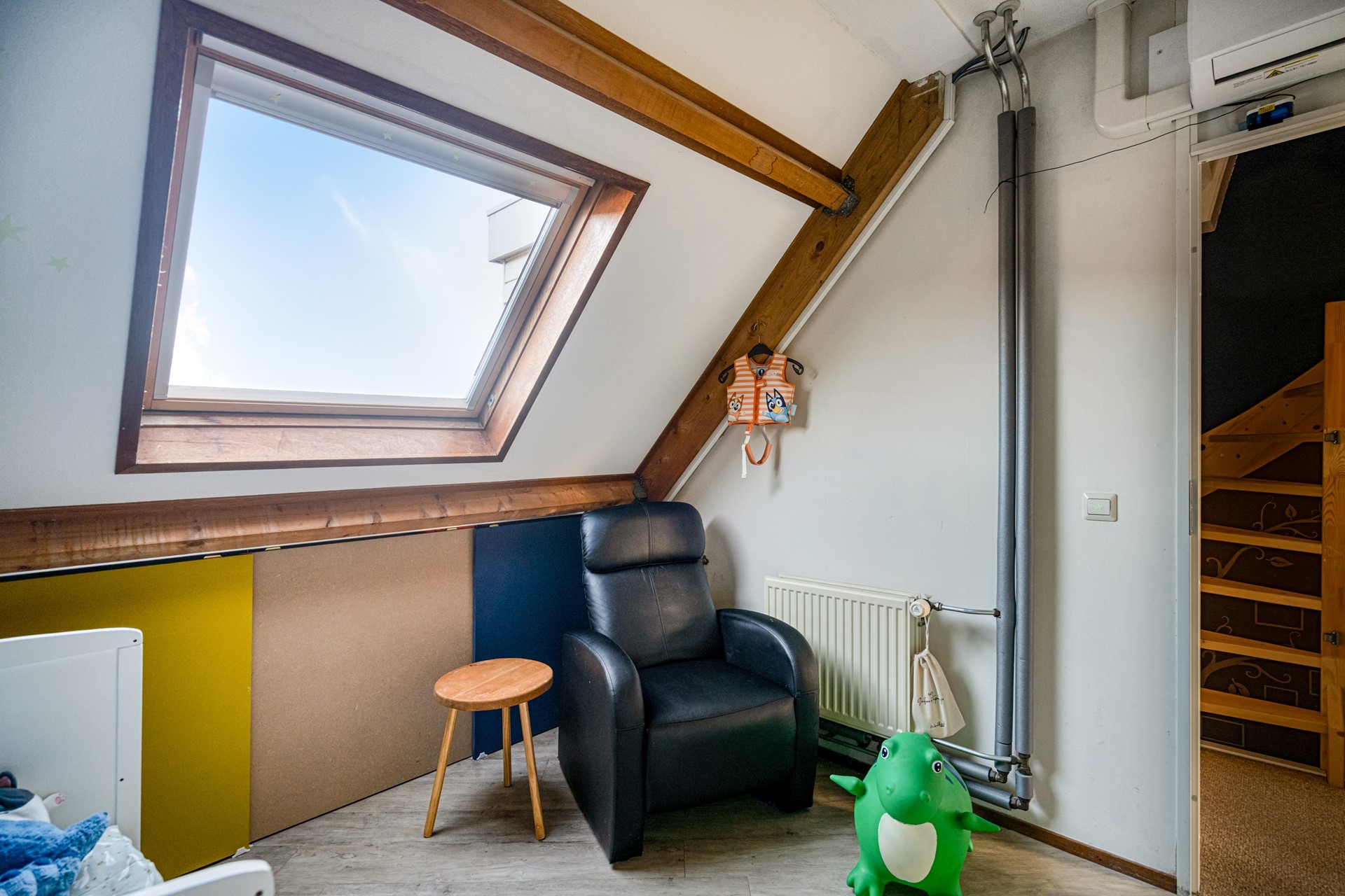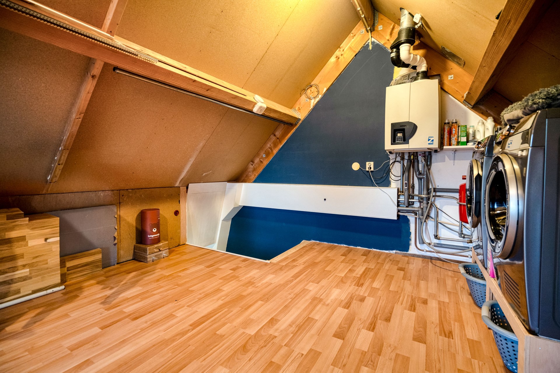 Via de vaste trap bereiken we de tweede verdieping. Hier vindt u de opstelplaats van de CV-ketel, wasmachine en droger. Daarnaast is hier een prettige werkplek gecreëerd. Deze ruimte leent zich uitstekend voor het realiseren van een vierde slaapkamer, eventueel met een extra Velux dakraam voor nog meer licht.