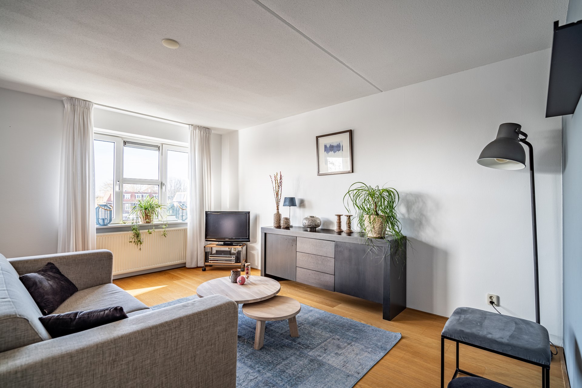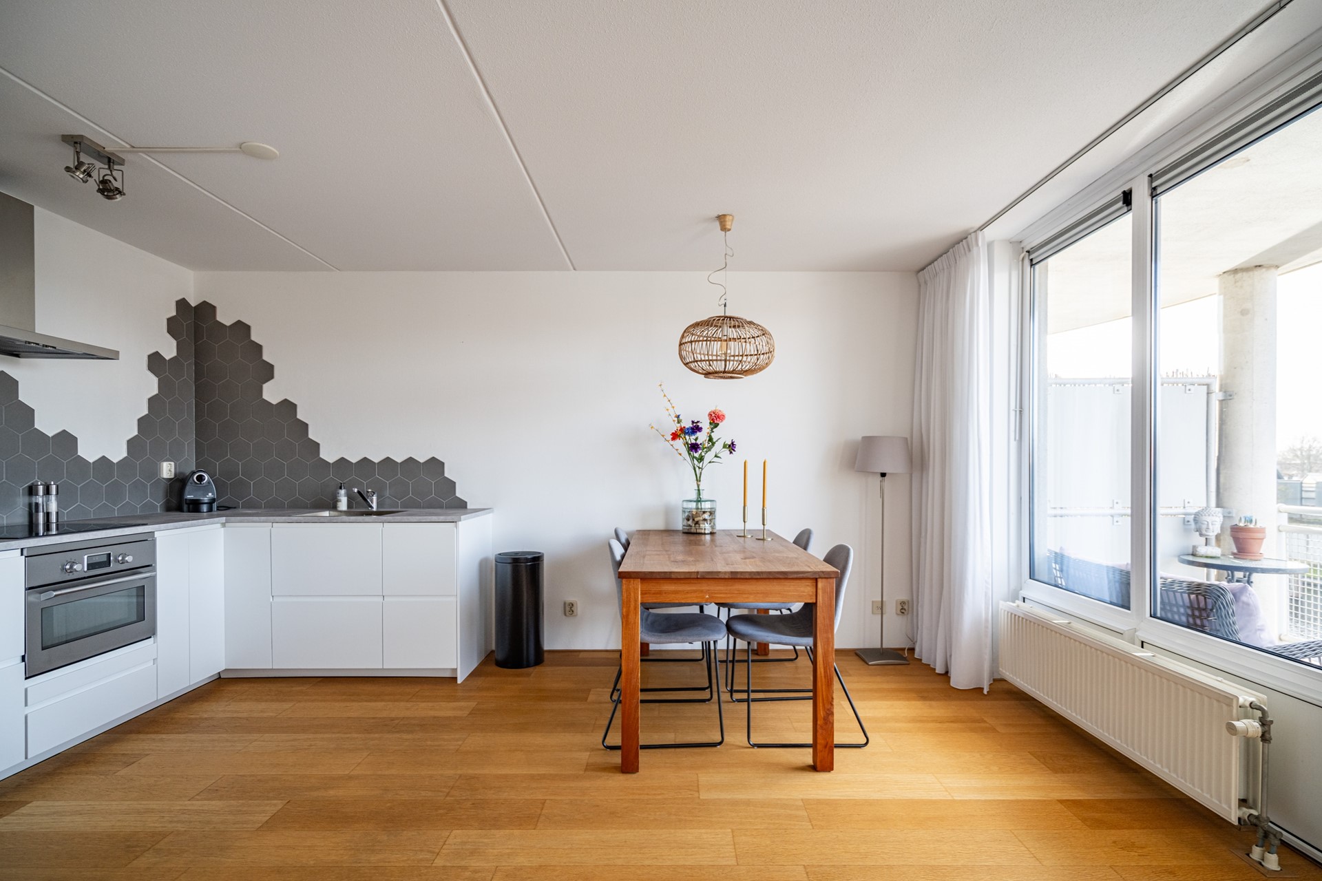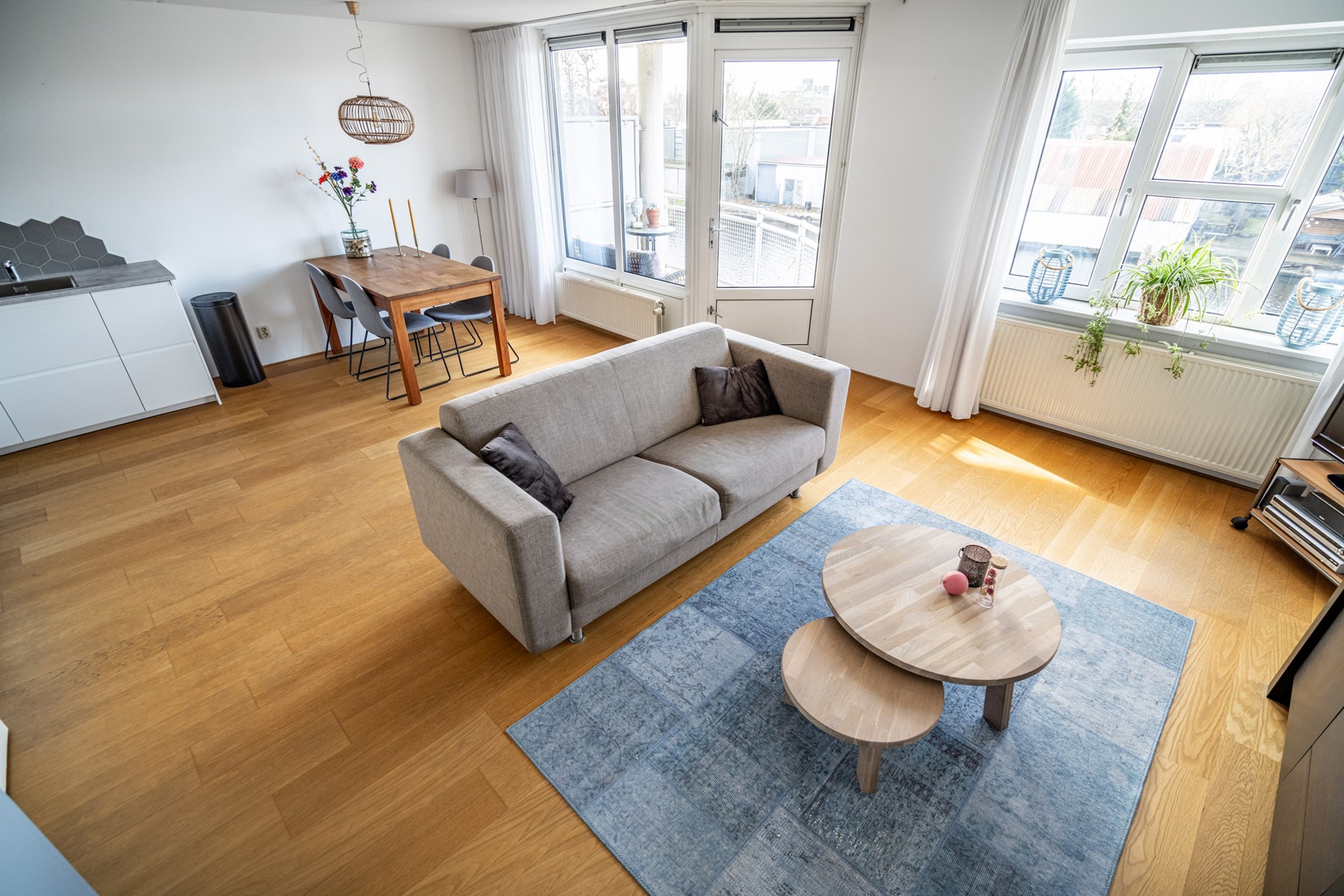 Aan het einde van de hal loop je de woonkamer in. Dit is echt het hart van de woning: een royale en lichte leefruimte met grote raampartijen en een mooie hoekligging. Hierdoor valt het daglicht van meerdere kanten naar binnen en heb je een leuk uitzicht richting het water en de omgeving. Hier is meer dan genoeg ruimte voor een comfortabele zithoek én een grote eettafel.