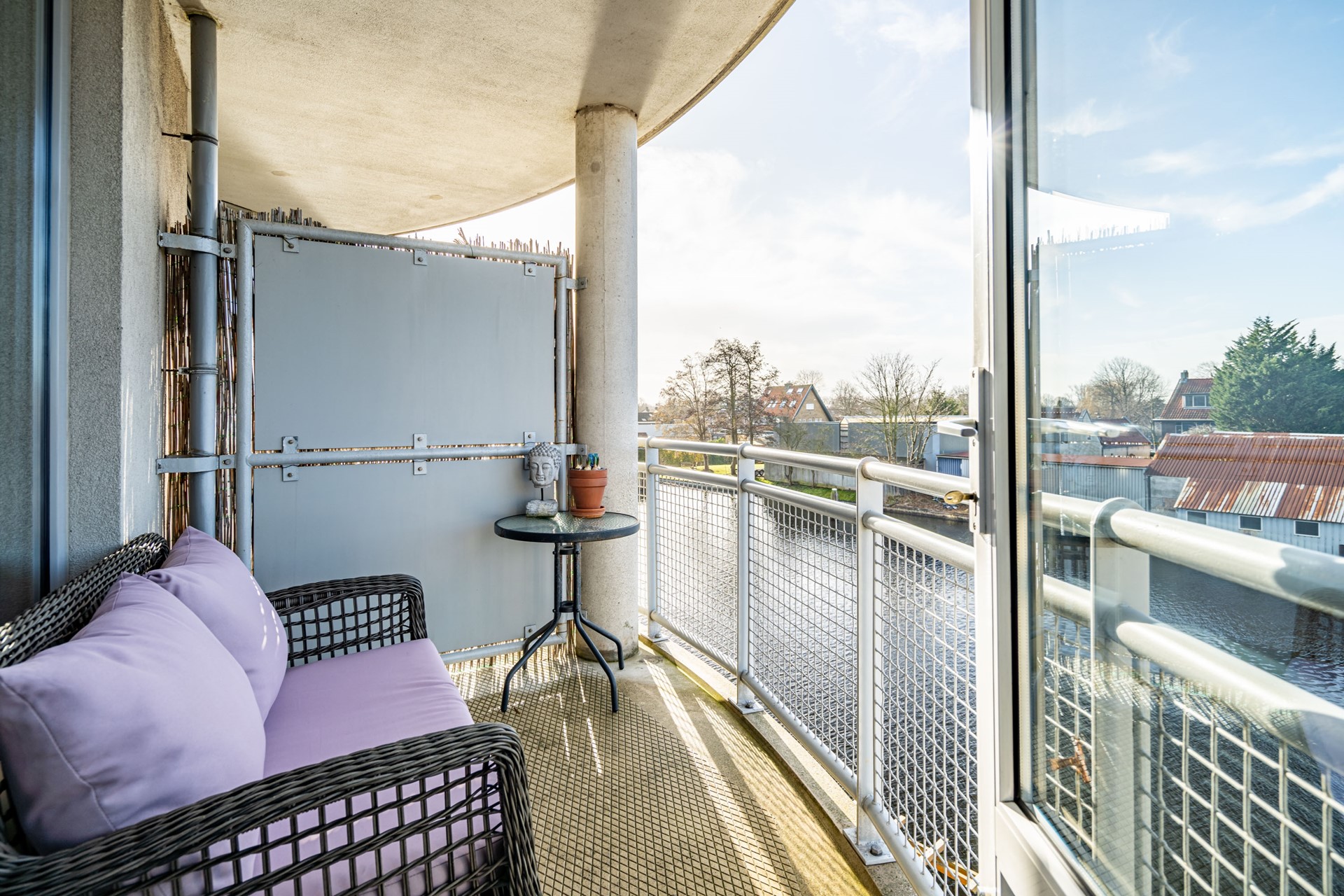 Vanuit de woonkamer stap je zo het balkon op. Een fijne plek om de gehele dag met een kop koffie te genieten van de zon. Vanaf het ruime en beschutte balkon kan je genieten van het uitzicht en de bootjes die langsvaren.