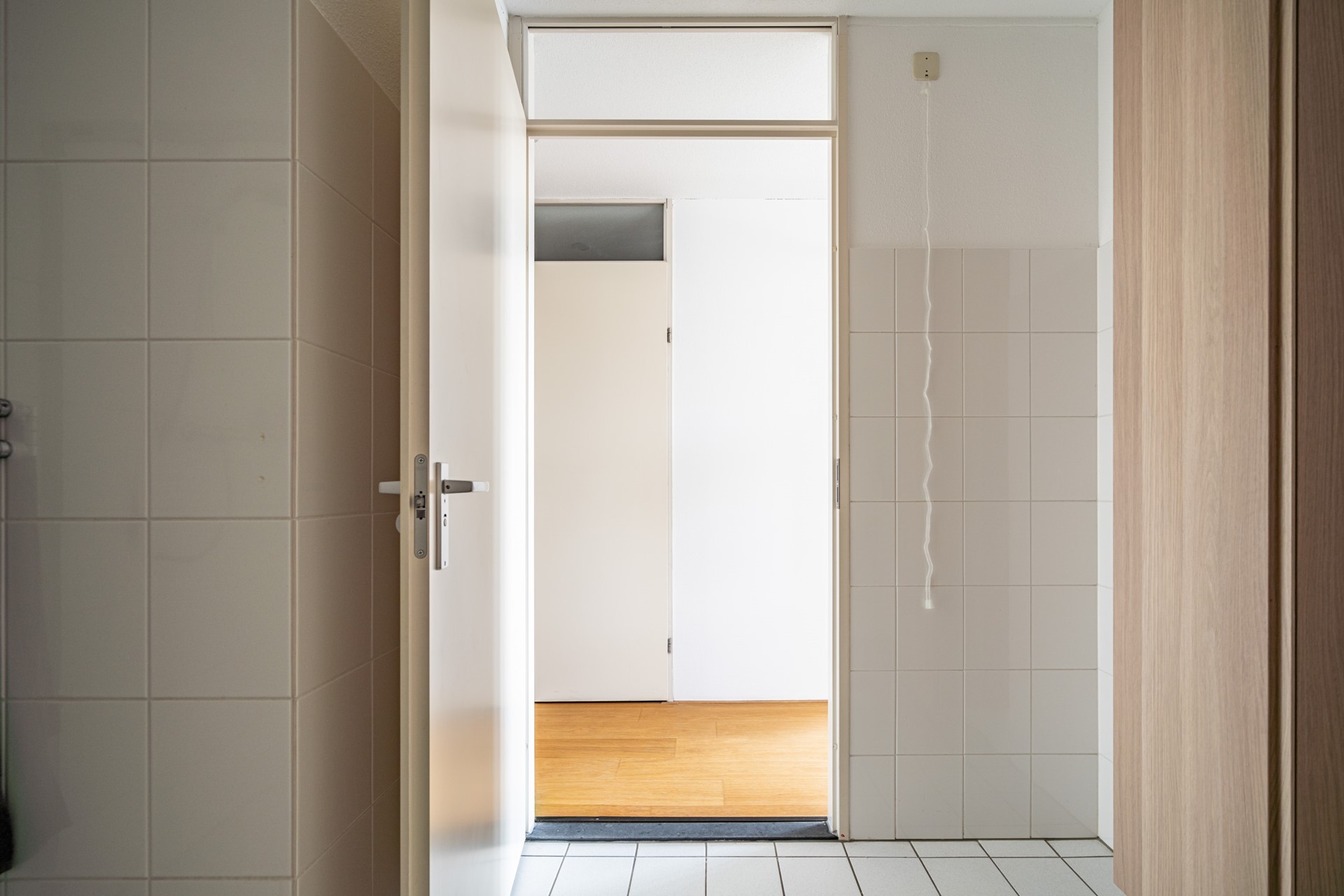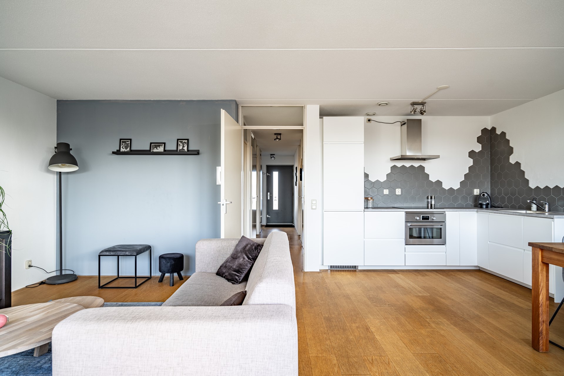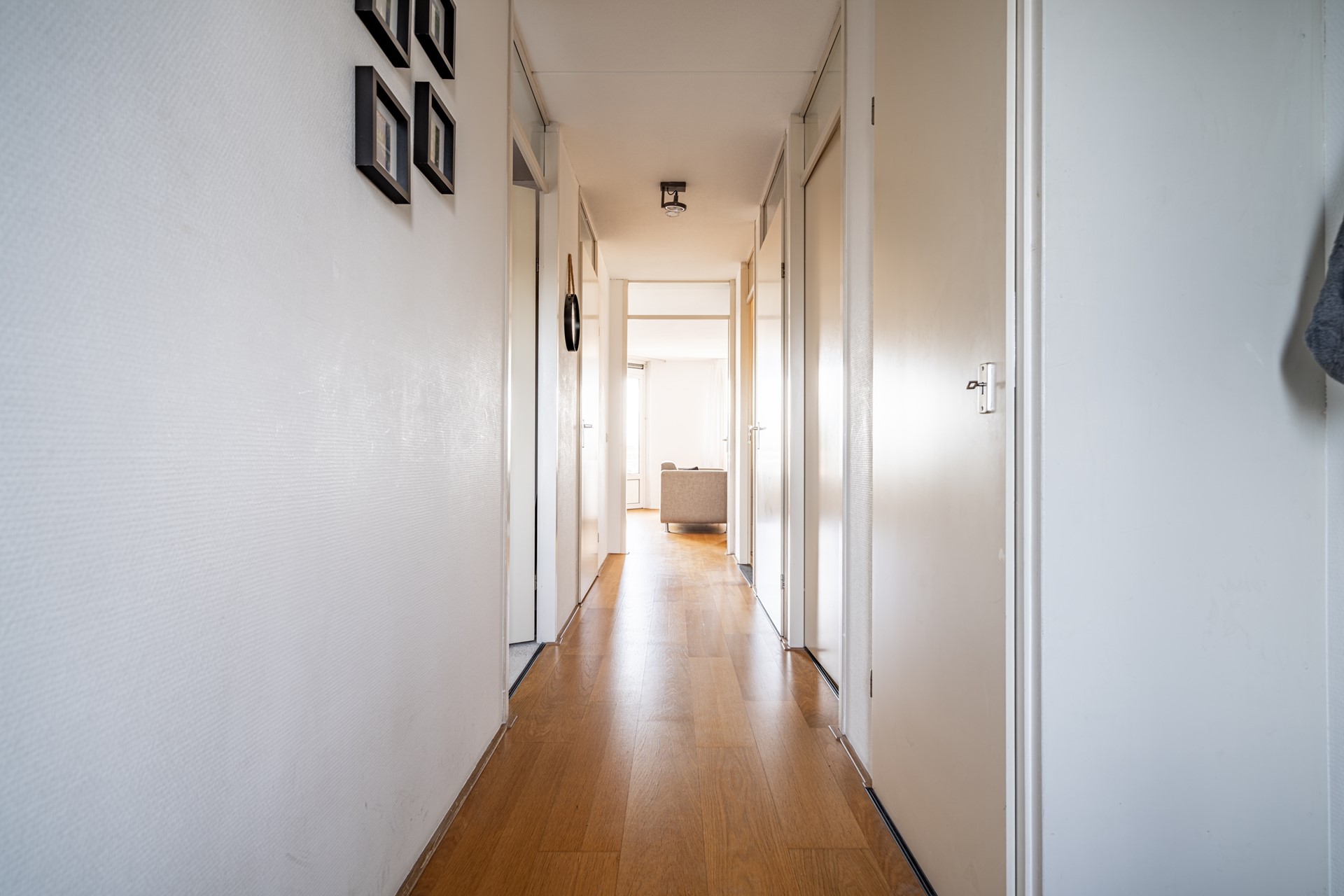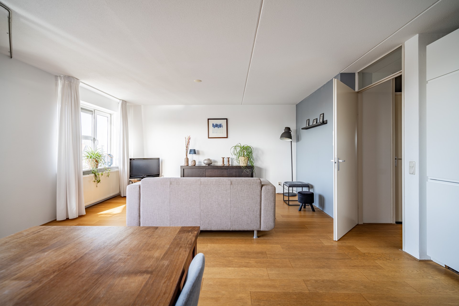 We nemen je graag mee naar binnen. Via de centrale entree met lift en trappenhuis kom je op de verdieping van het appartement. Zodra je binnenstapt in de hal merk je direct hoe prettig de indeling is: alle ruimtes zijn logisch met elkaar verbonden en het appartement voelt verrassend ruim aan. De woning is voorzien van een lamelparketvloer en strakke wanden afgewerkt met Renovlies behang.