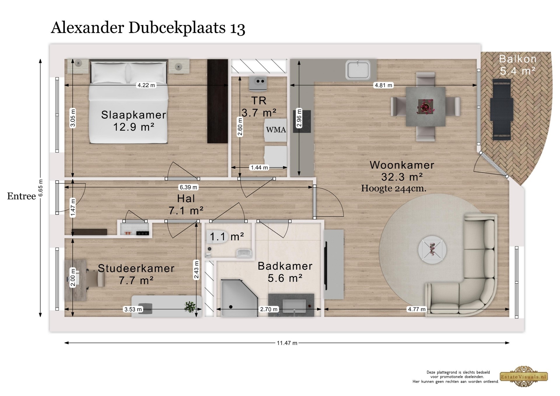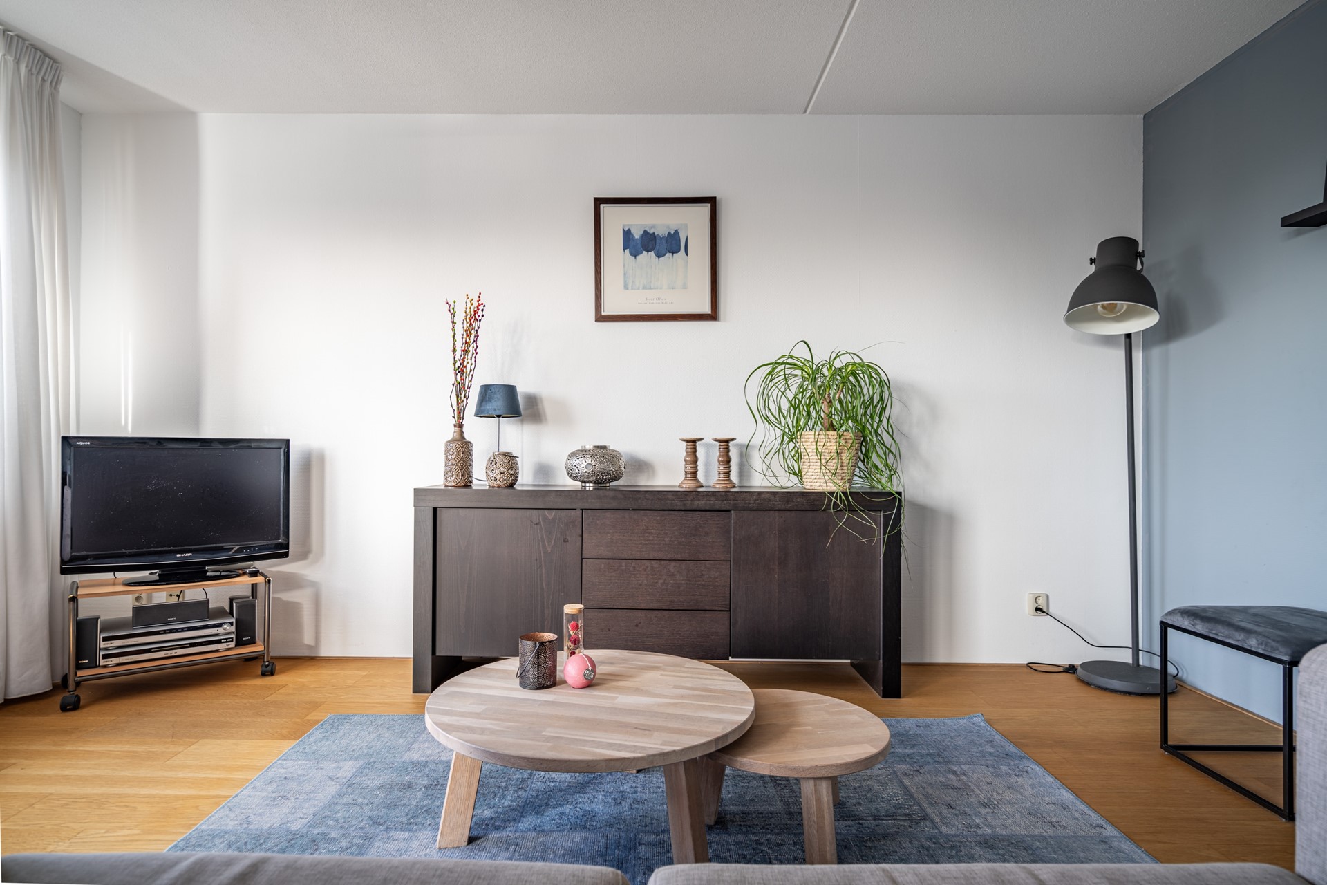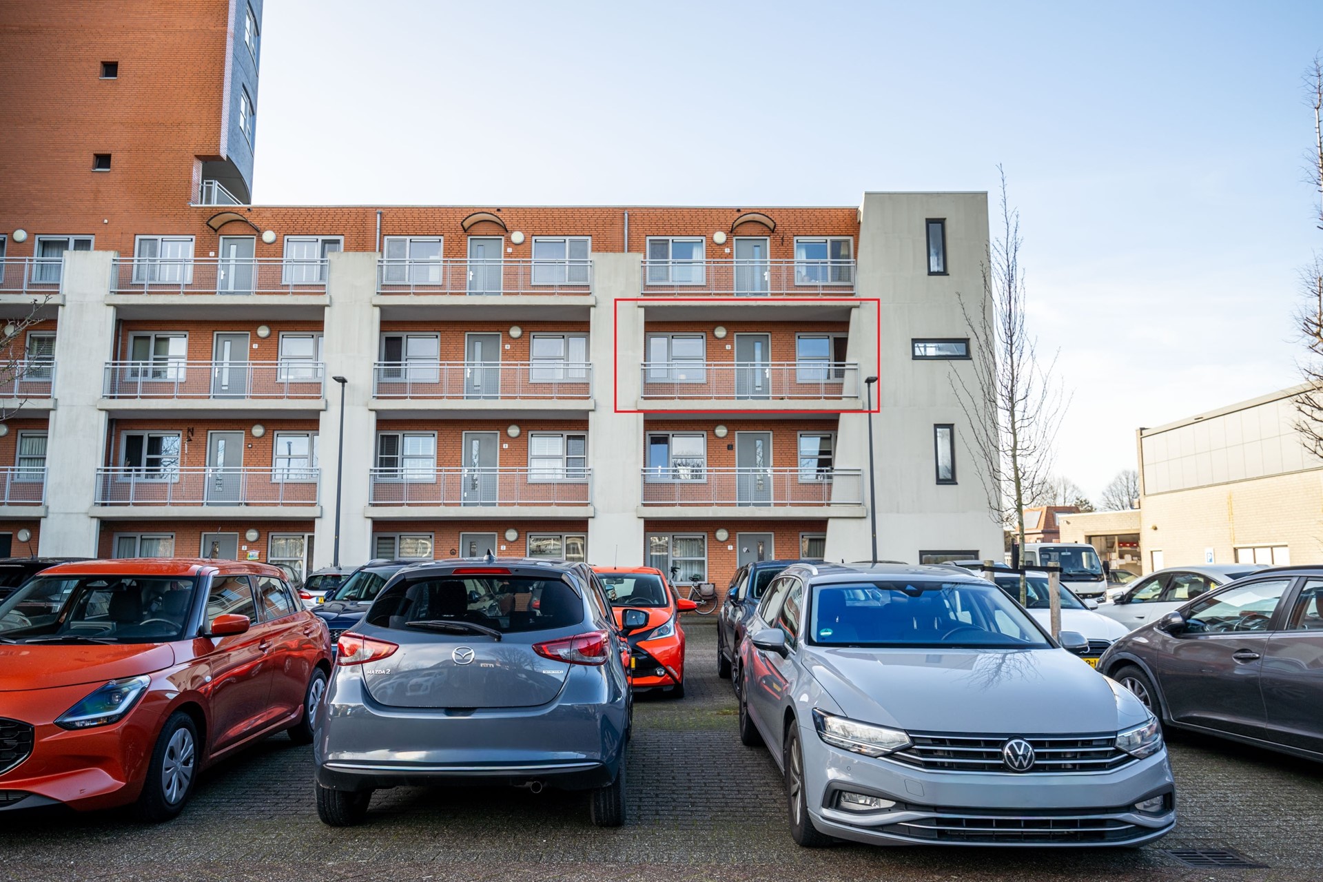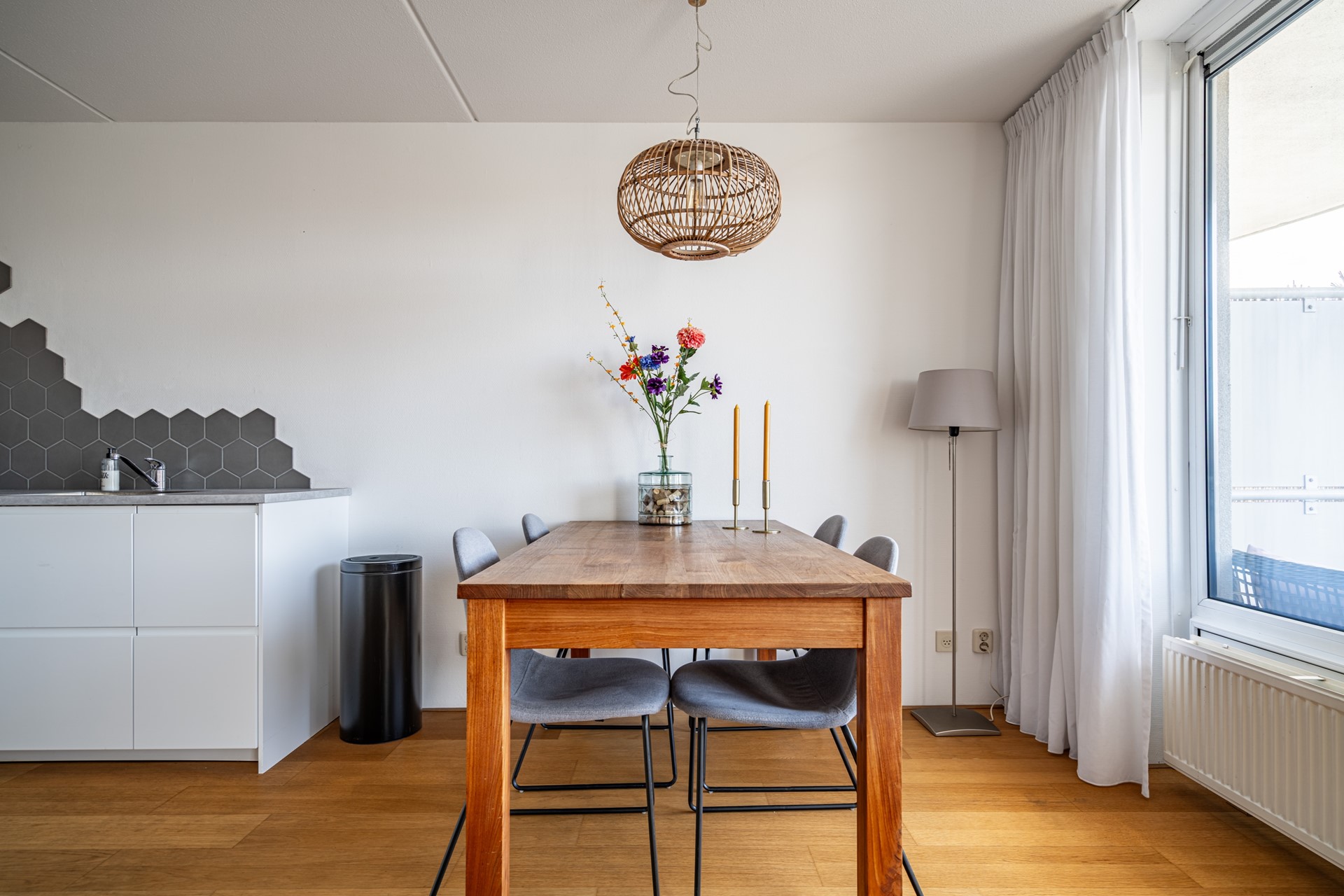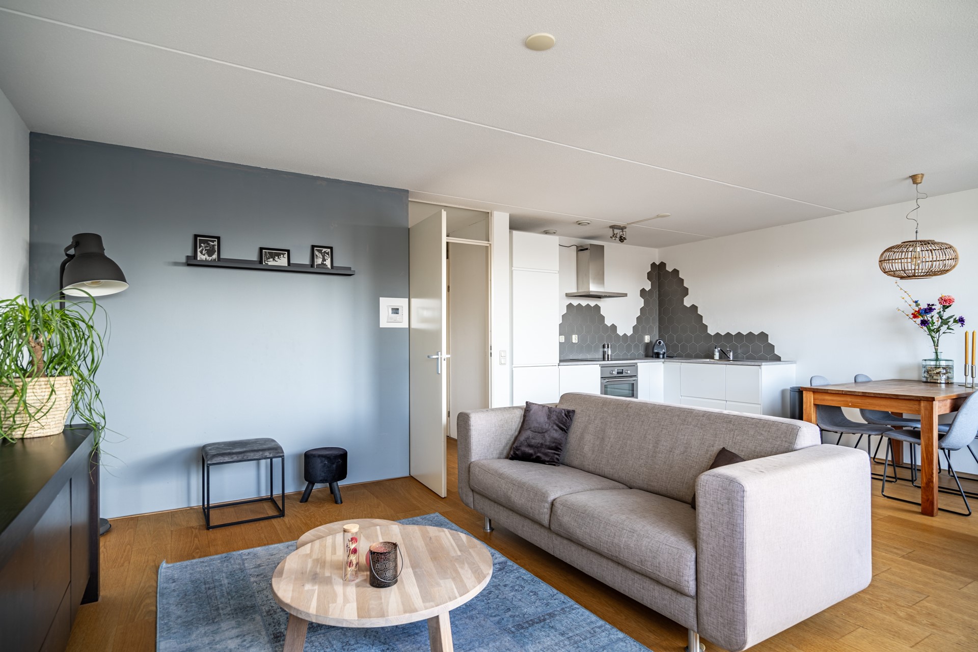 We nemen je graag mee naar binnen. Via de centrale entree met lift en trappenhuis kom je op de verdieping van het appartement. Zodra je binnenstapt in de hal merk je direct hoe prettig de indeling is: alle ruimtes zijn logisch met elkaar verbonden en het appartement voelt verrassend ruim aan. De woning is voorzien van een lamelparketvloer en strakke wanden afgewerkt met Renovlies behang.