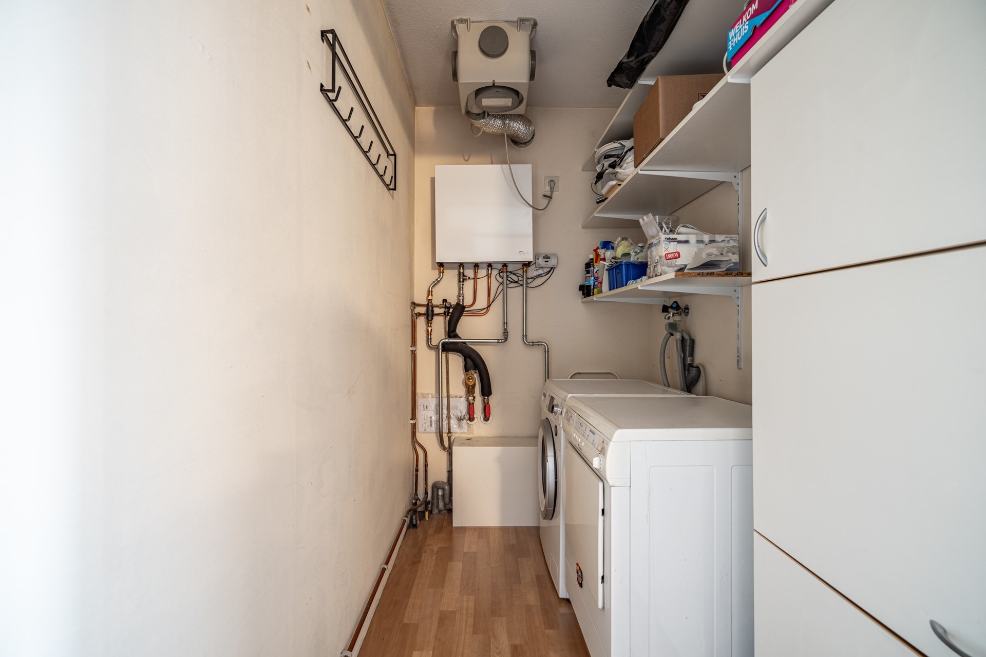 De badkamer is netjes en compleet, voorzien van een inloopdouche en wastafelmeubel. Het toilet is separaat met een fontein. Verder is er nog een praktische inpandige berging/technische ruimte met opstelplaats voor de wasmachine en droger.