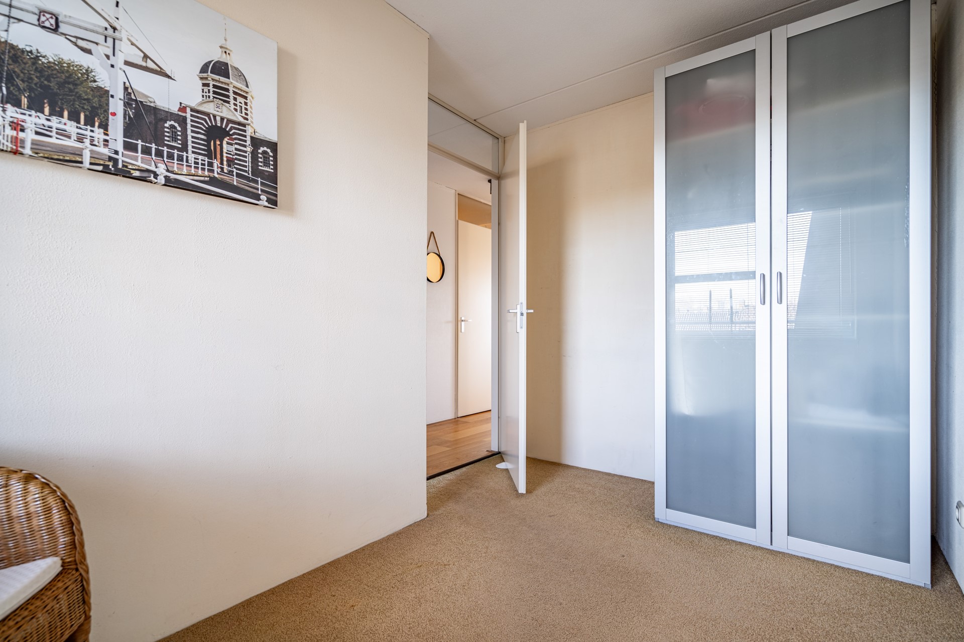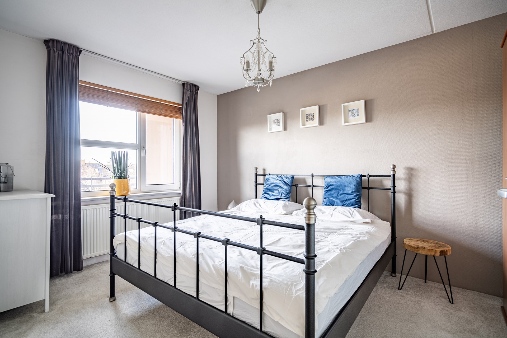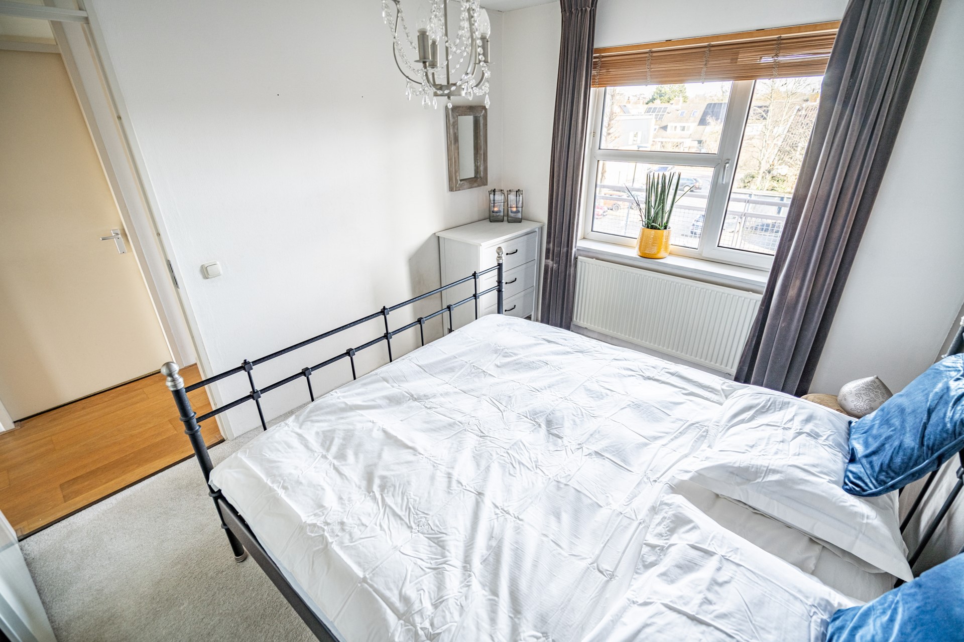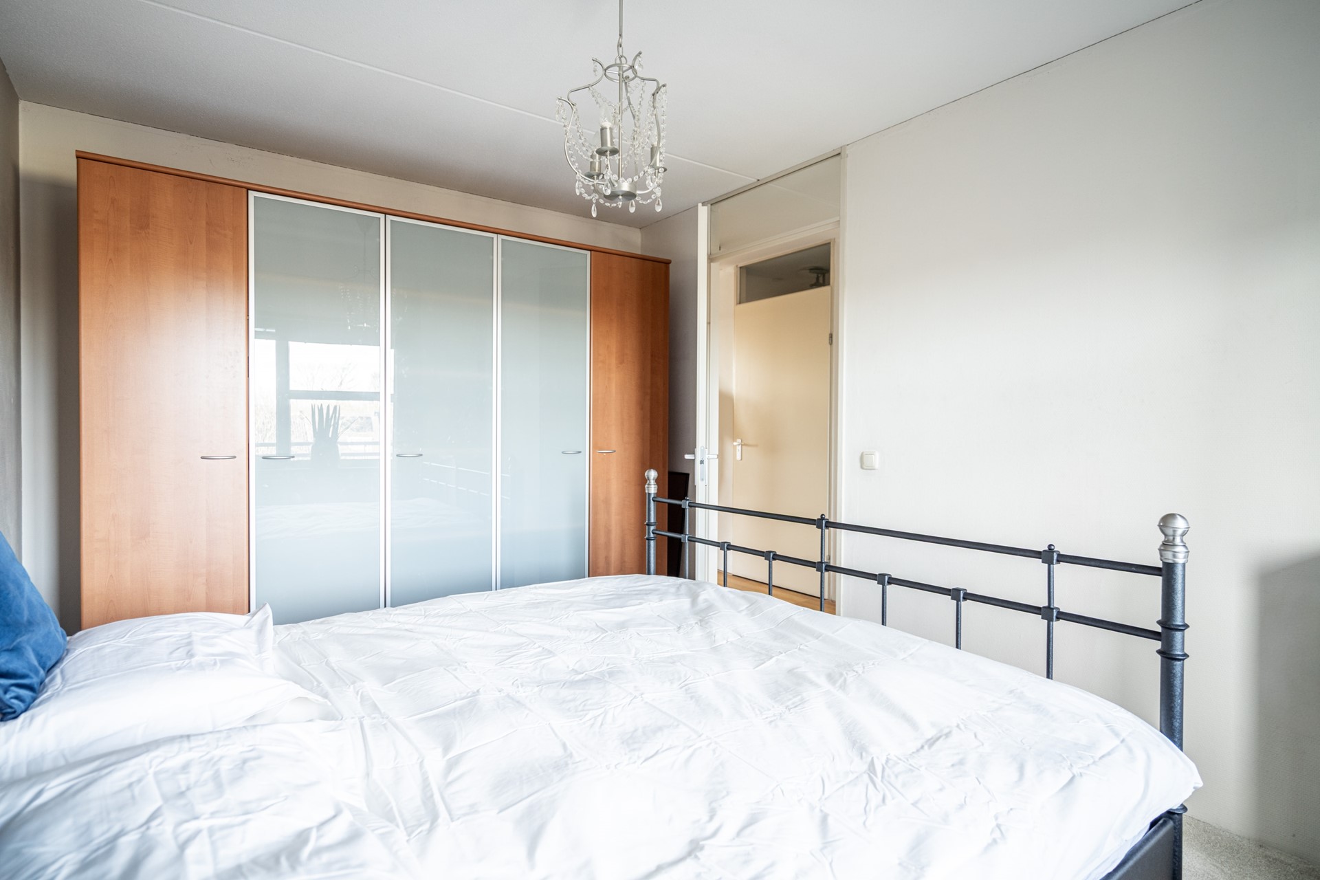Terug in de hal vind je de overige vertrekken. De hoofdslaapkamer is ruim en licht, met voldoende plek voor een tweepersoonsbed en een kledingkast. Daarnaast is er een tweede kamer, ideaal als werkkamer, logeerkamer of hobbyruimte.