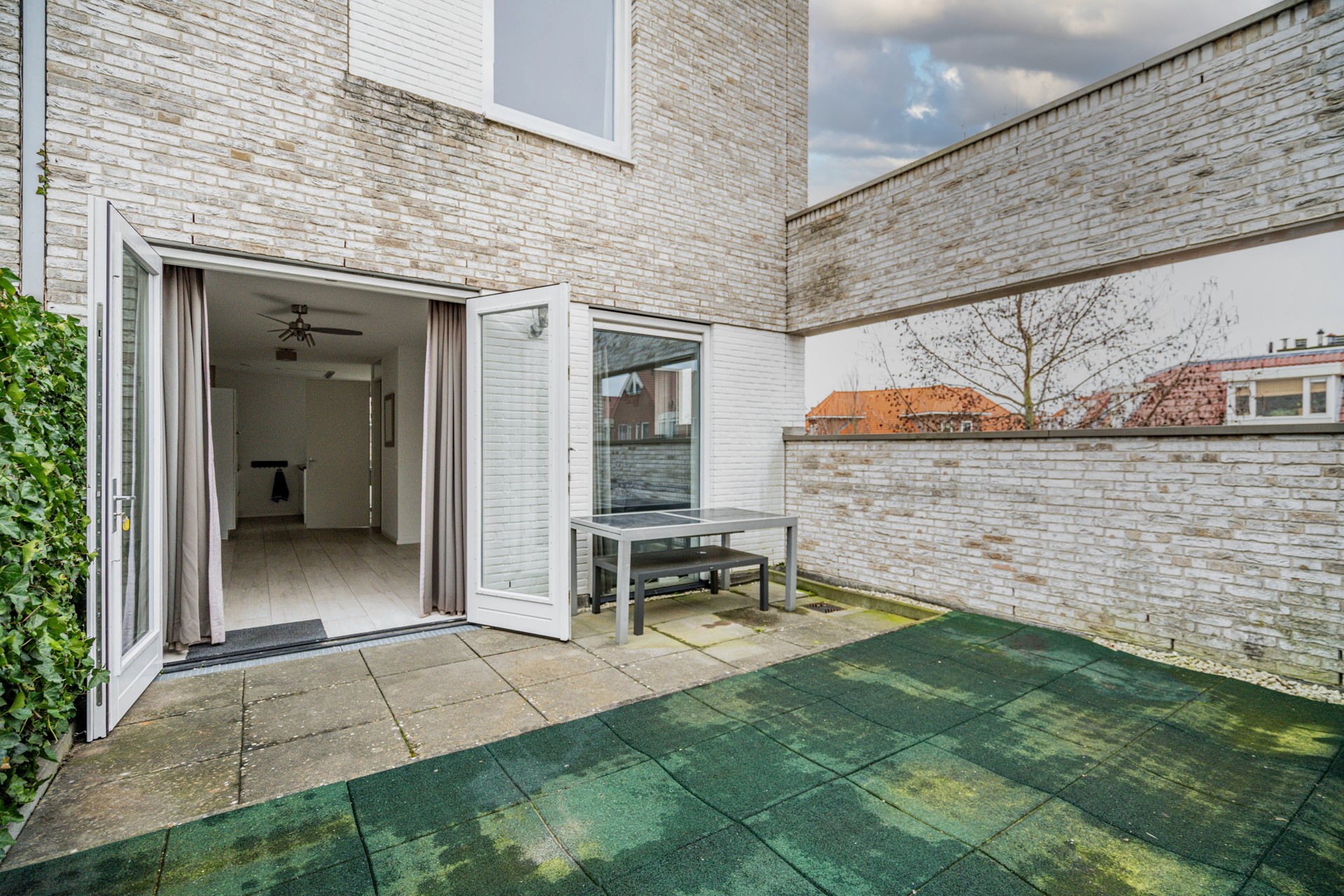 Aan de achterzijde bevindt zich het zitgedeelte met toegang tot de zonnige tuin. Direct daarachter ligt de eigen parkeerplaats op een afgesloten parkeerdek, uitsluitend toegankelijk voor bewoners. Ook is er achter de woning een prettige speelomgeving voor kinderen.