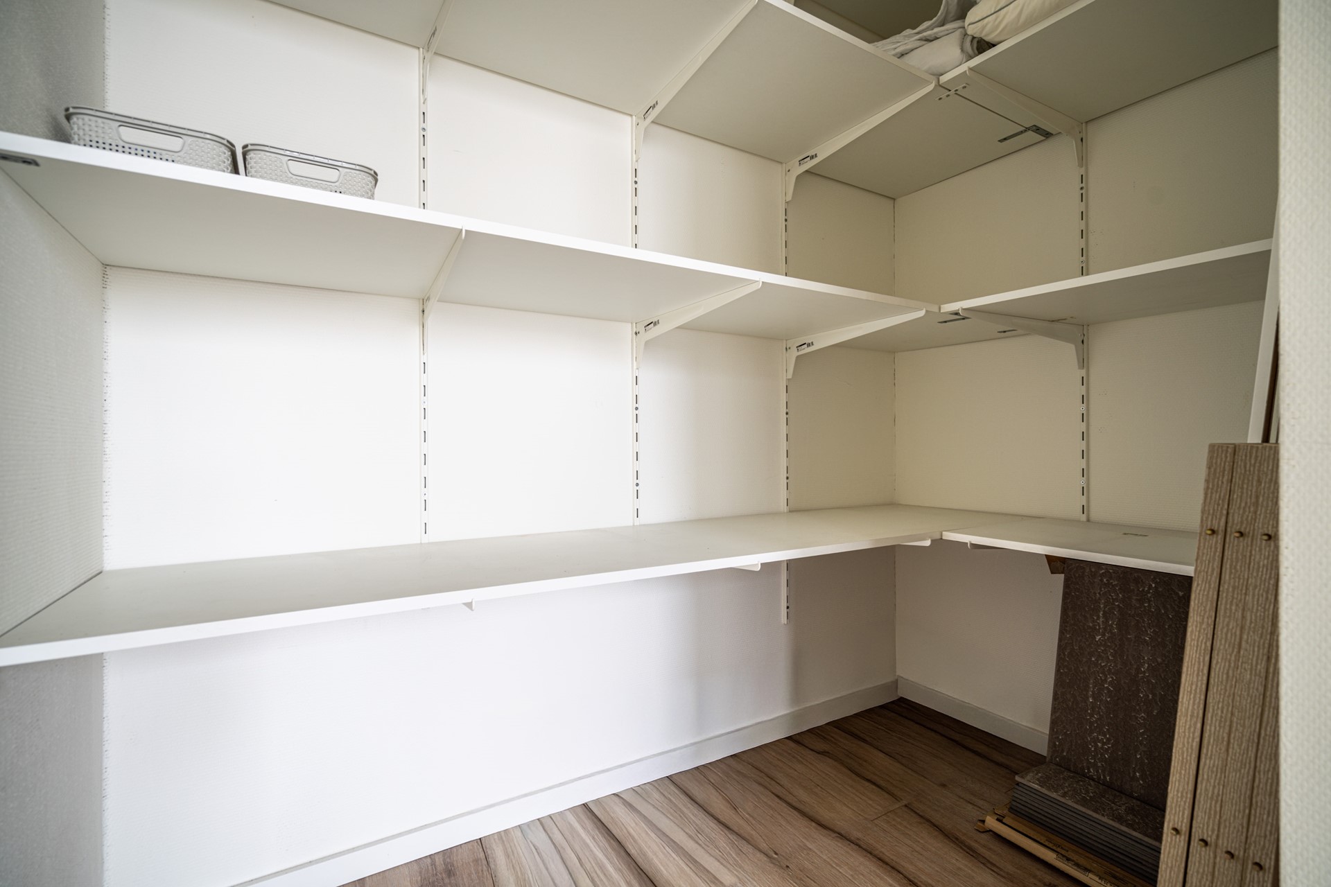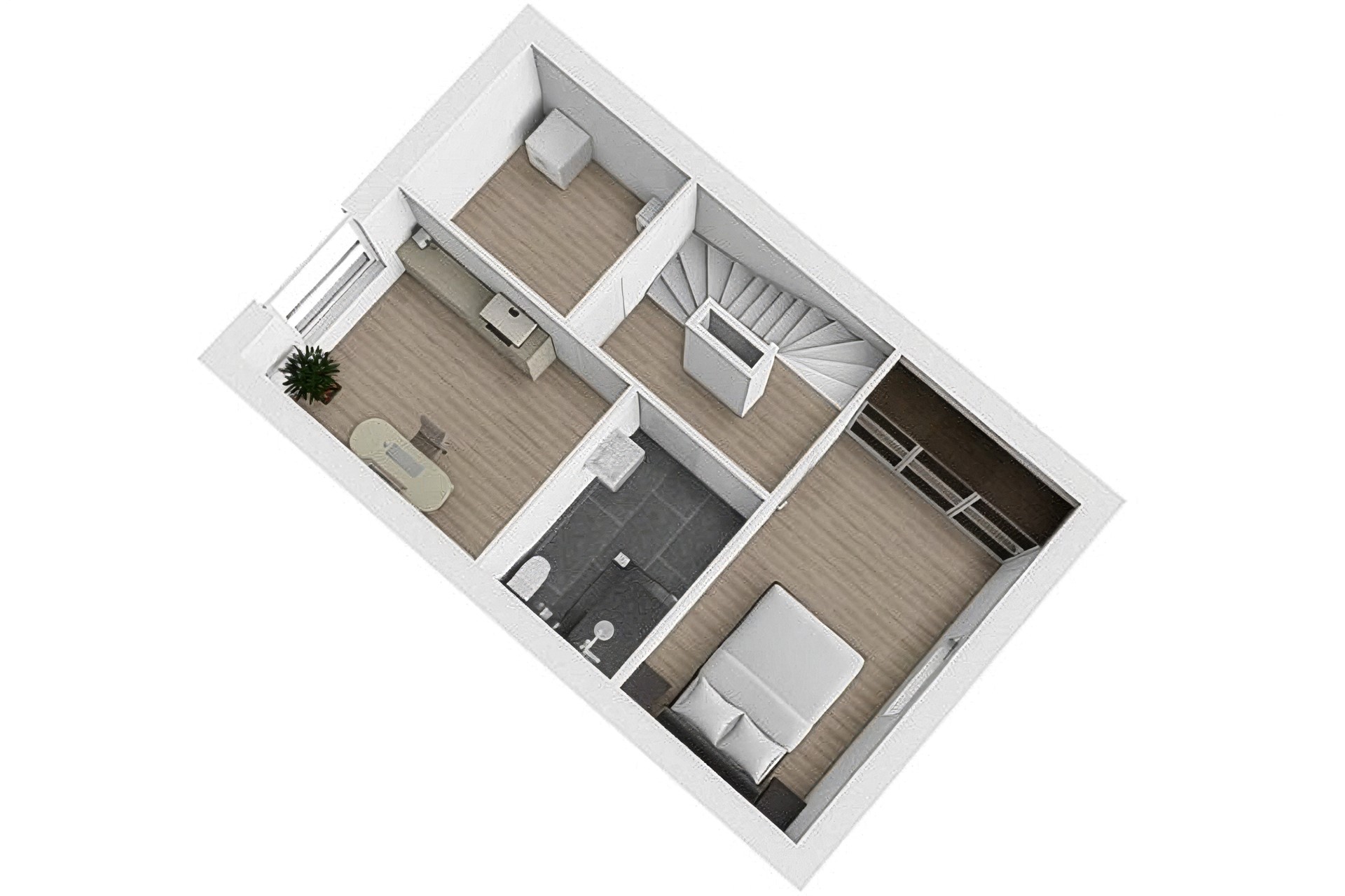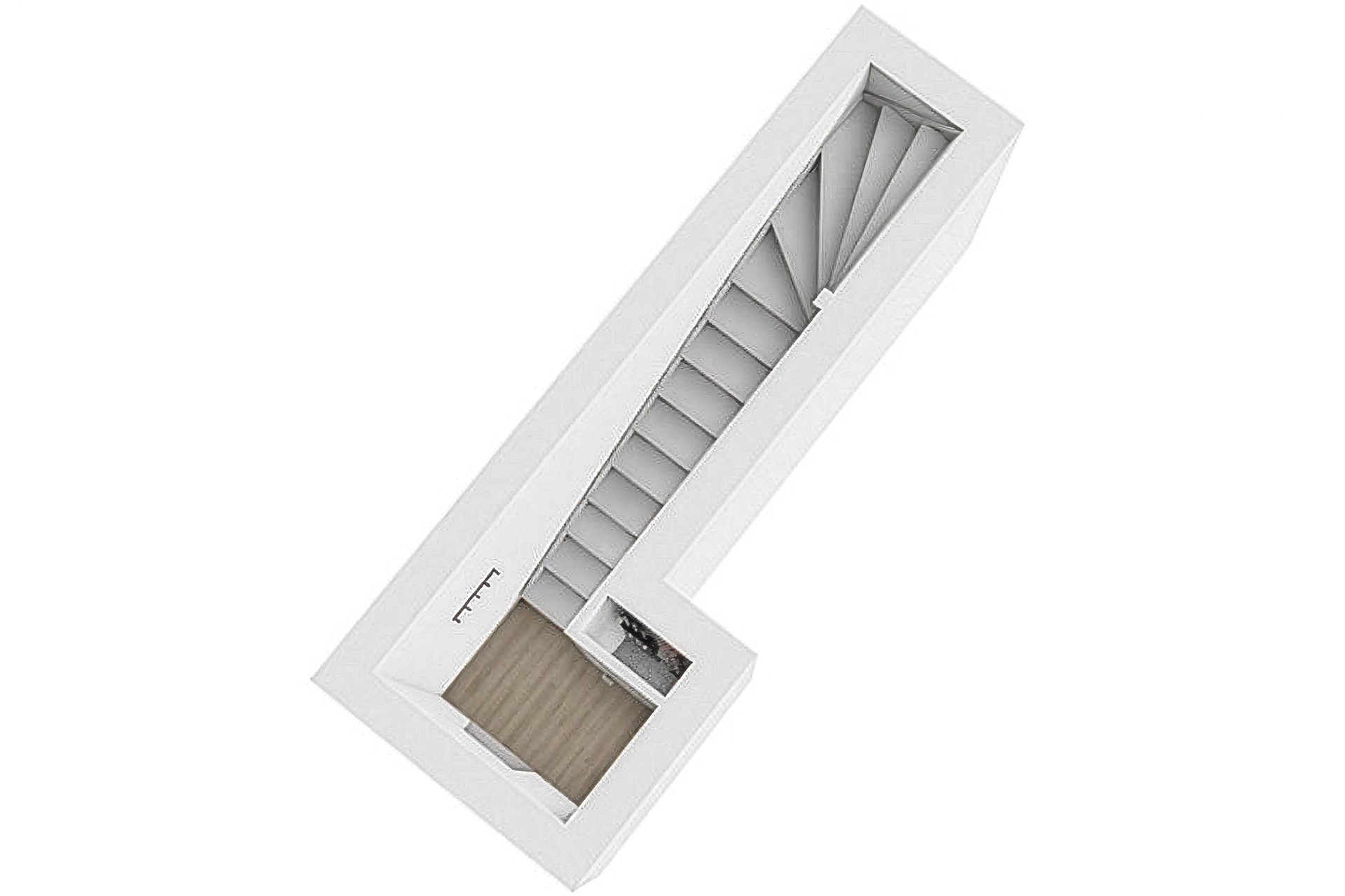 The staircase leads to the sleeping floor. Here you will find two spacious bedrooms, a modern bathroom, and a separate utility room.