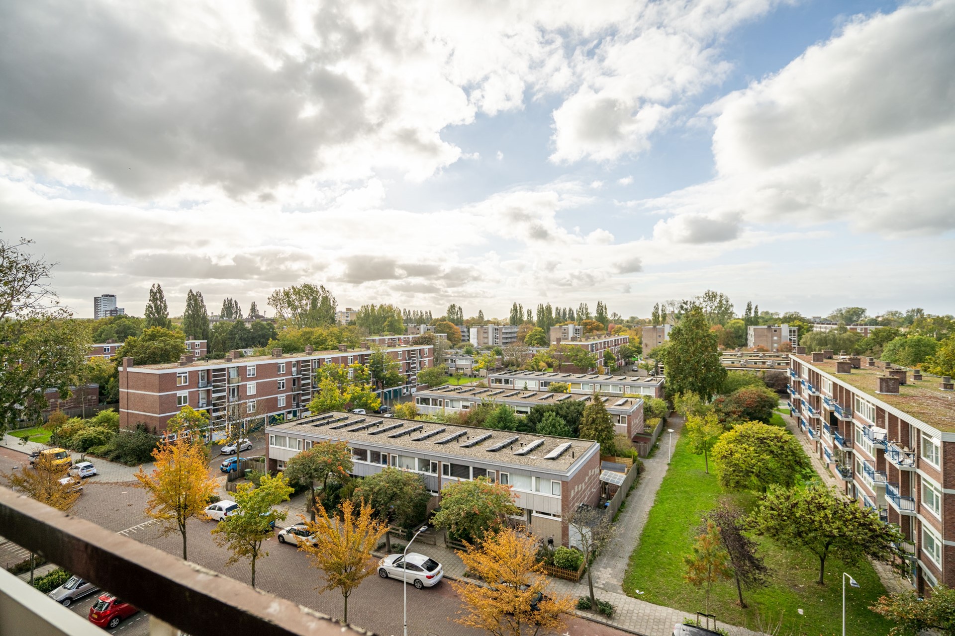 Op de vijfde verdieping van de Rijnlandflat in Leiden vindt u dit modern ingerichte appartement, gedeeltelijk gemeubileerd en instapklaar. Vanuit de woonkamer heeft u toegang tot het balkon op het westen, waar u tot in de avond kunt genieten van de zon en het prachtige uitzicht.