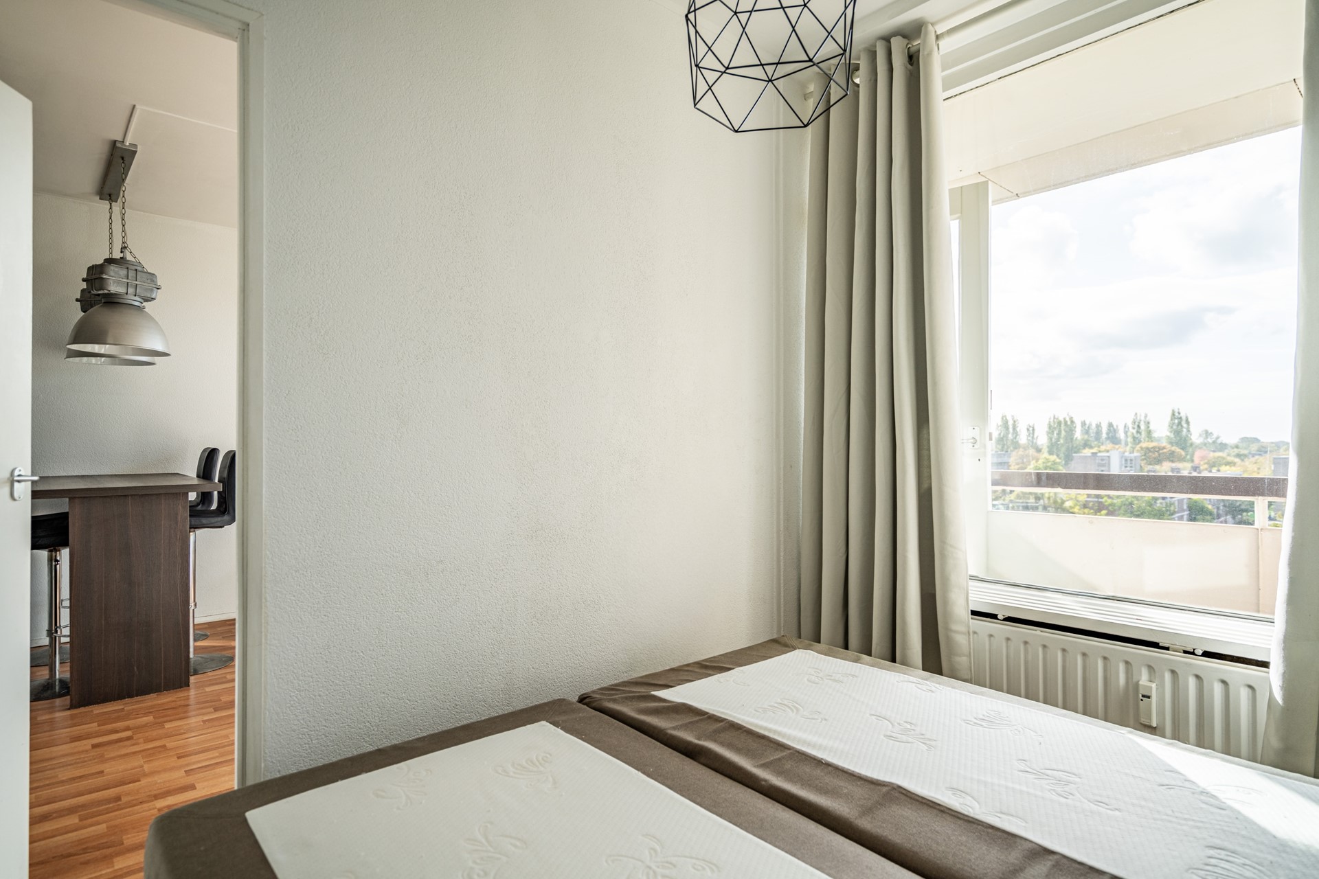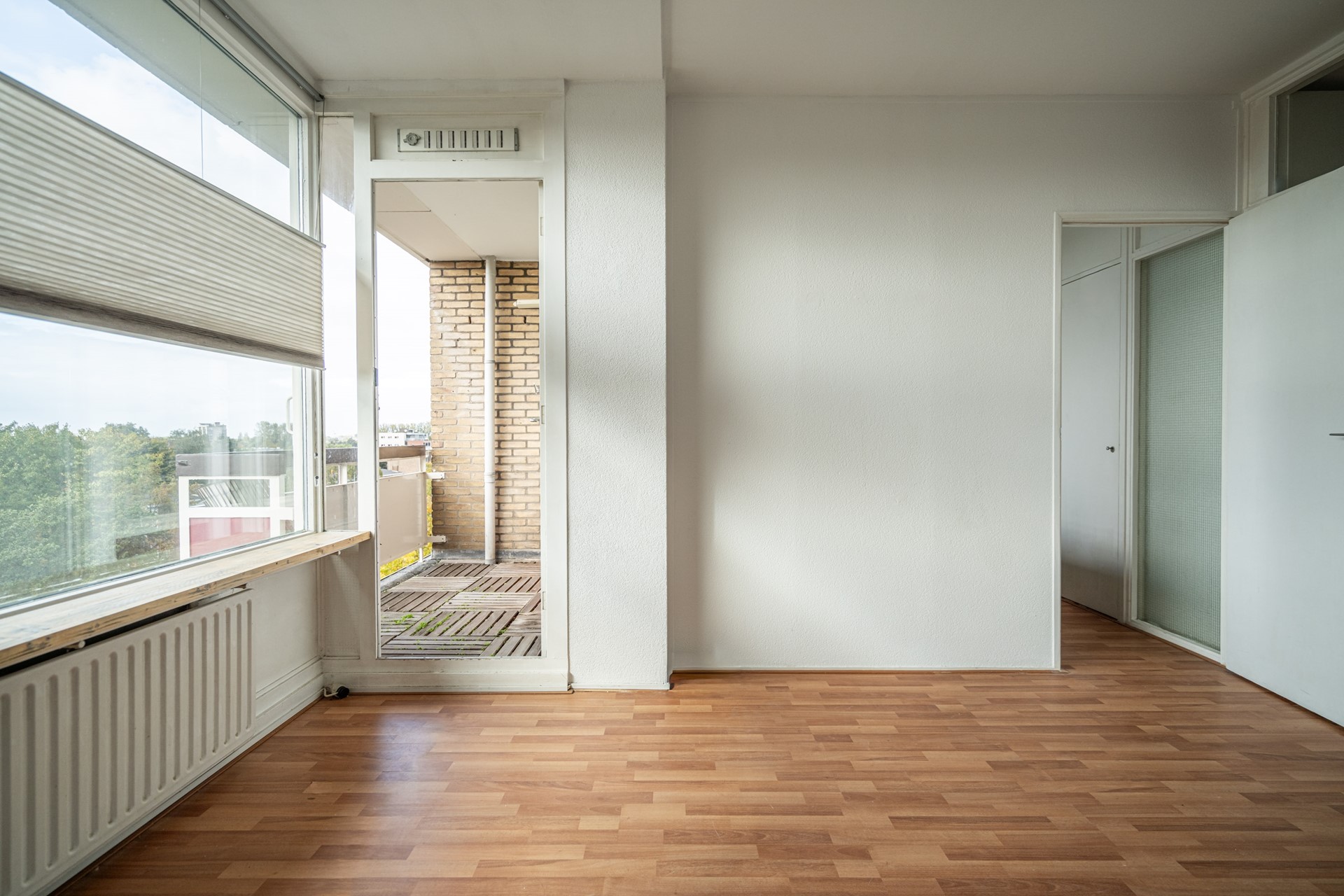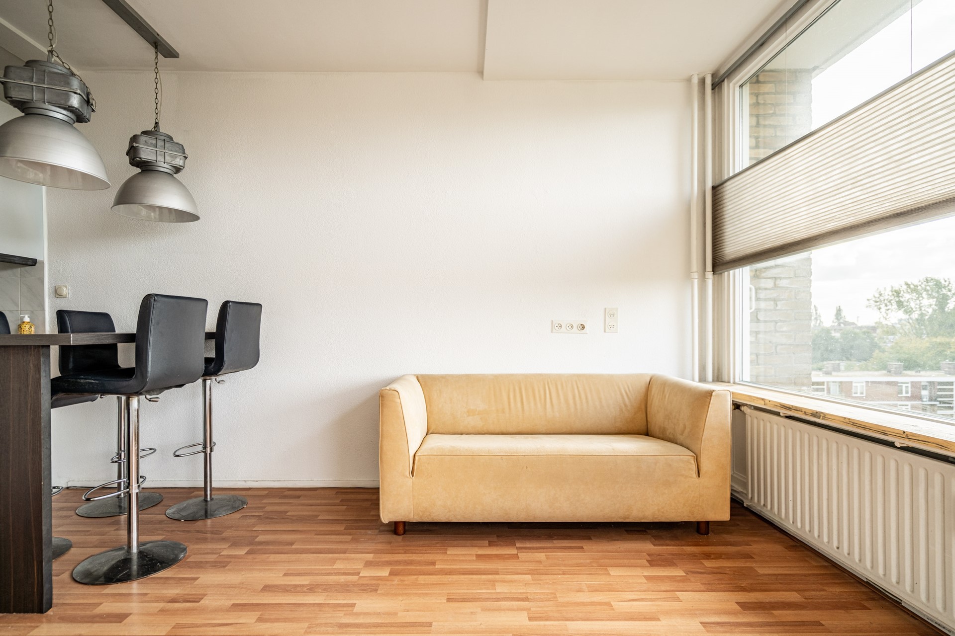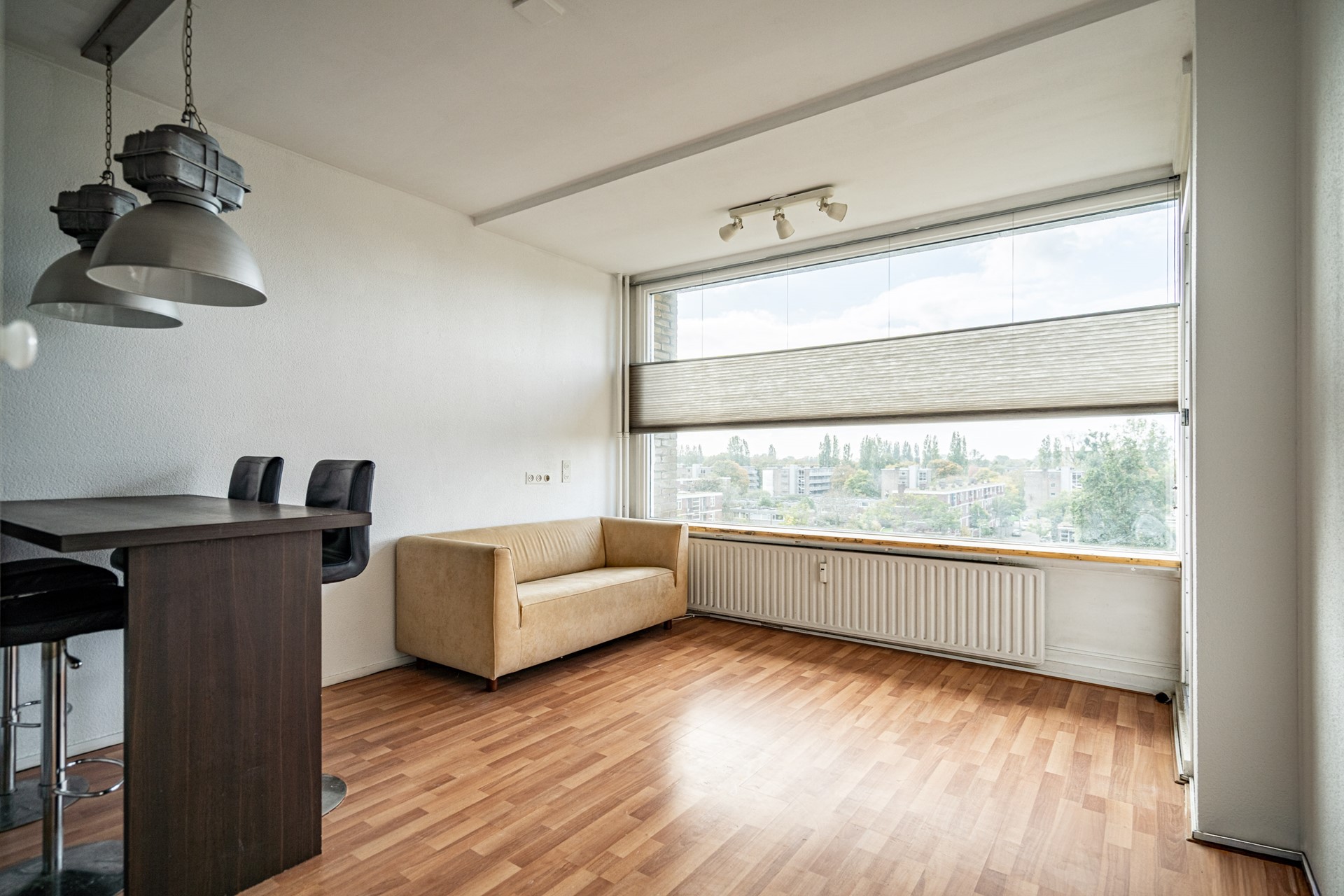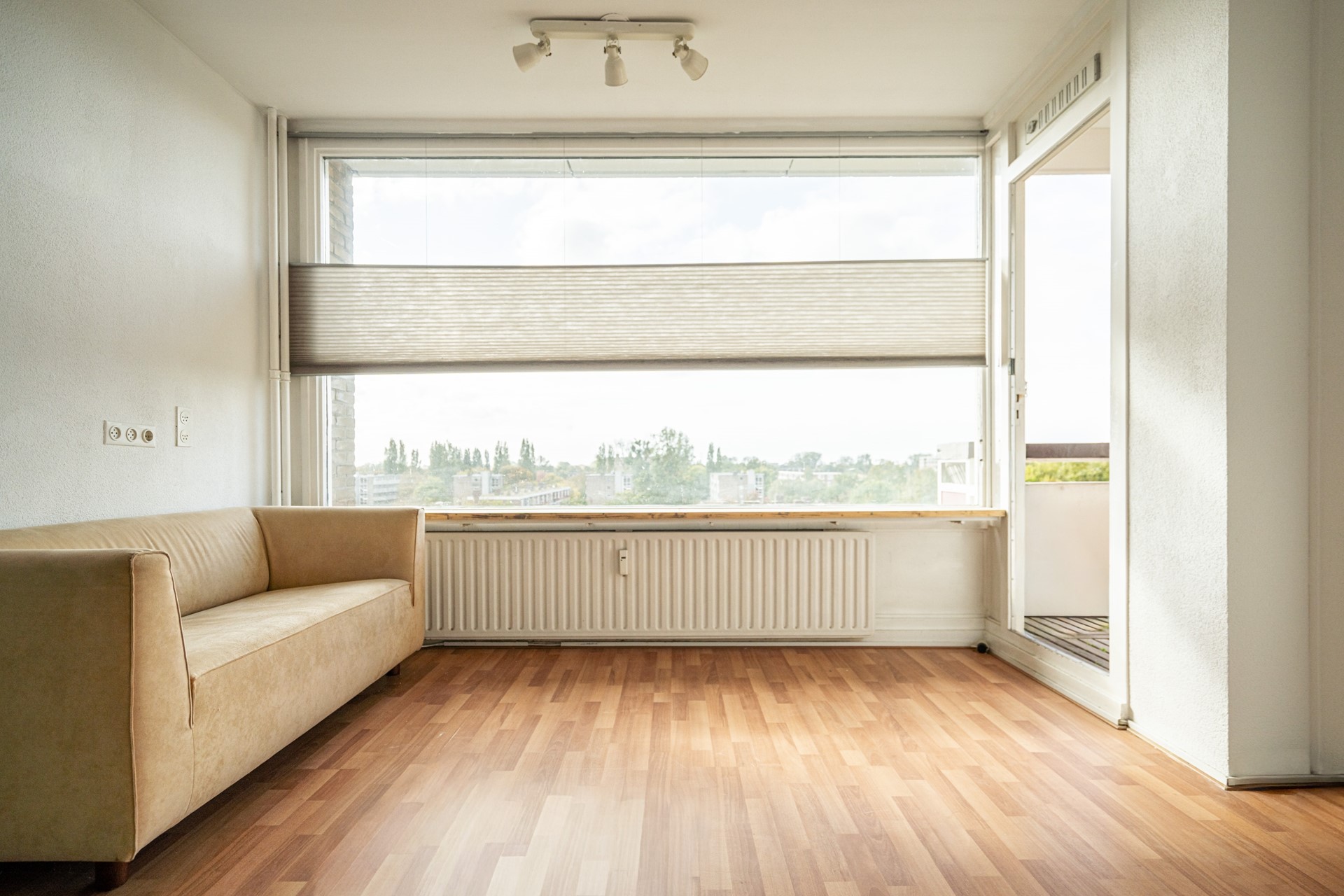 On the fifth floor of the Rijnlandflat in Leiden, you'll find this modern apartment, partially furnished and move-in ready. From the living room, you have access to the west-facing balcony, where you can enjoy the sun and the beautiful view until the evening.