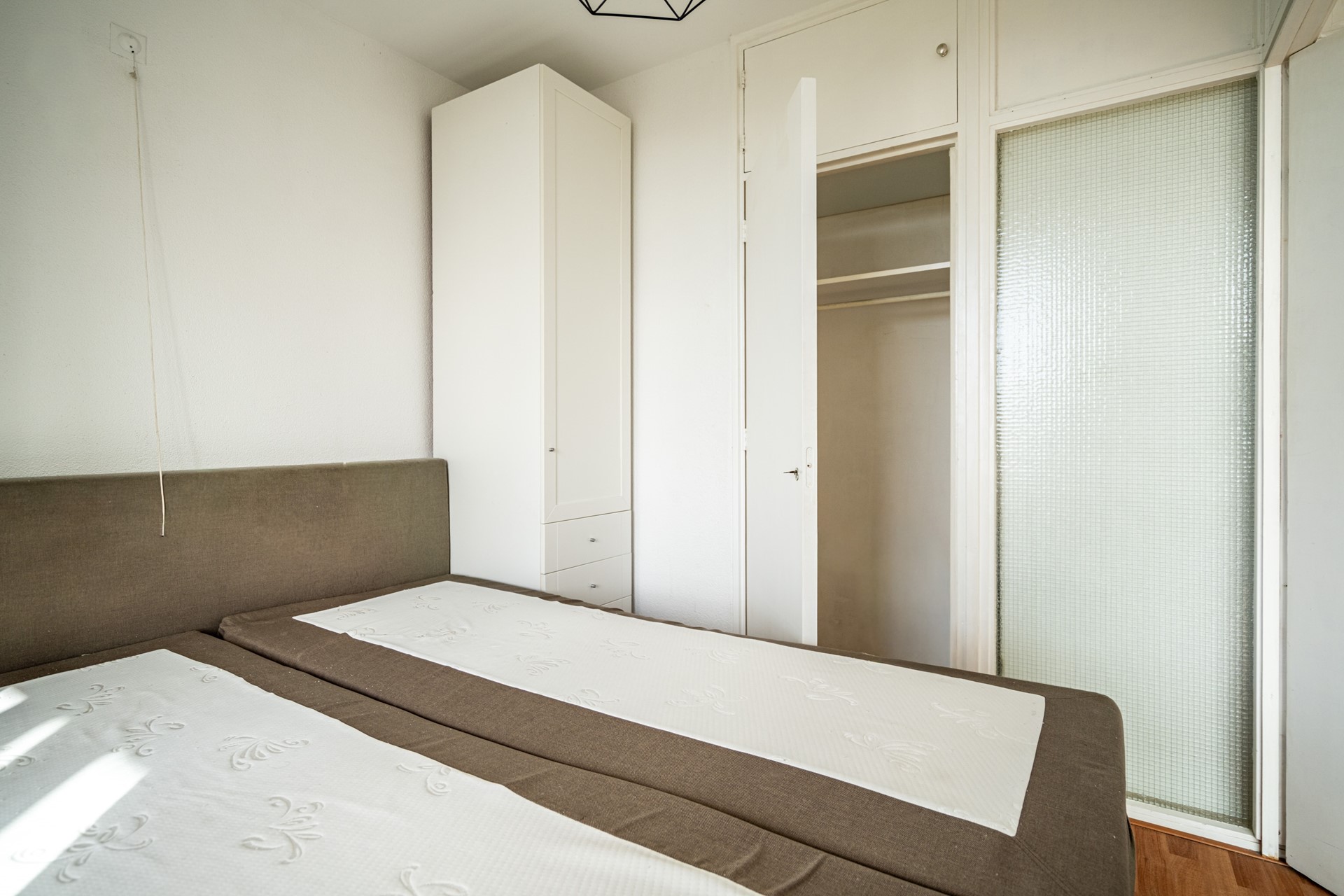A separate bedroom with a double bed and a built-in wardrobe offers a quiet place to relax and enjoy privacy.