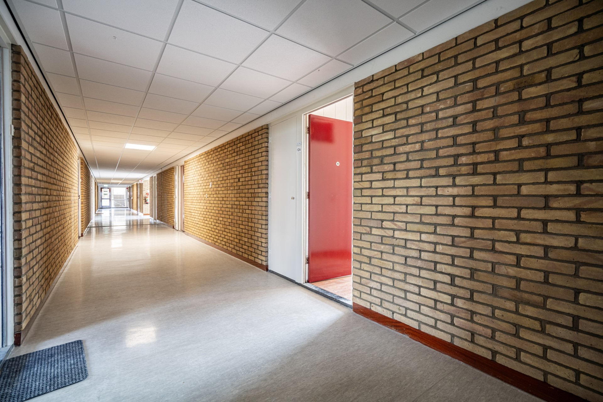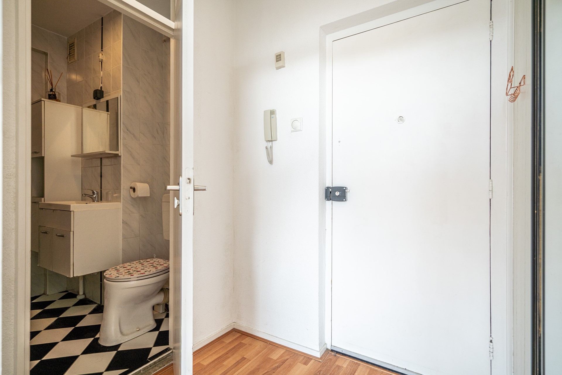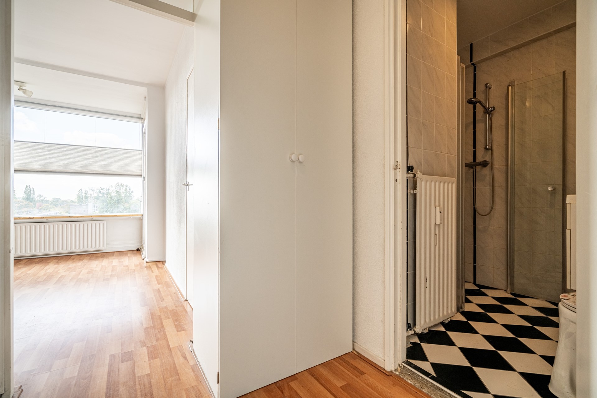 Via een gemeenschappelijke gang komt u bij de voordeur. Direct naast de ingang bevindt zich de meterkast. De centrale hal van het appartement biedt een praktische bergkast voor extra opbergruimte.