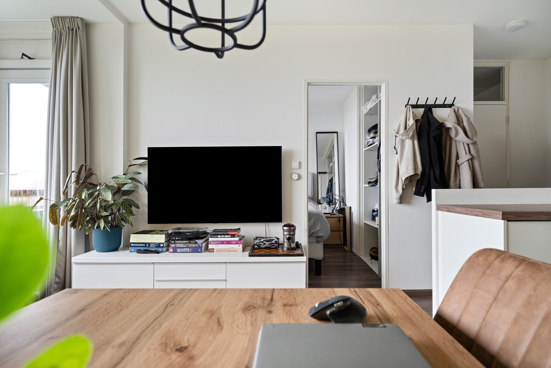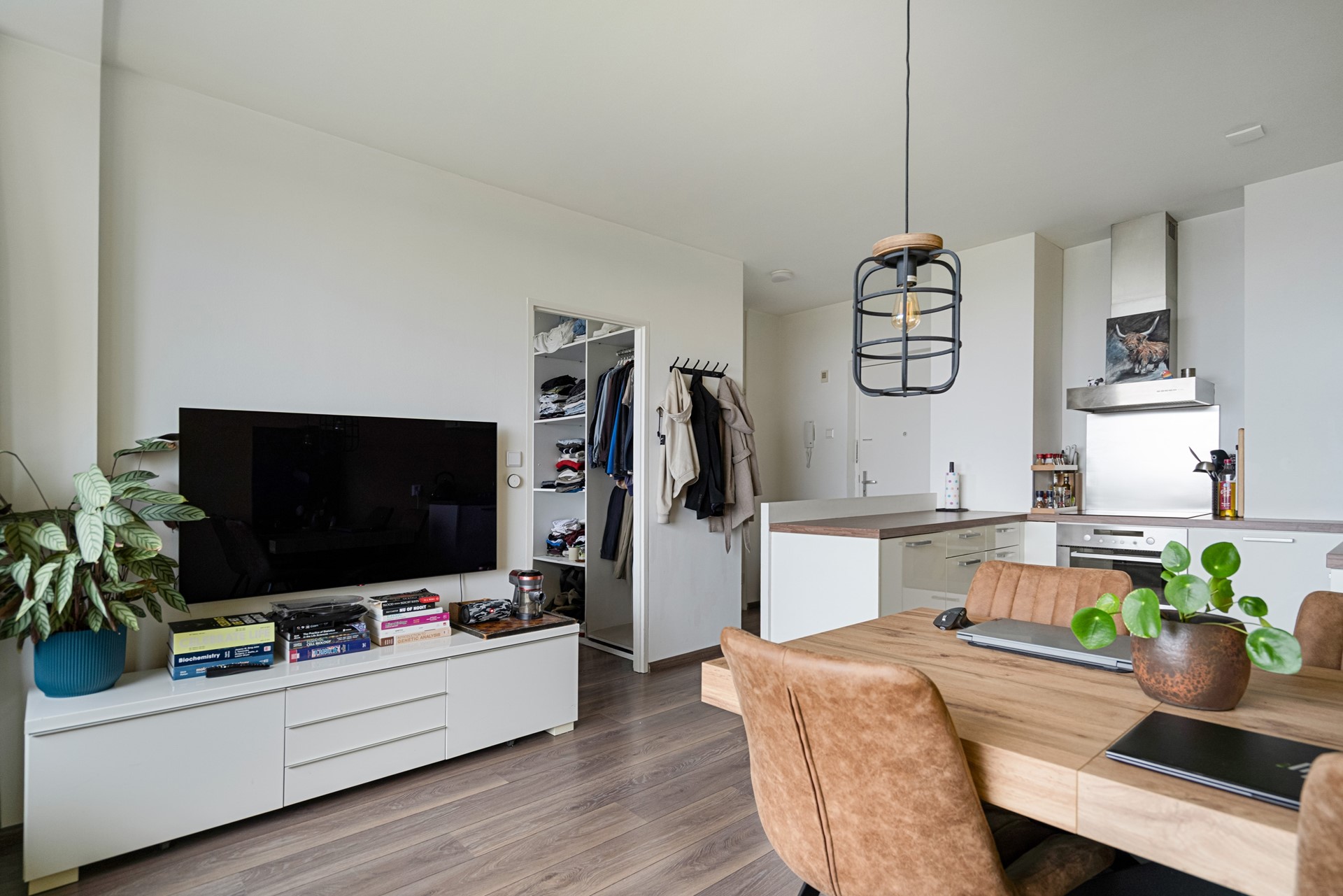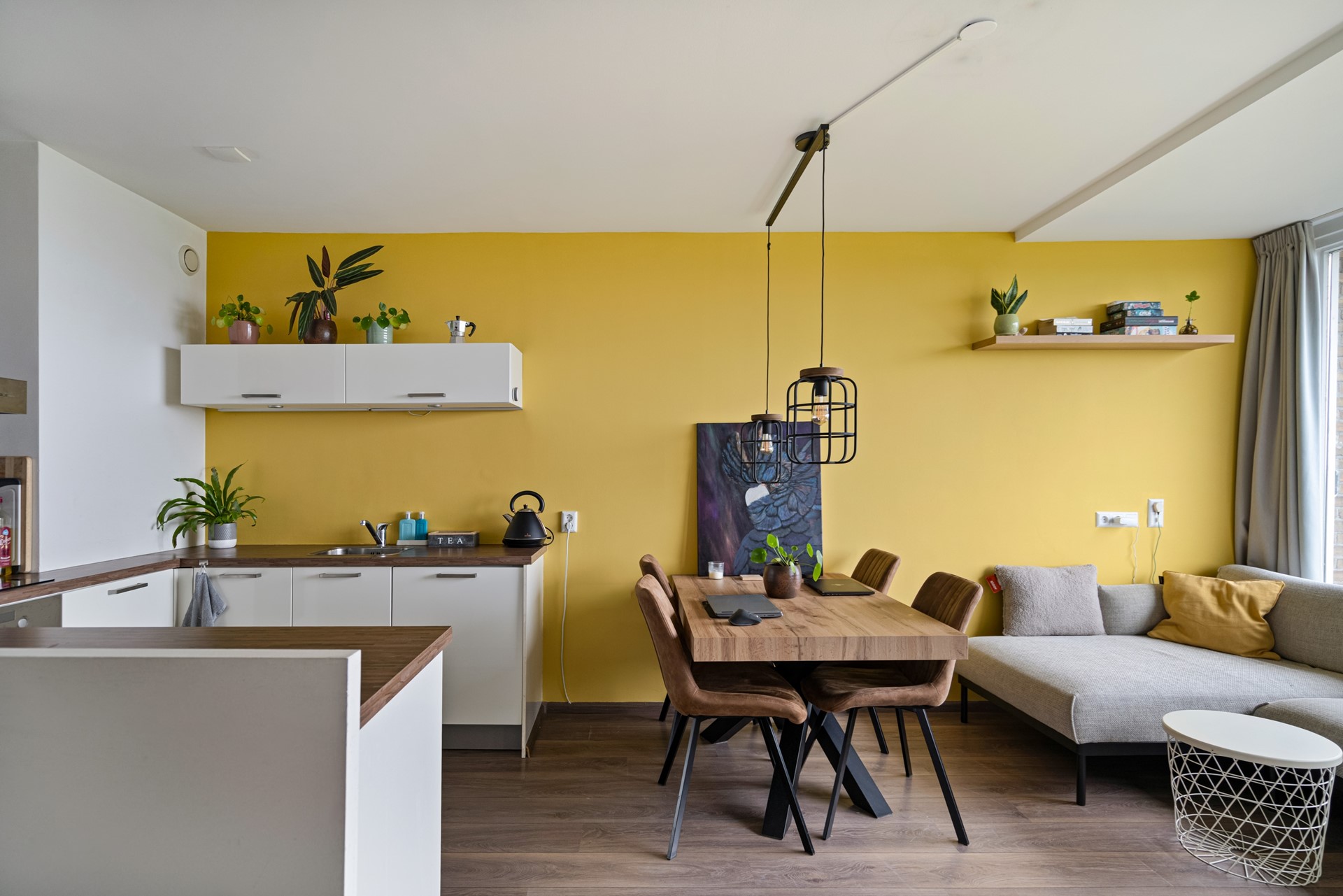 De woonkamer is licht en ruim dankzij de grote raampartijen en is voorzien van een moderne laminaatvloer. De open indeling met eetbar en keuken zorgt voor een gezellige en huiselijke sfeer.