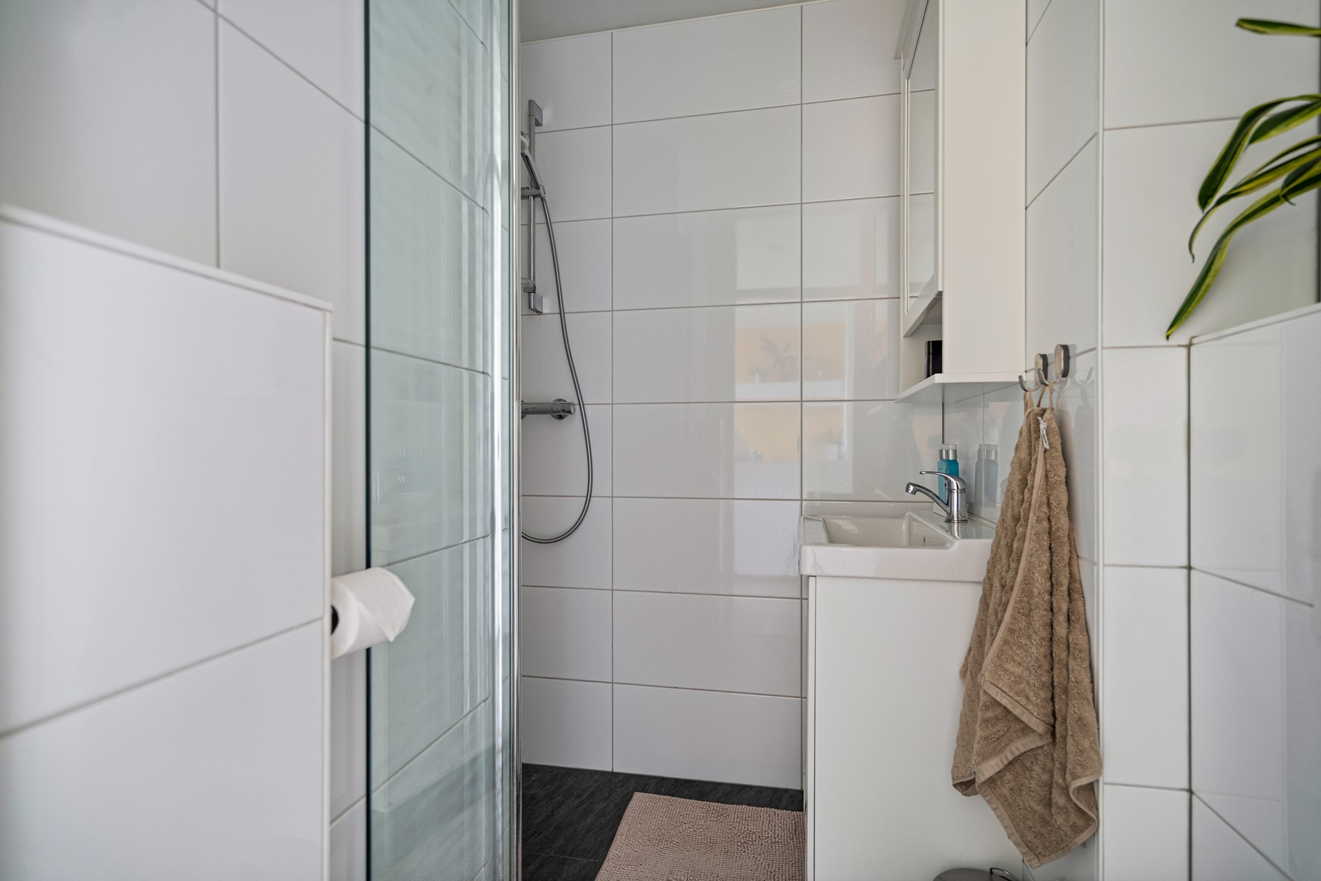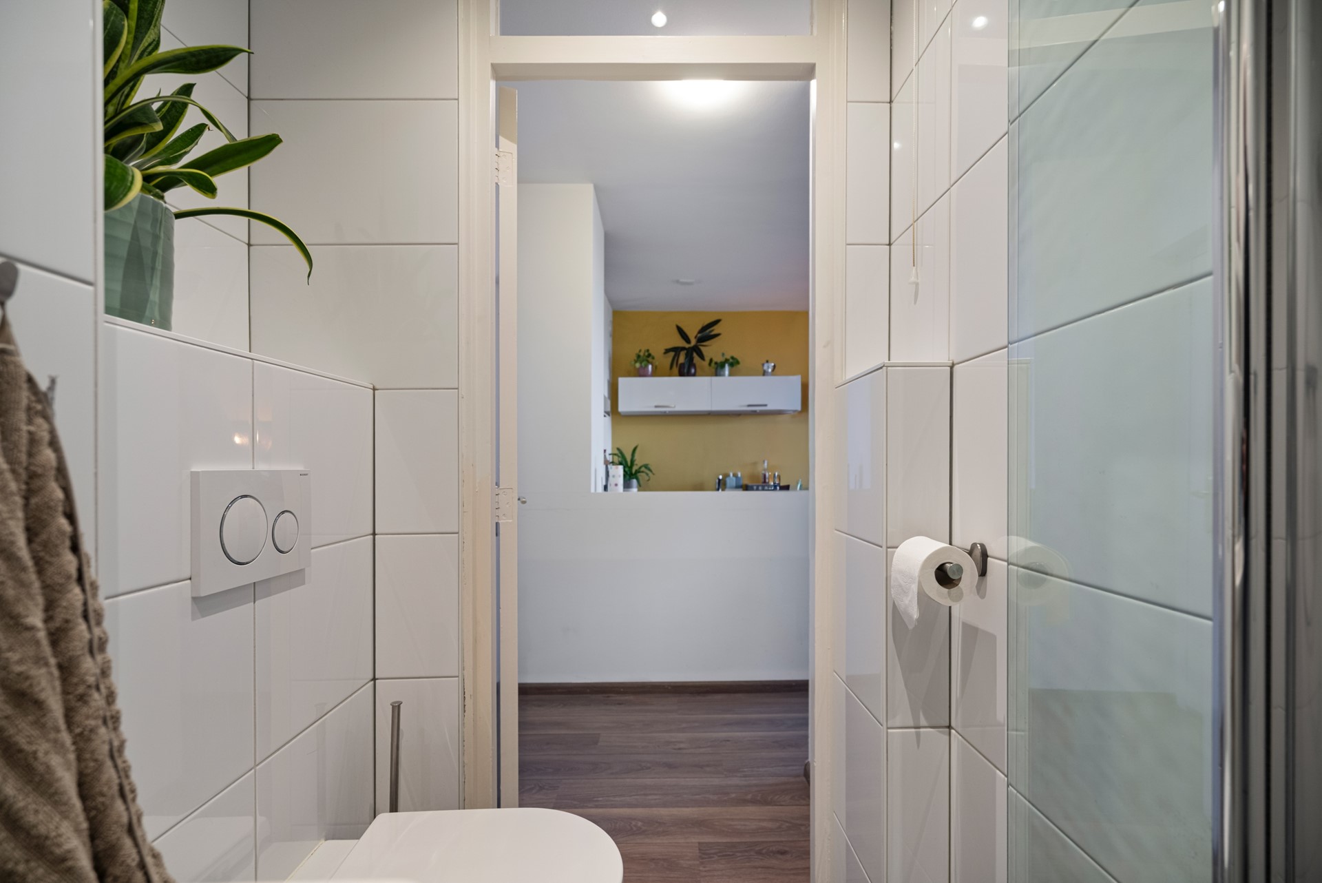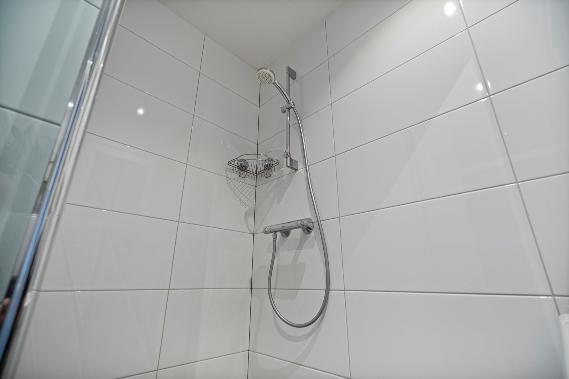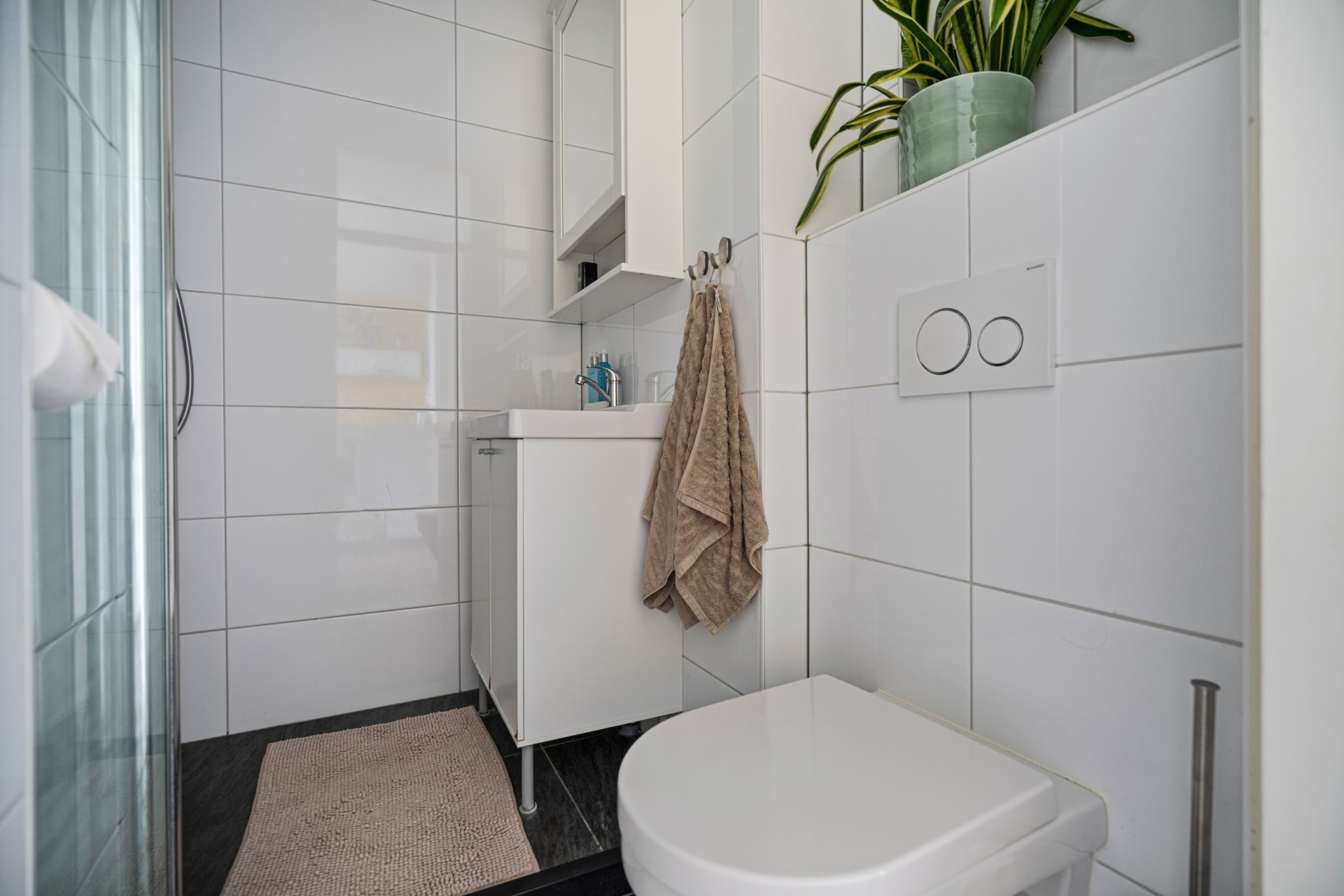 De badkamer is strak afgewerkt met licht tegelwerk en voorzien van douche, toilet en wastafel.