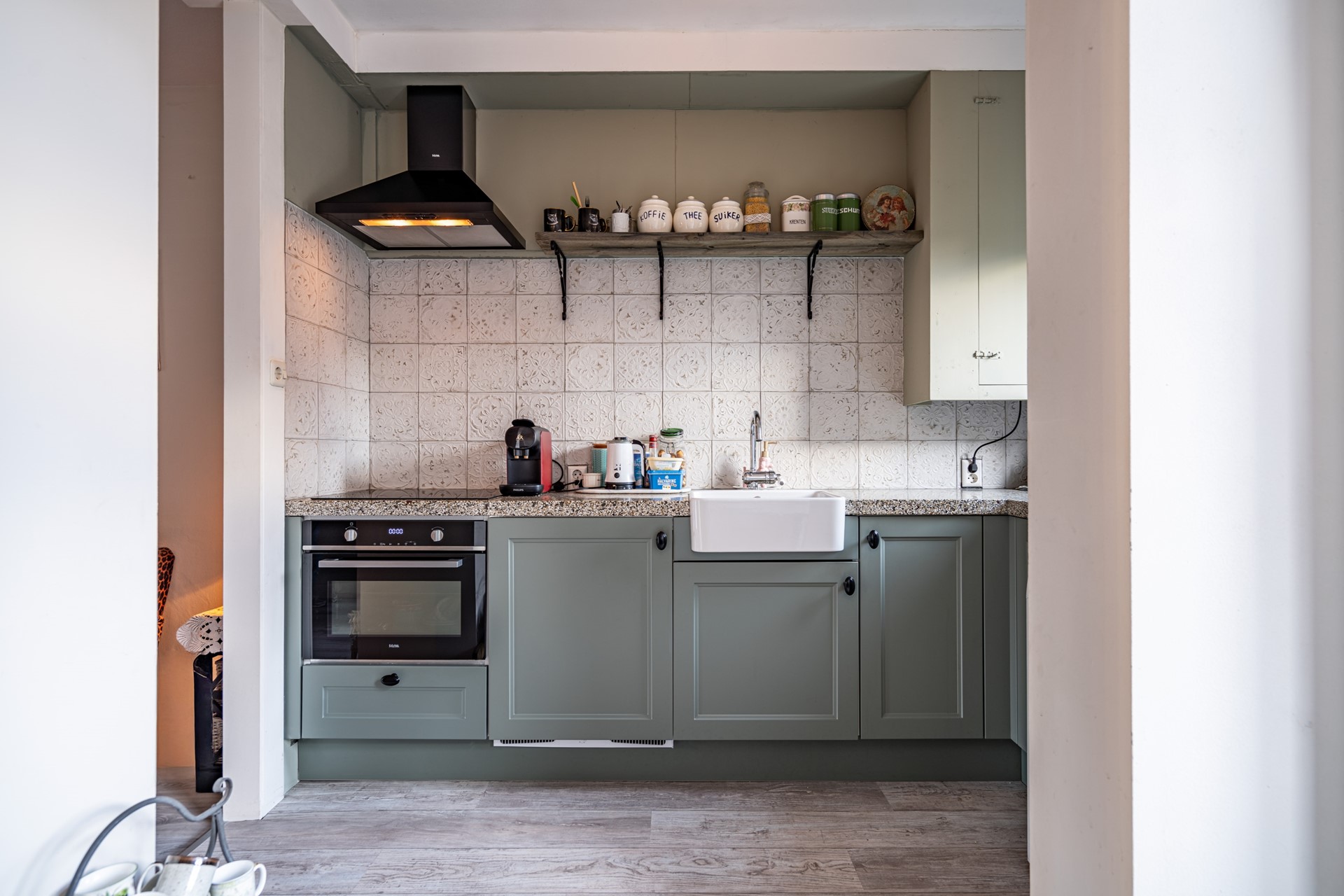 Aan de achterzijde bevindt zich de moderne open keuken (2023). Deze is stijlvol en praktisch ingericht en voorzien van diverse inbouwapparatuur, waaronder een inductiekookplaat, oven met magnetronfunctie en koelkast. Koken, borrelen en tafelen lopen hier naadloos in elkaar over.