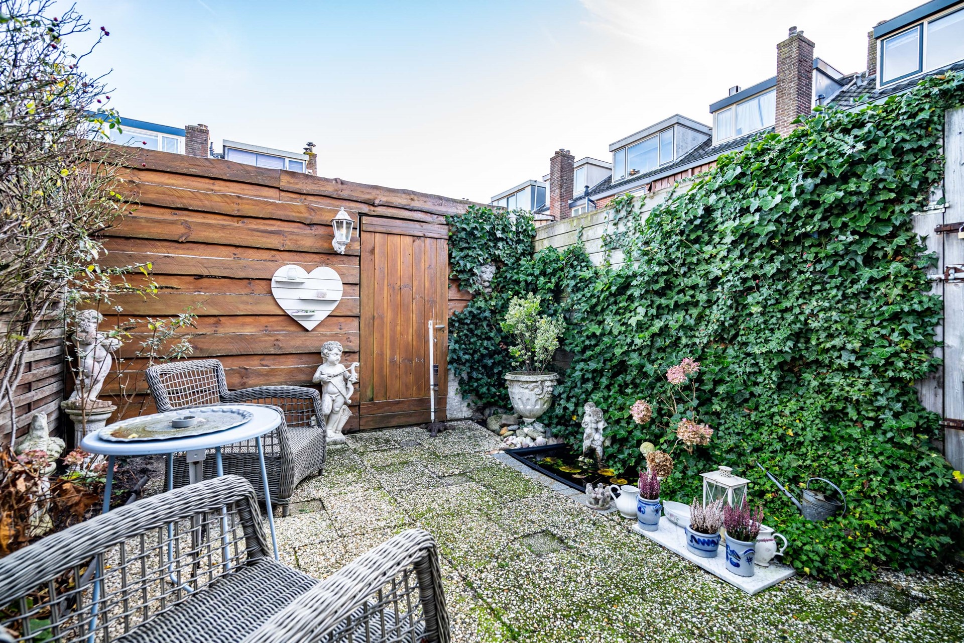De openslaande deuren verbinden de woonkamer met de achtertuin, gelegen op het oosten. Een heerlijke plek voor een ontspannen ontbijt in de zon of een rustige kop koffie. De tuin beschikt over een ruime berging met elektra, water en afvoer, én een handige achterom – ideaal voor fietsen en tuinspullen.