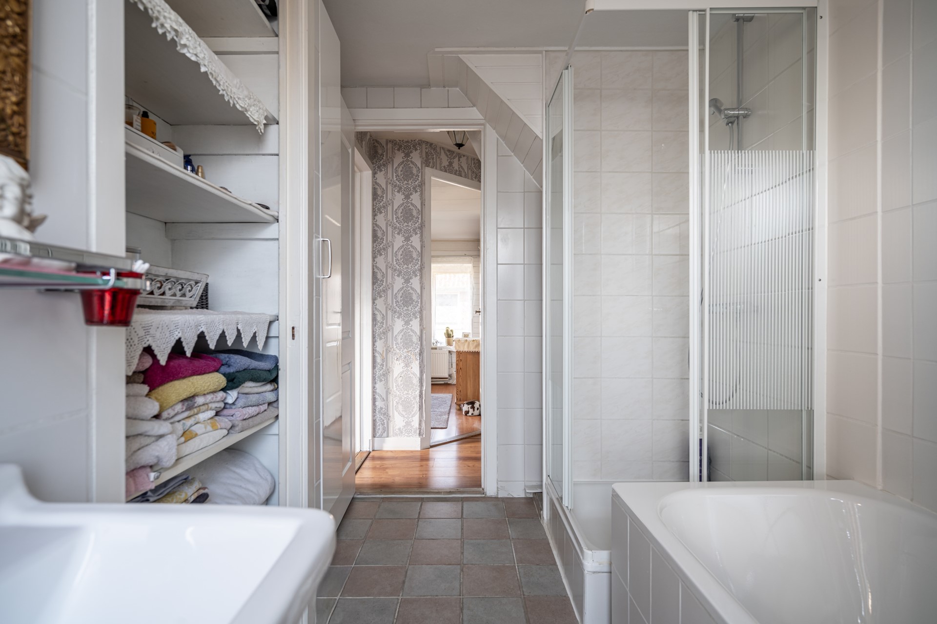 Op de eerste verdieping bevinden zich twee slaapkamers en de badkamer. De slaapkamer aan de voorzijde beschikt over een vaste kast; de tweede slaapkamer ligt aan de achterzijde. De badkamer is compleet uitgevoerd met ligbad, douche en wastafelmeubel en biedt toegang tot het dakterras – een fijne extra buitenruimte.