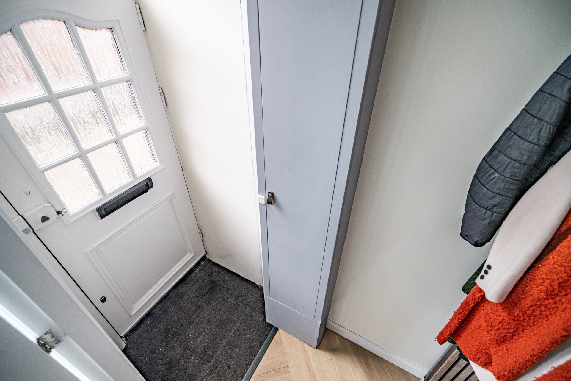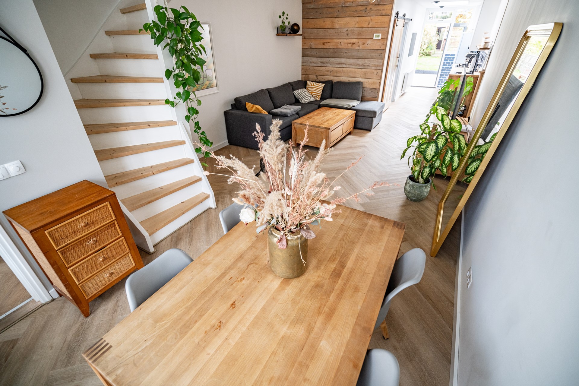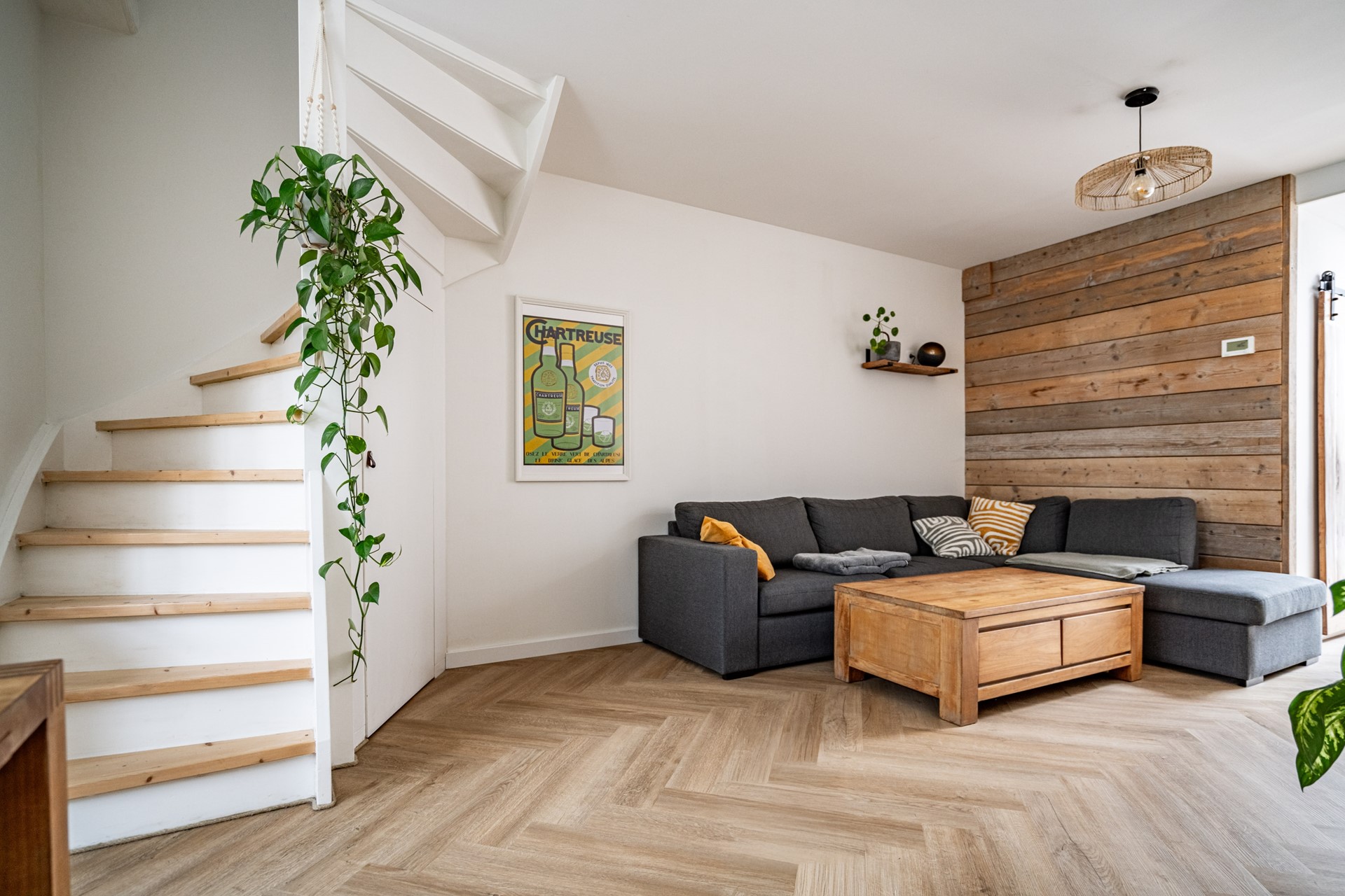 Via de entree komt u in de lichte hal met. De ruime, uitgebouwde woonkamer straalt charme uit: veel lichtinval door de grote raampartijen en dakramen in de uitbouw, een strakke afwerking en een moderne pvc-vloer. Slimme bergruimte bevindt zich onder de trap.