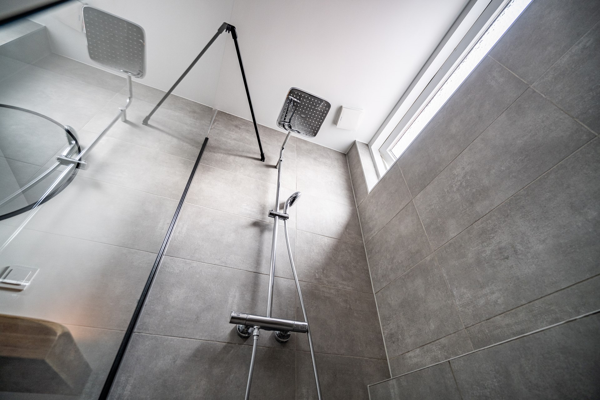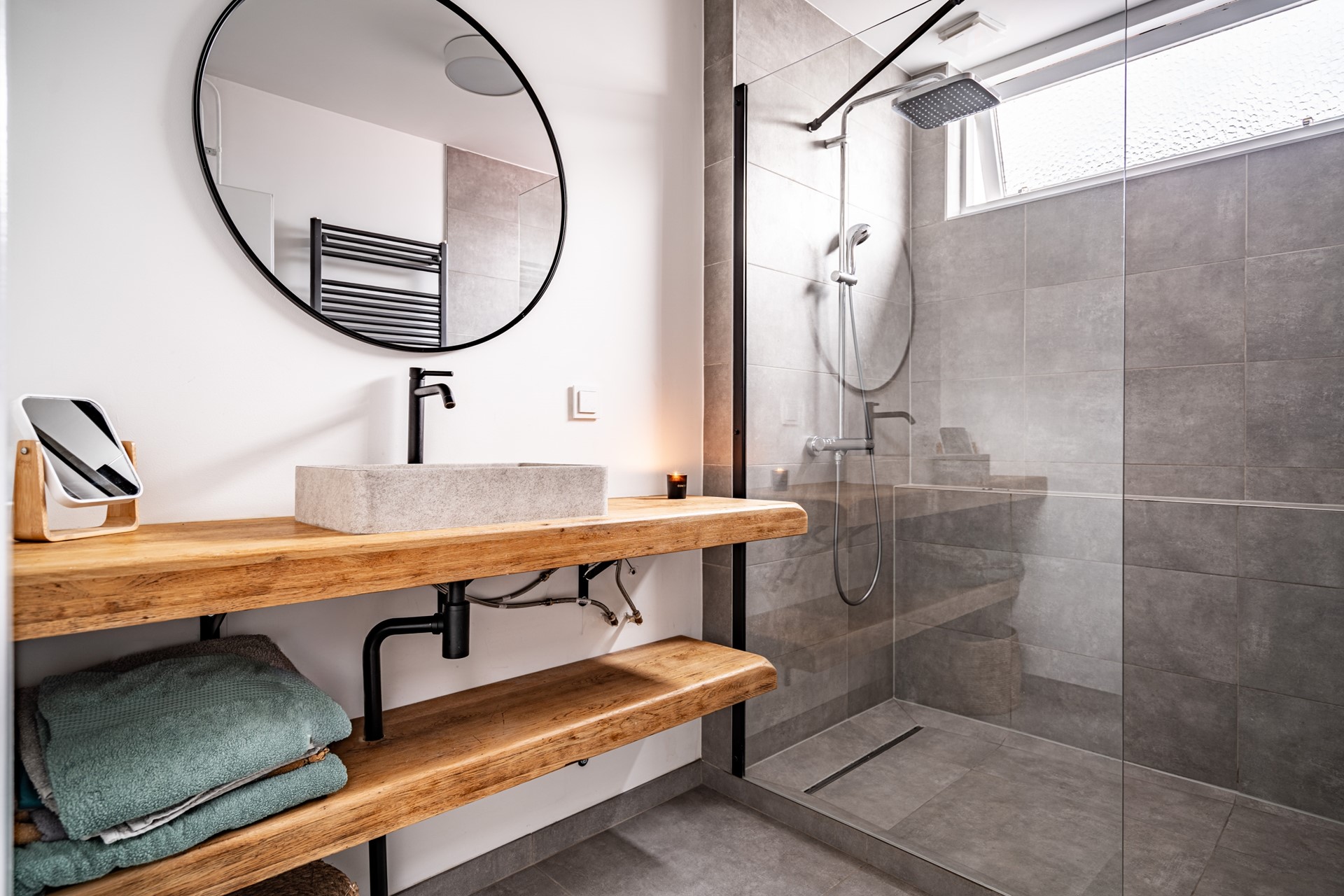 The ground floor also includes a beautifully renovated bathroom with a walk-in shower, vanity unit, radiator, and mechanical ventilation. There is also a separate, modern wall-hung toilet with a small sink.
