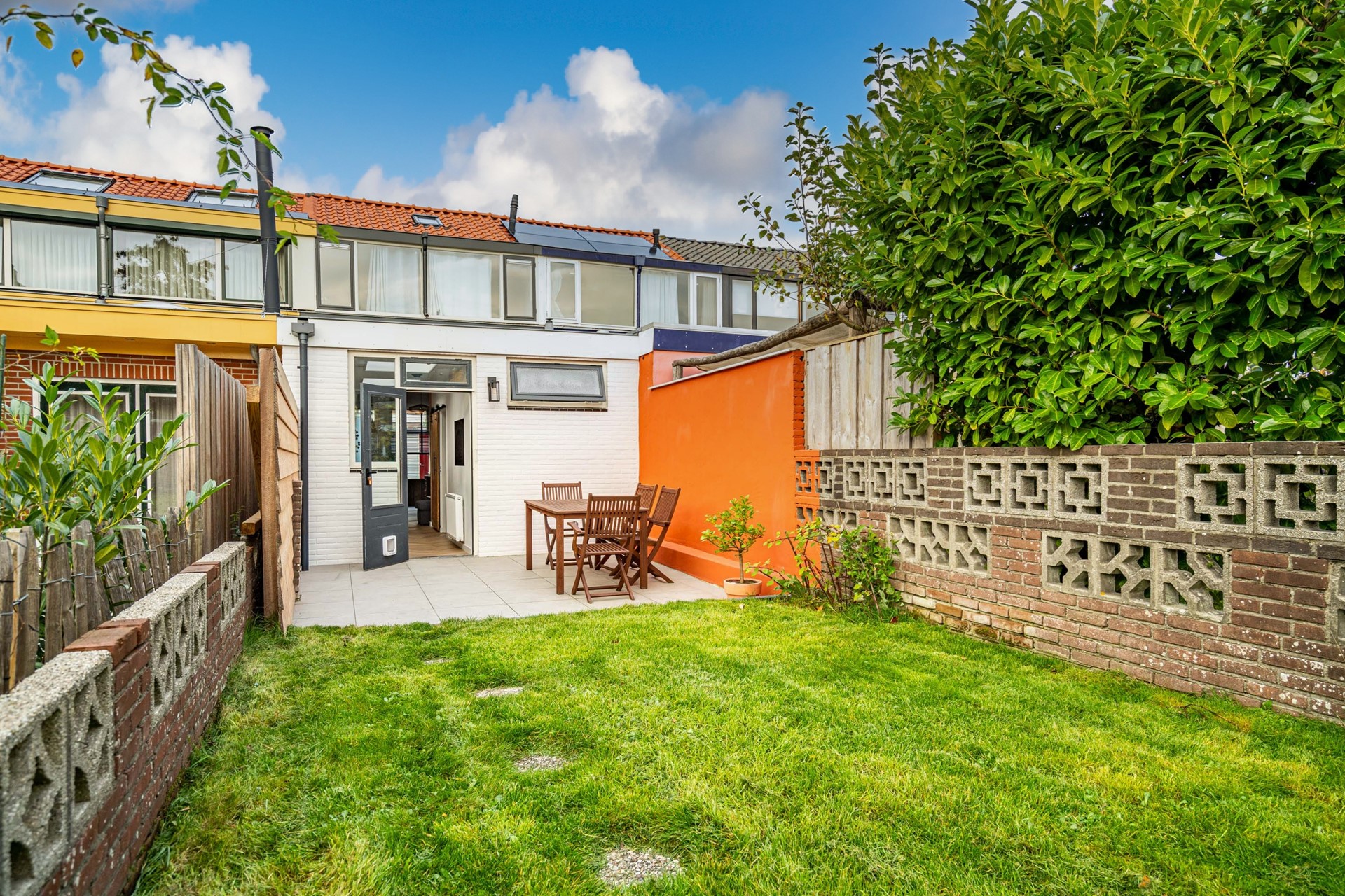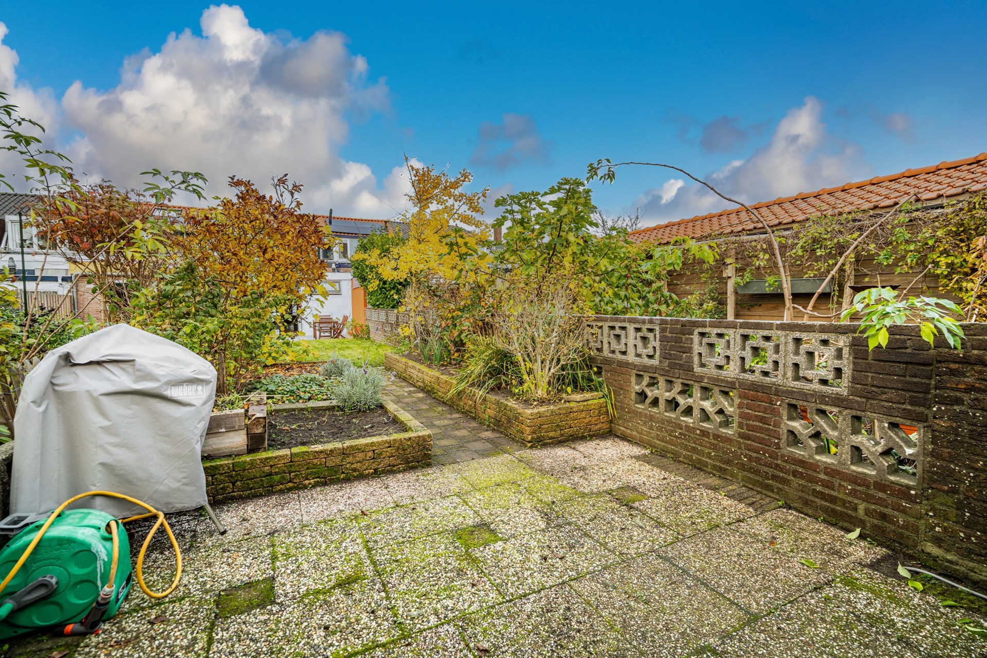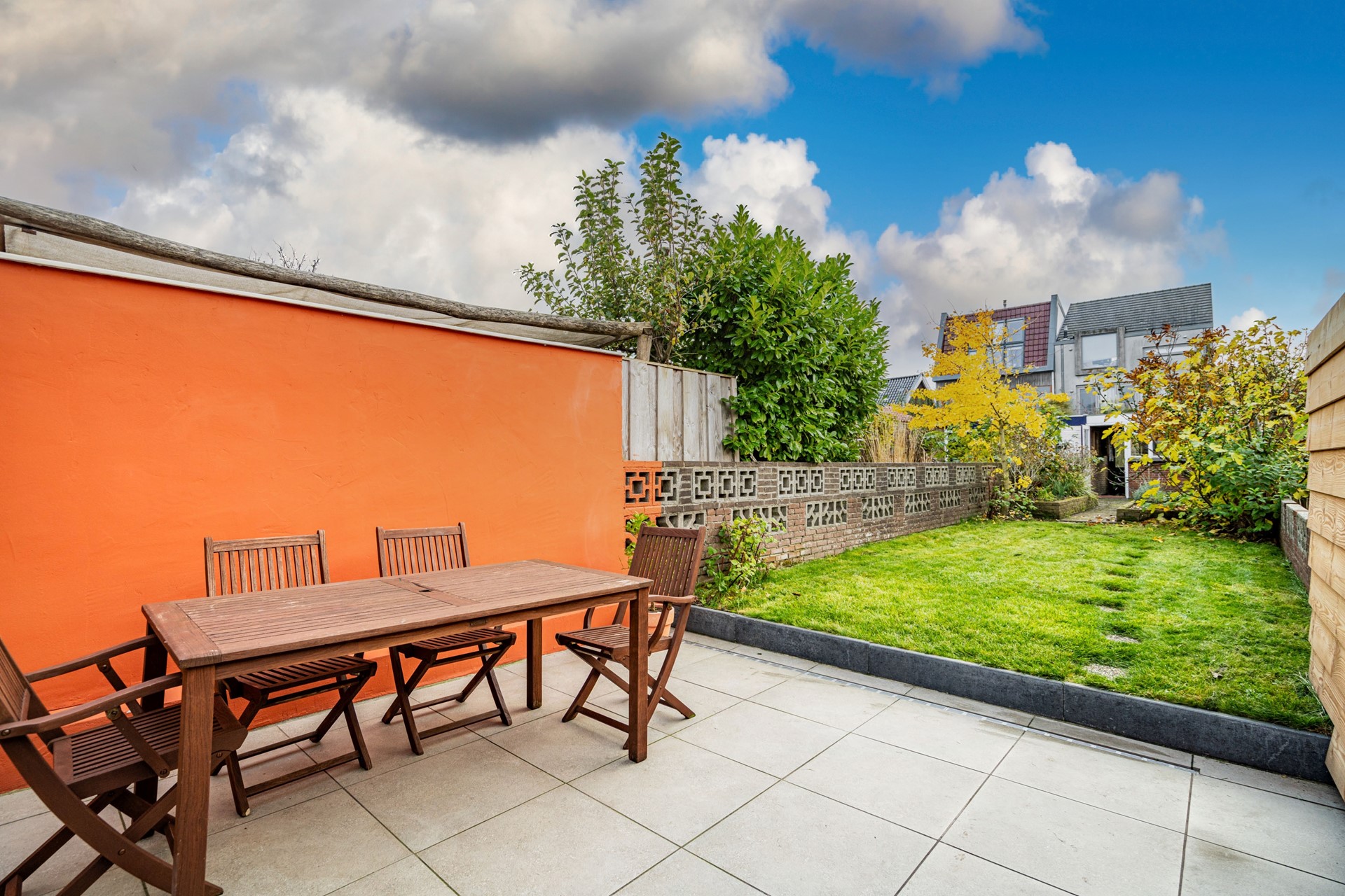 De zonnige achtertuin biedt een heerlijke mix van groen, een comfortabel terras en een ruime berging aan de achterzijde – een ideale plek om te ontspannen op lange zomerdagen of te genieten van gezellige avonden buiten.