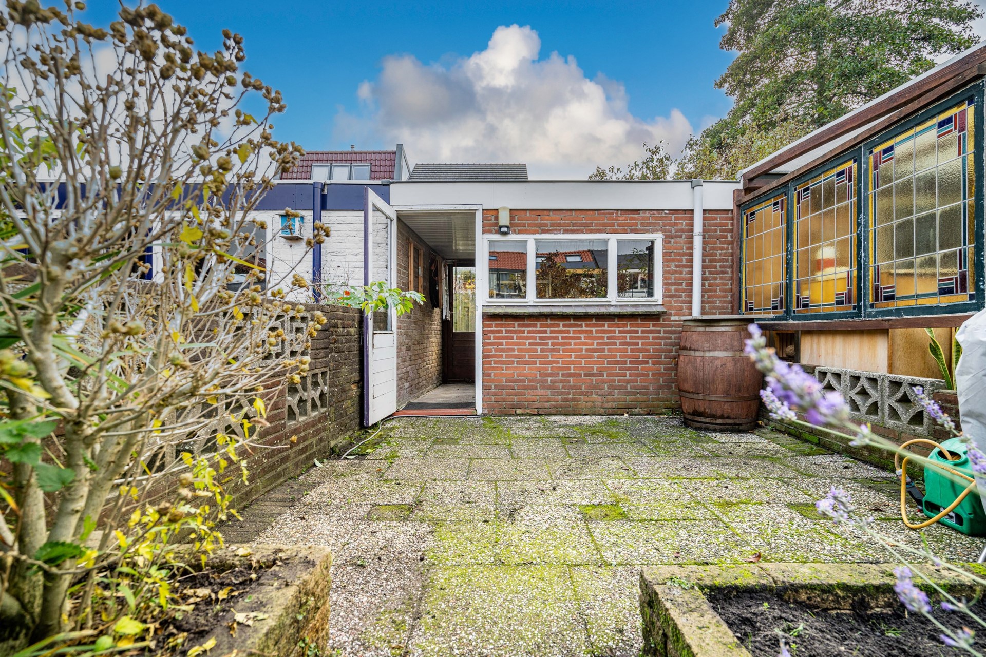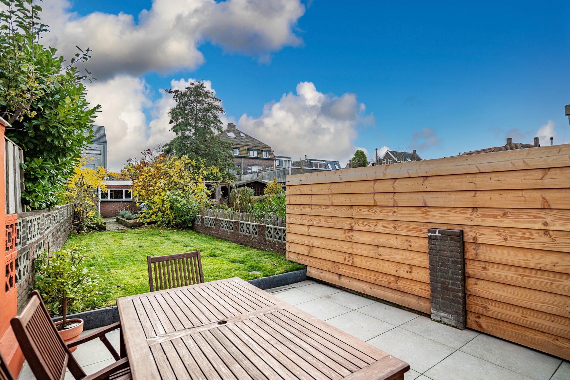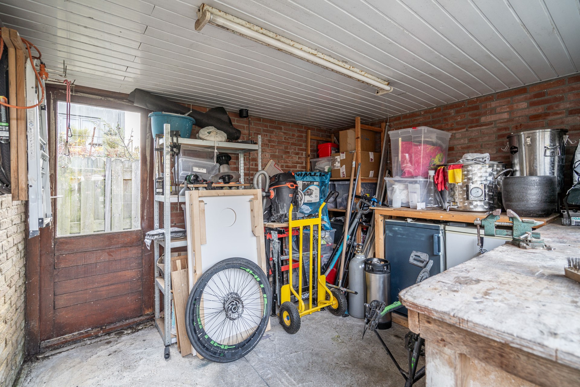 De zonnige achtertuin biedt een heerlijke mix van groen, een comfortabel terras en een ruime berging aan de achterzijde – een ideale plek om te ontspannen op lange zomerdagen of te genieten van gezellige avonden buiten.
