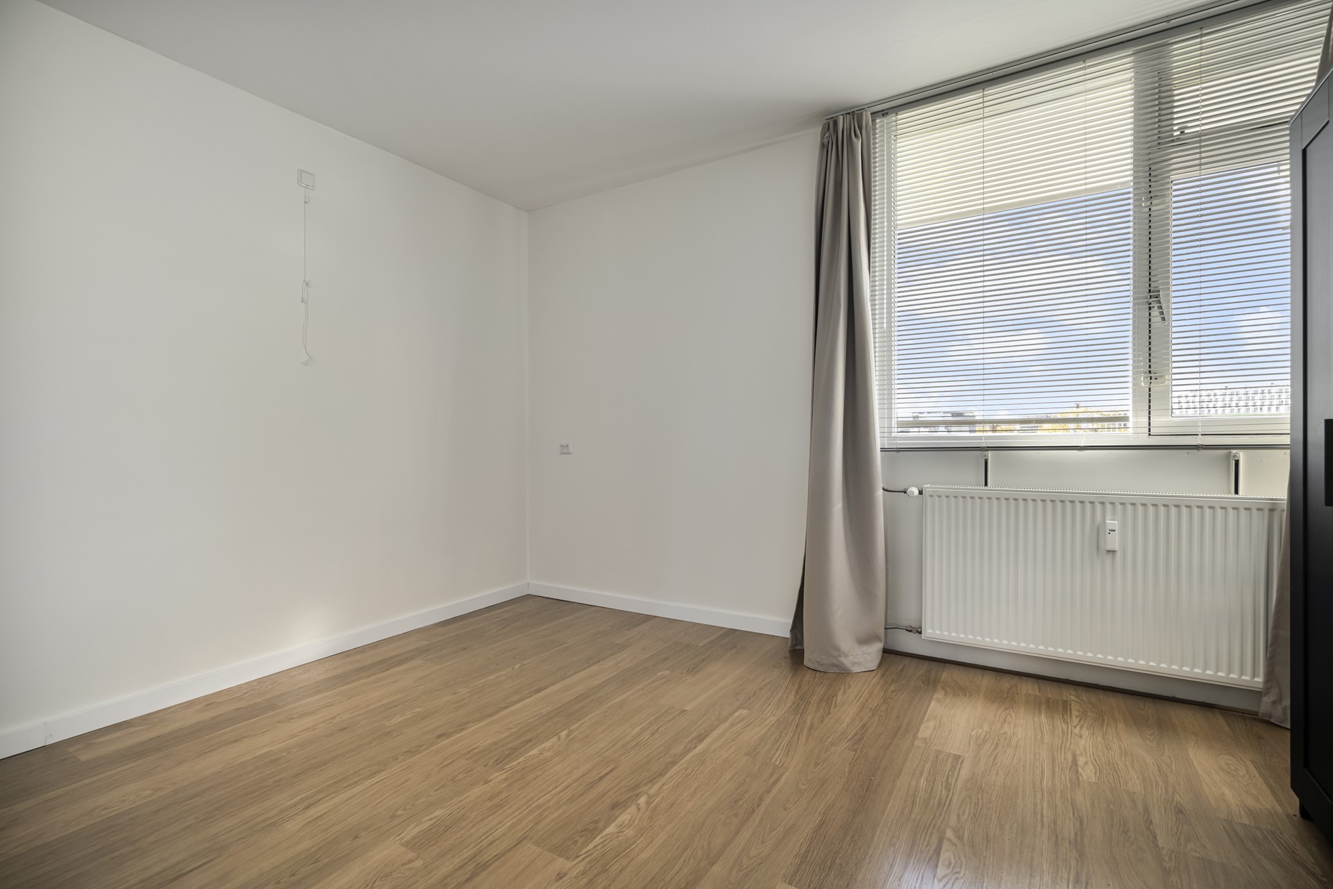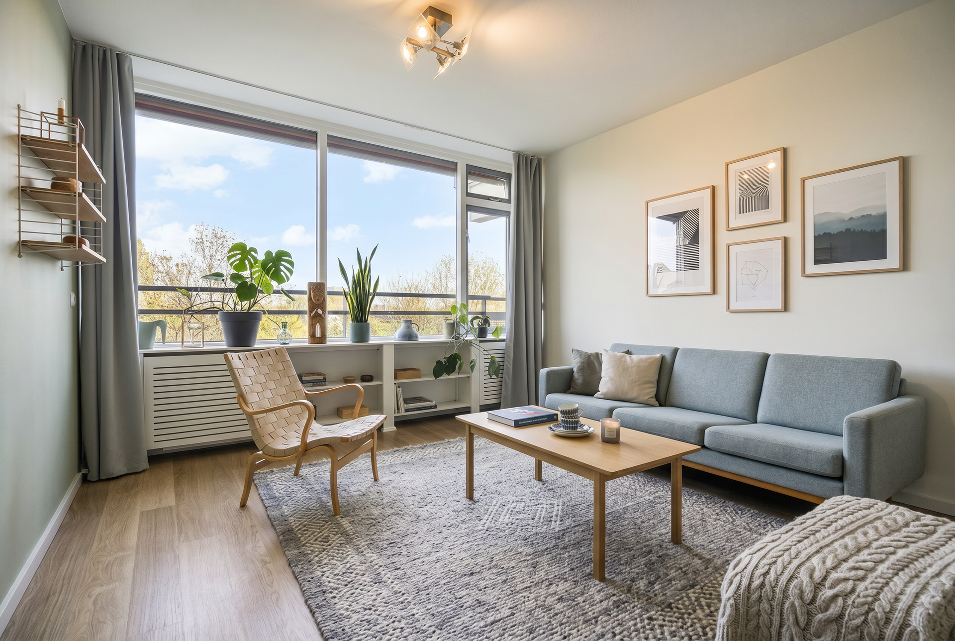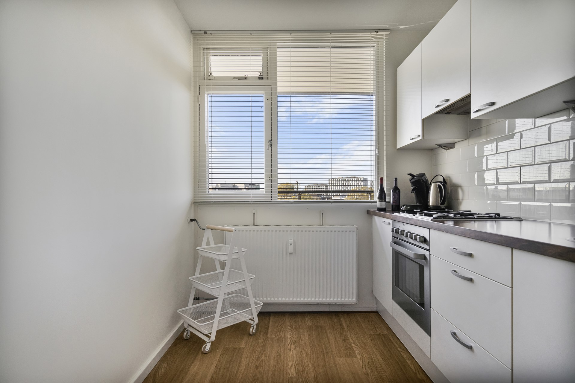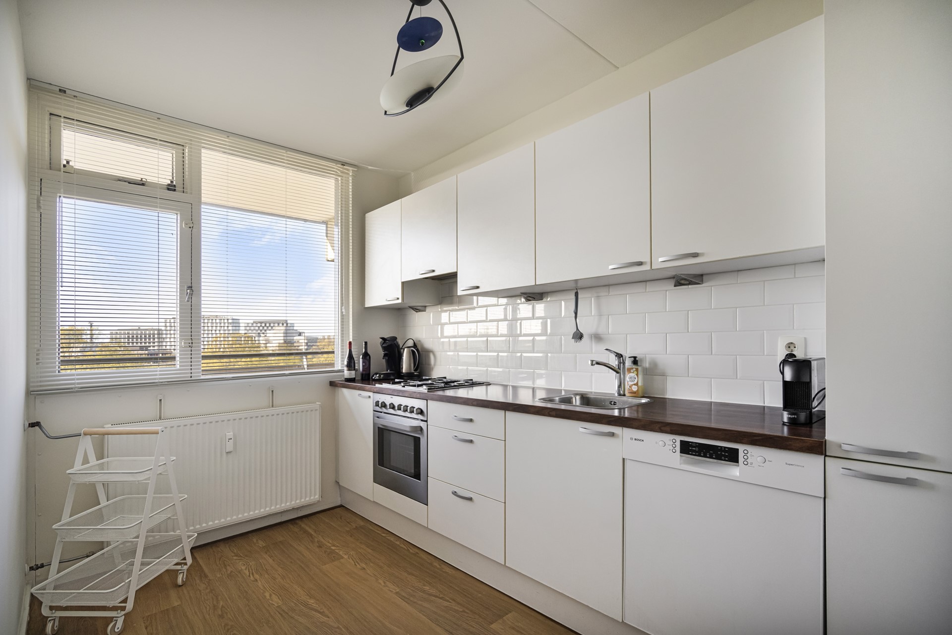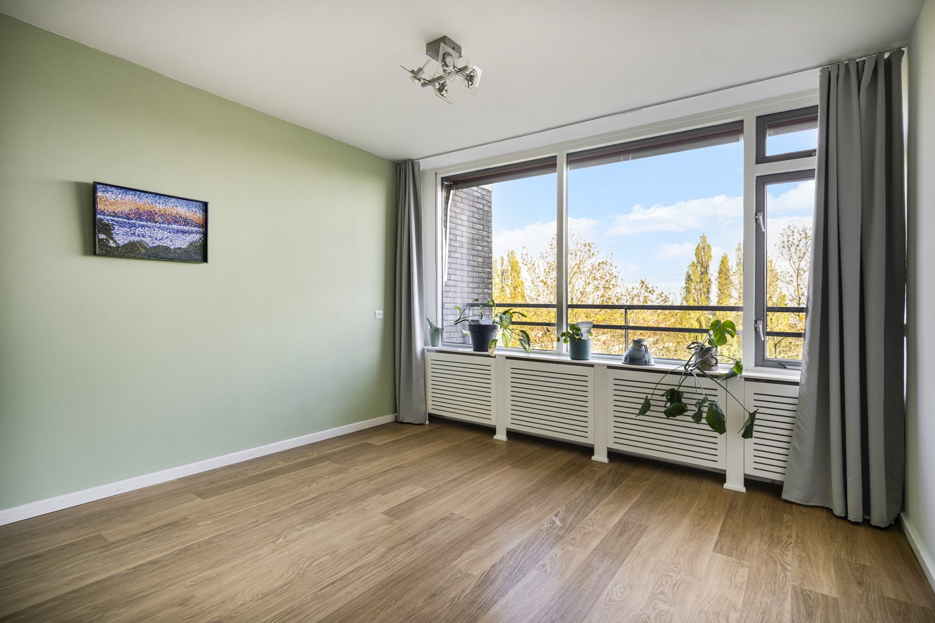 The spacious living room forms the heart of the home. Large windows frame panoramic views over Leiden and the adjacent park, creating a seamless connection between indoor living and the outdoors. Whether you’re unwinding after a busy day or entertaining guests, this is a space designed for both relaxation and enjoyment.