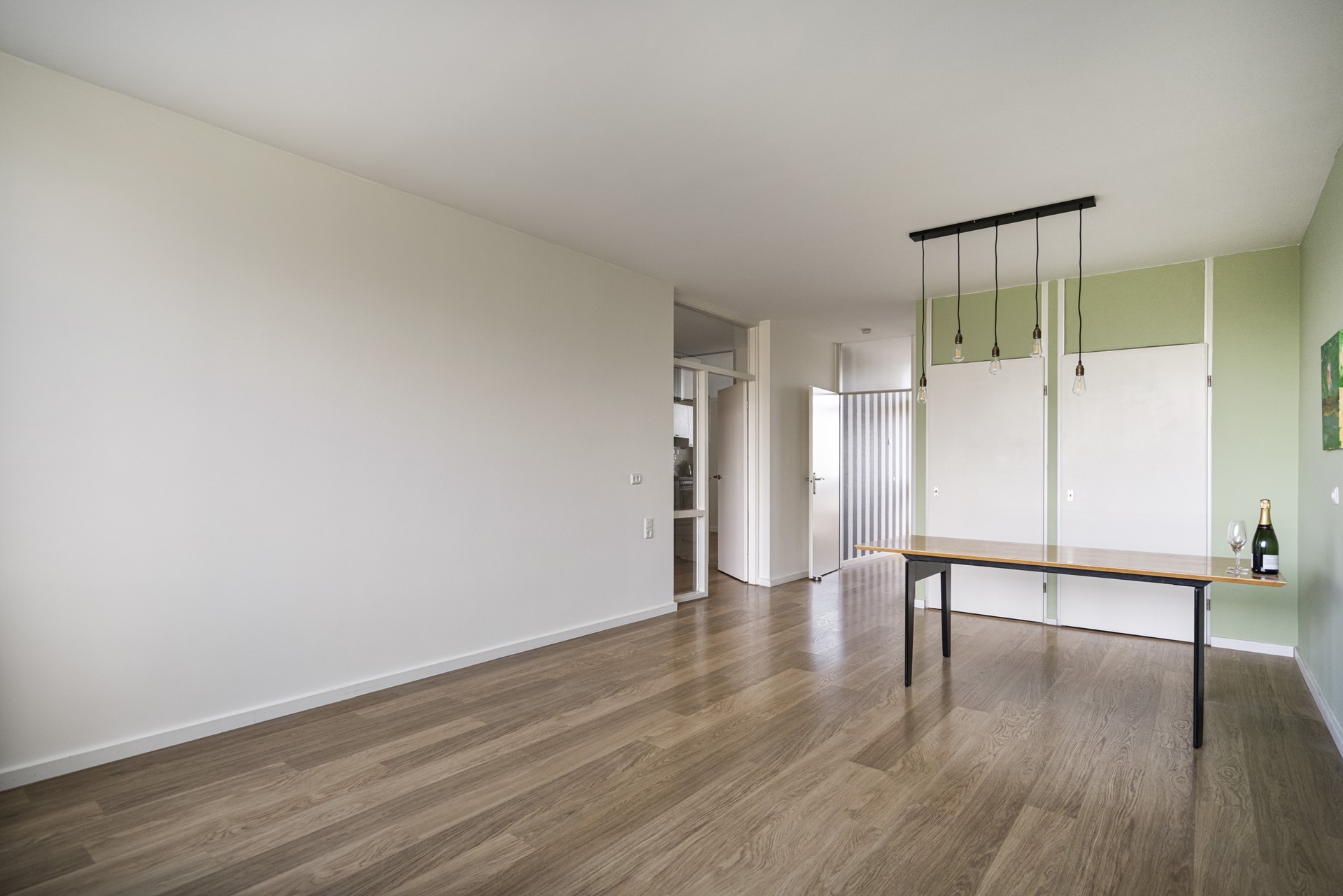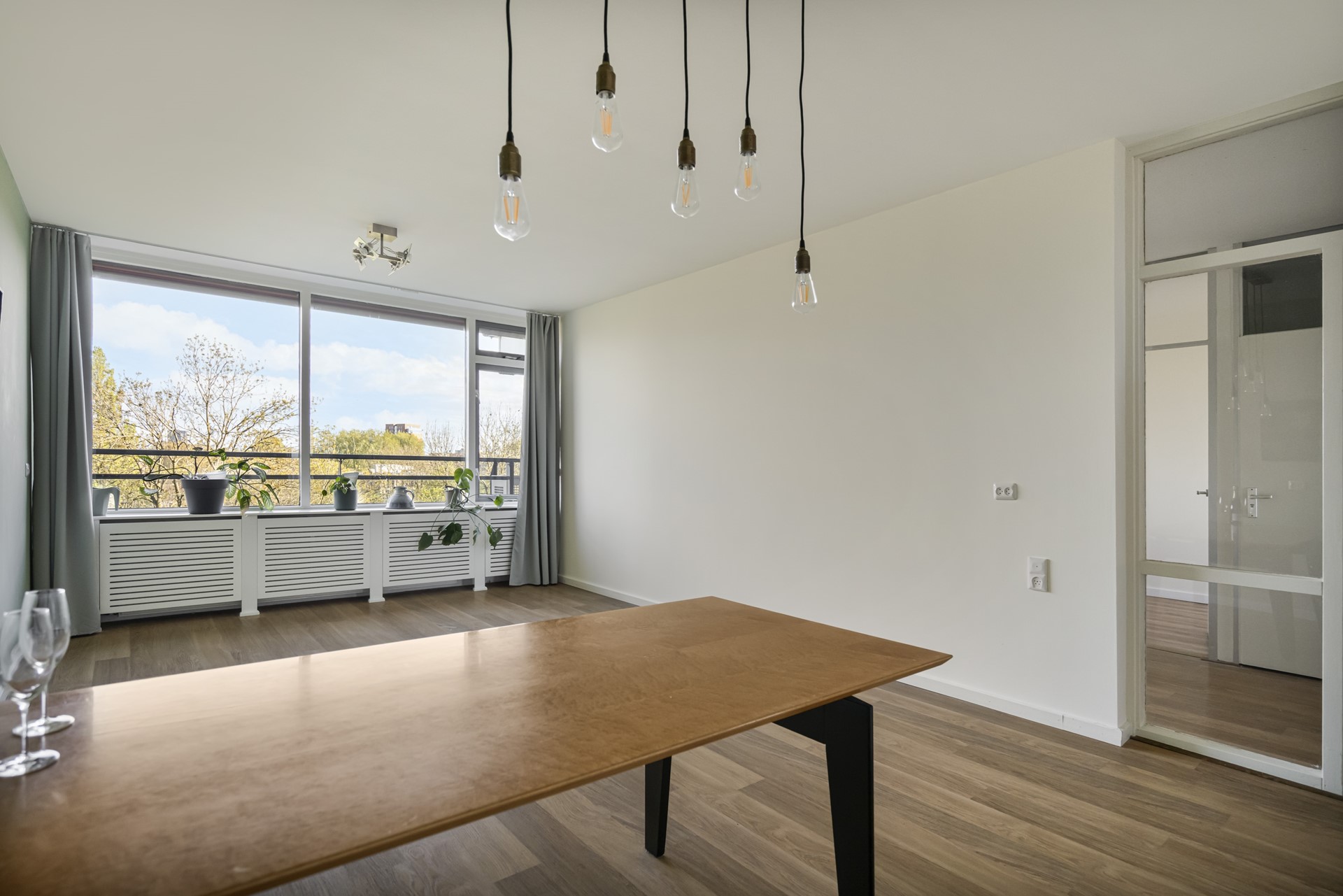 De woonkamer is zonder twijfel het hart van de woning. Dankzij de grote raampartijen valt het daglicht rijkelijk naar binnen en geniet u van een prachtig uitzicht over Leiden en het naastgelegen park. Hier komt rust en levendigheid samen – een fijne plek om te ontspannen na een lange dag of om gasten te ontvangen.